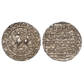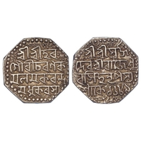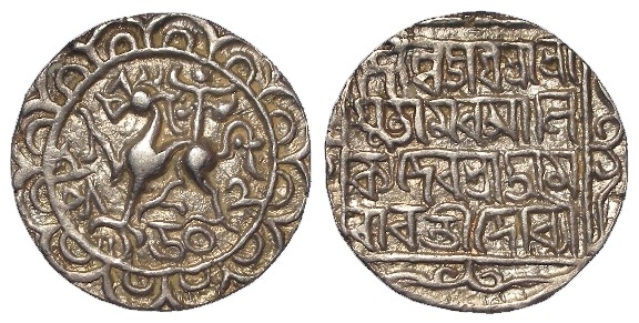 India, Kings of Tripura, Amara Manikya (1577-1586) silver Tanka dated SE1502 (AD 1580). Obv: Lion l., date below, border of double arches. / Rev: Four line legend citing the King and Queen Amaravati. R&B #162-7. 10.64g. EF.