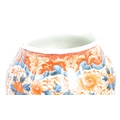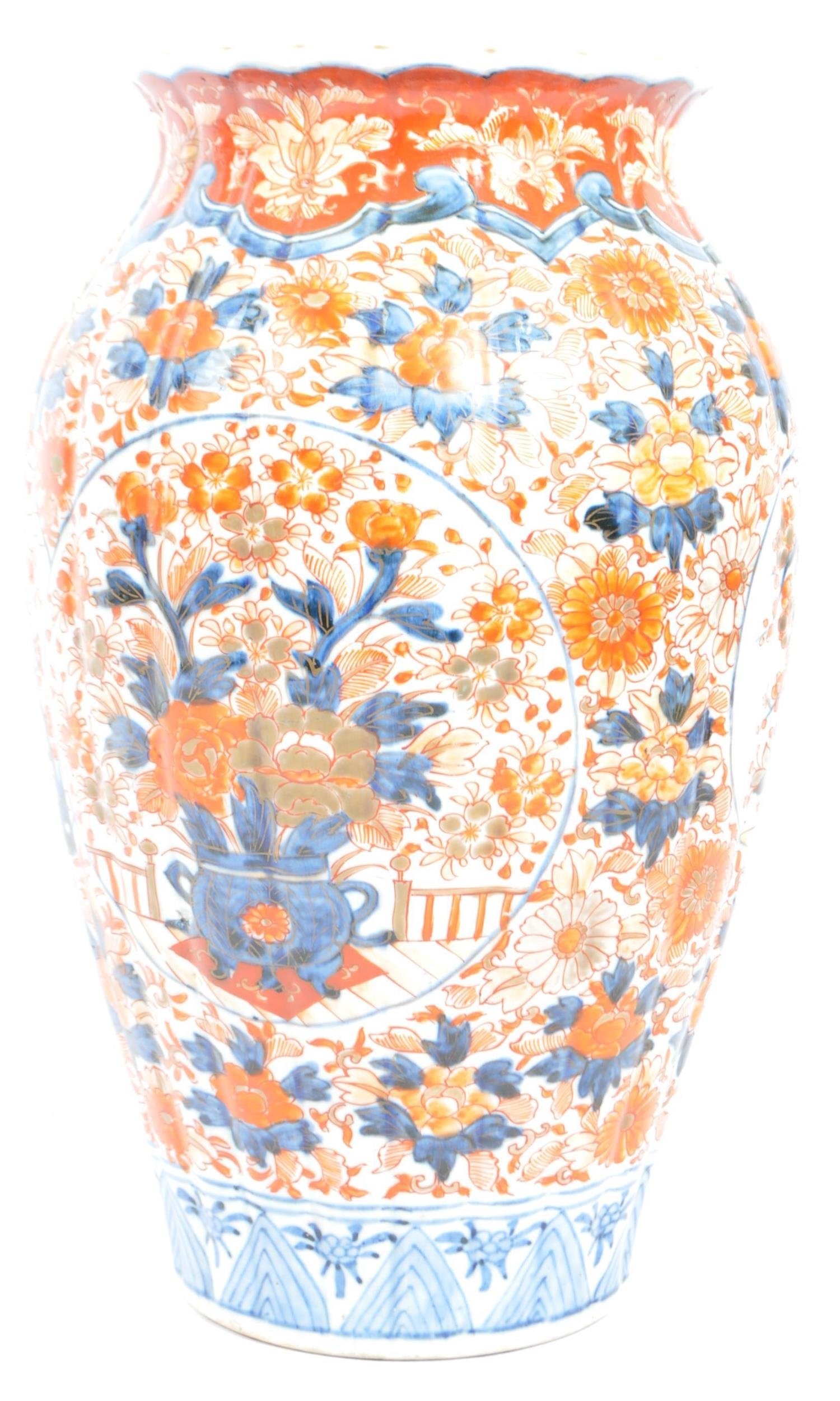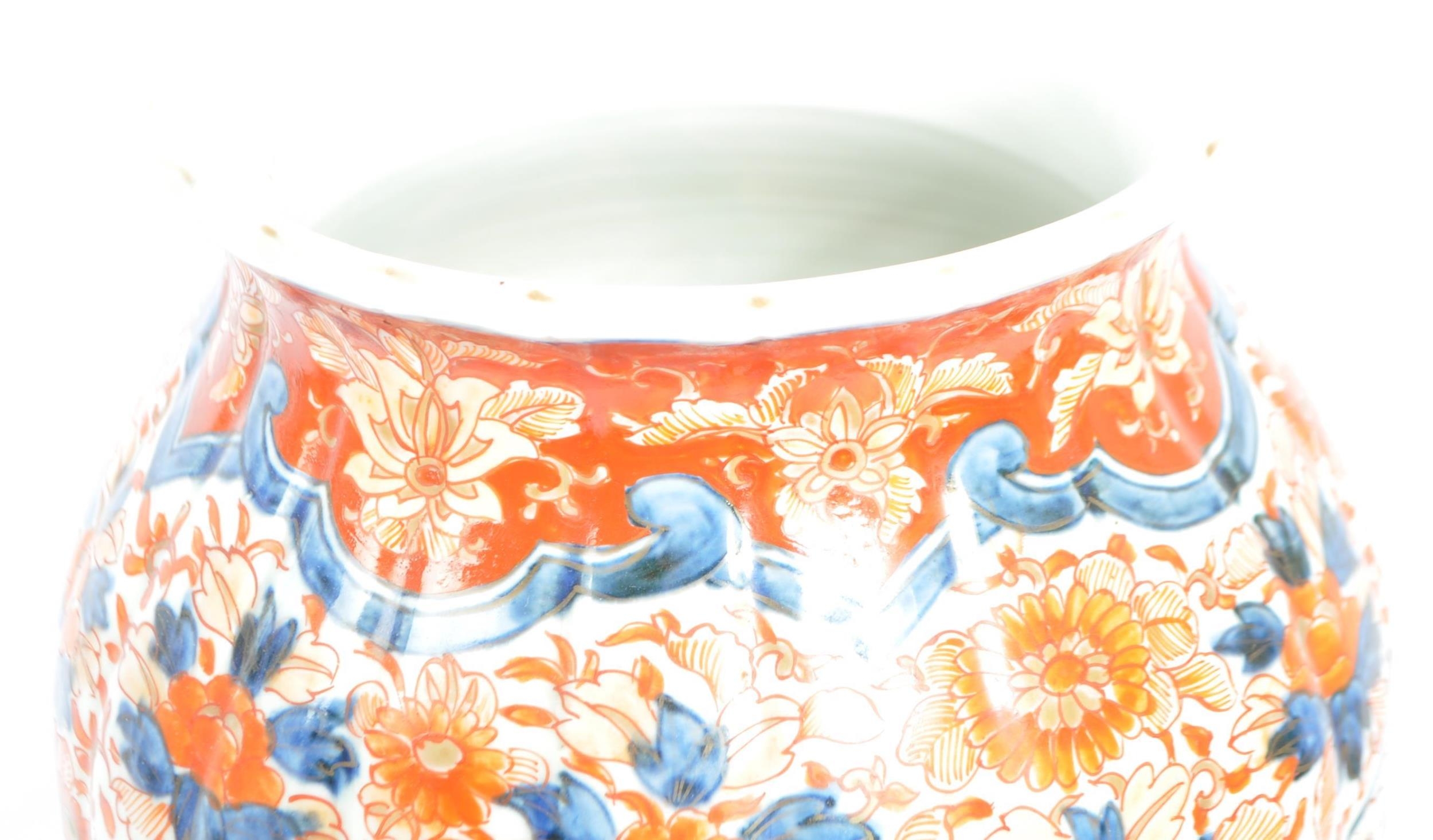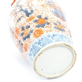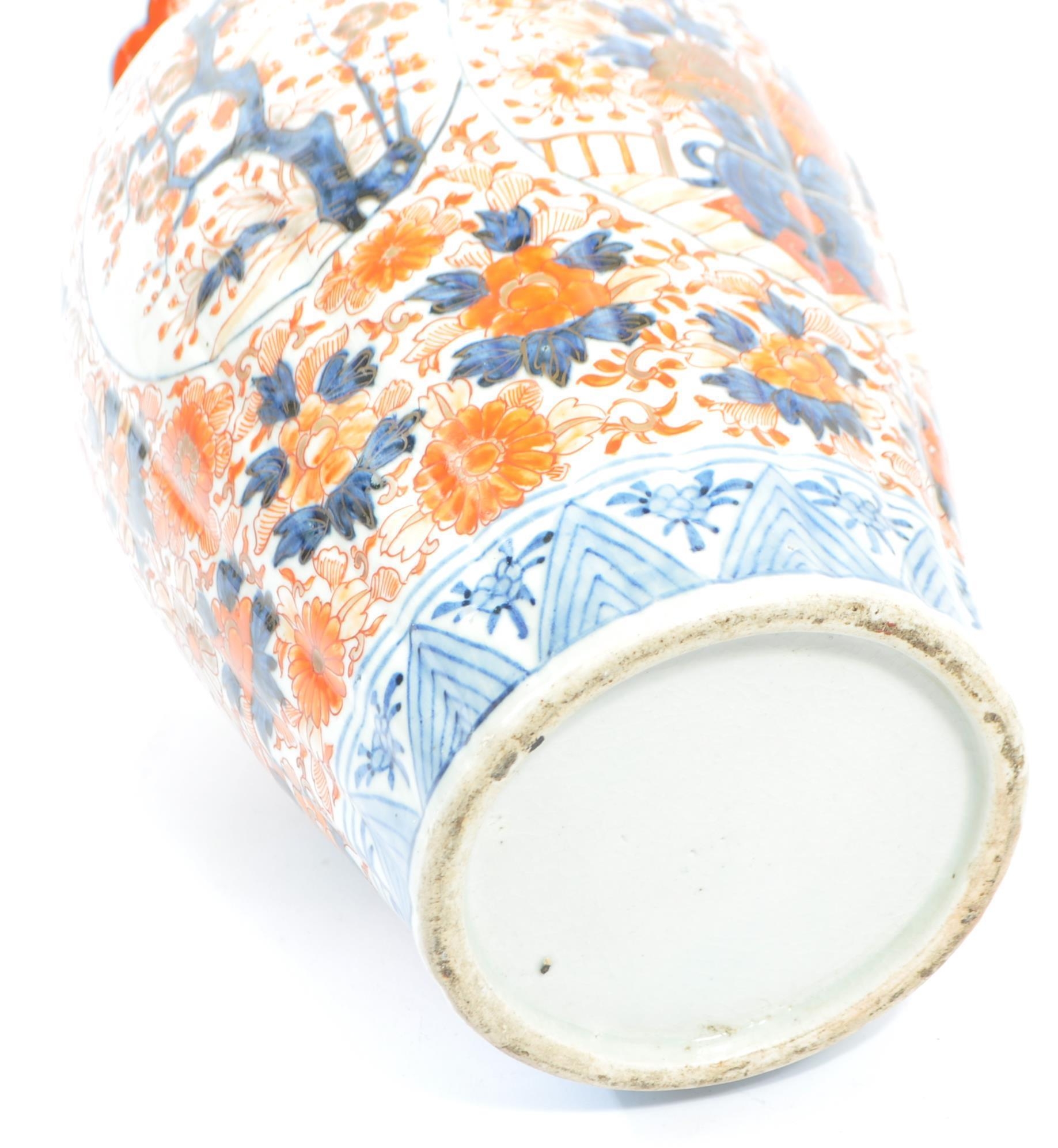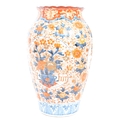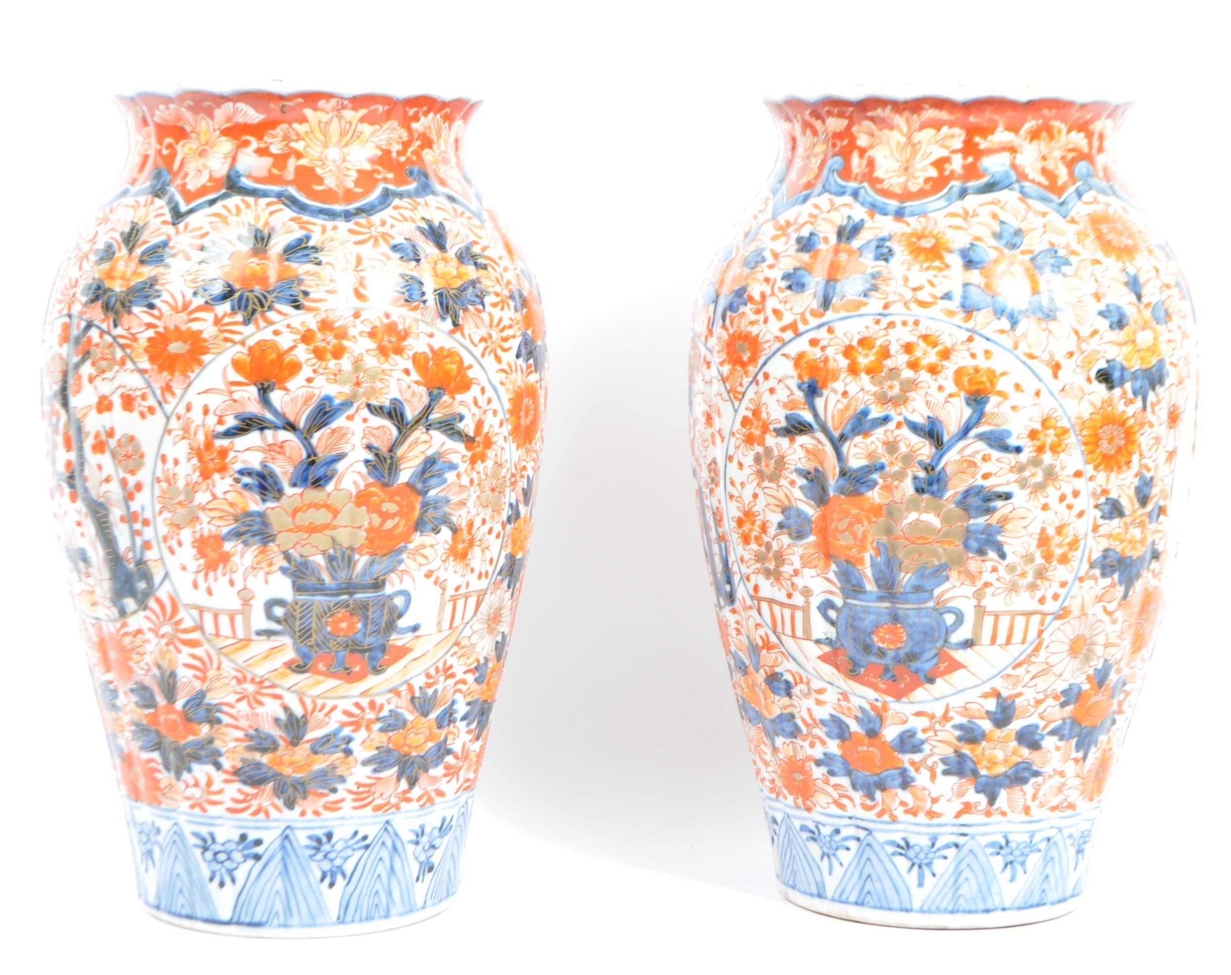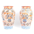 A pair of late 19th century Japanese Imari urn vases. The vases featuring blue and red floral motifs and patterns with a central bouquet / tree display. Some light damage & restoration noticeable to the rims. Unmarked to base. Measures approx. 33cm tall.