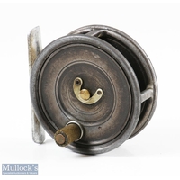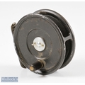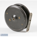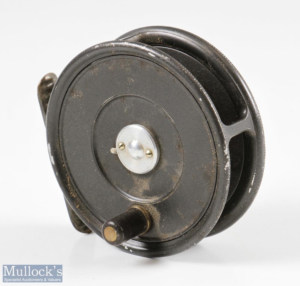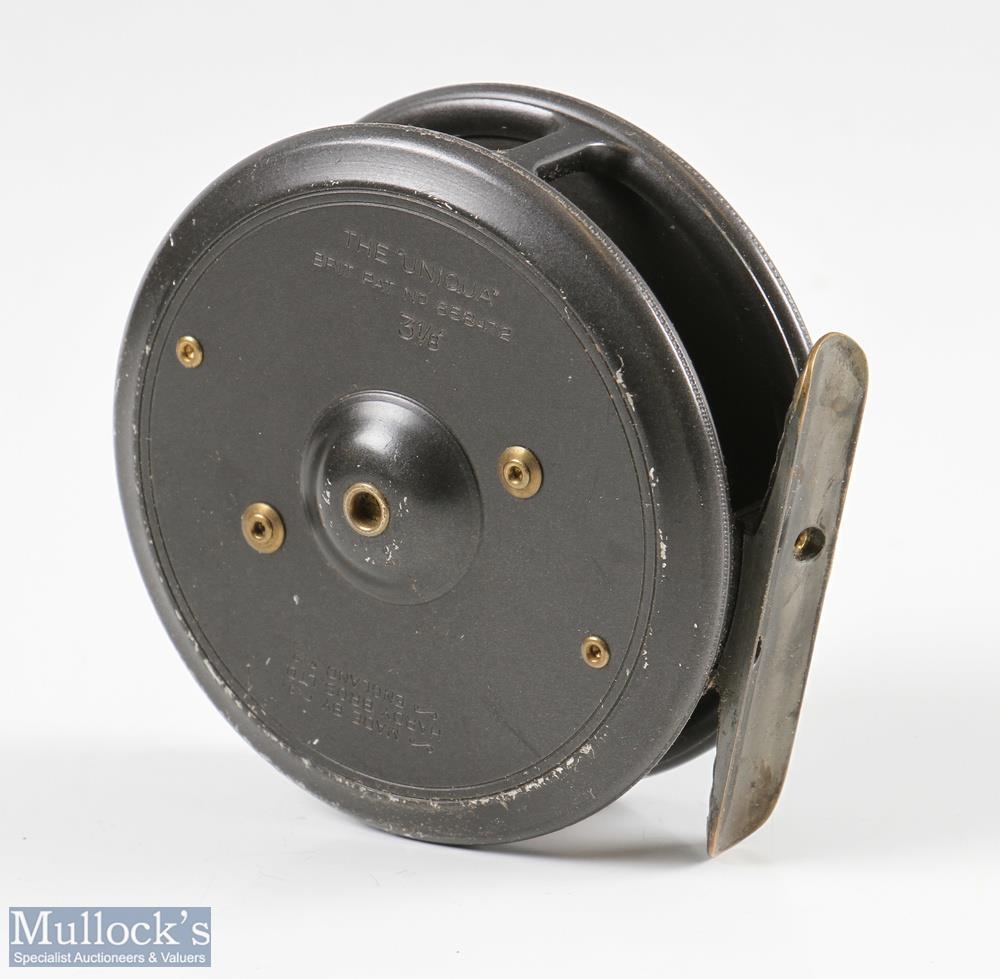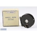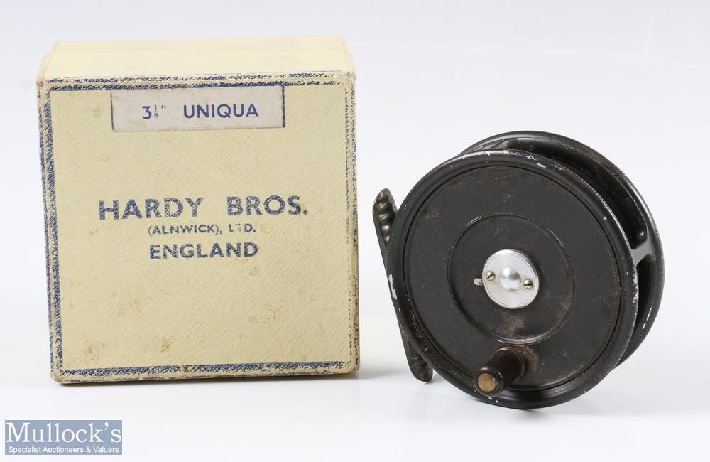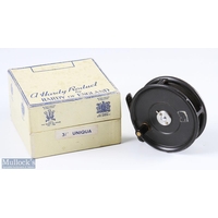 Hardy Bros Uniqua 3 1/8" alloy trout fly reel with brass ribbed foot, quick release latch, black handle, light surface wear, in maker's card box