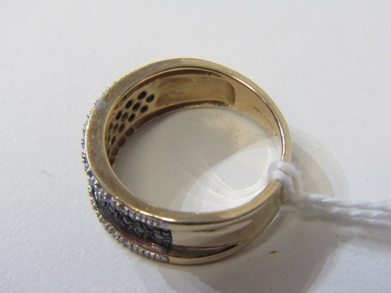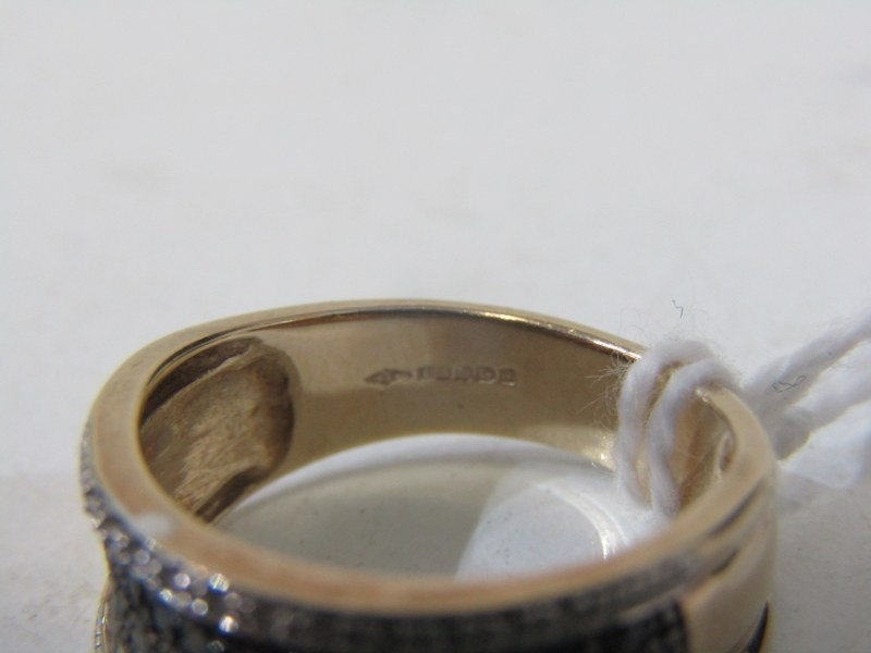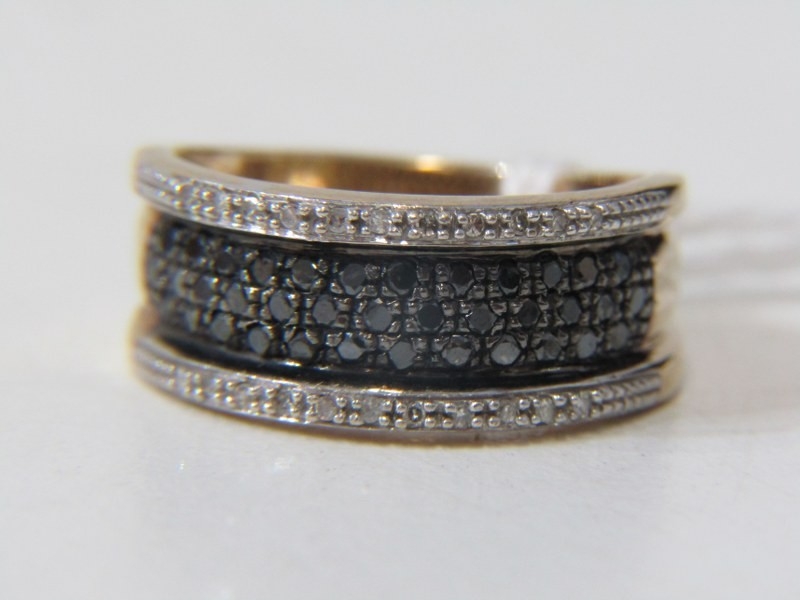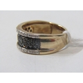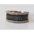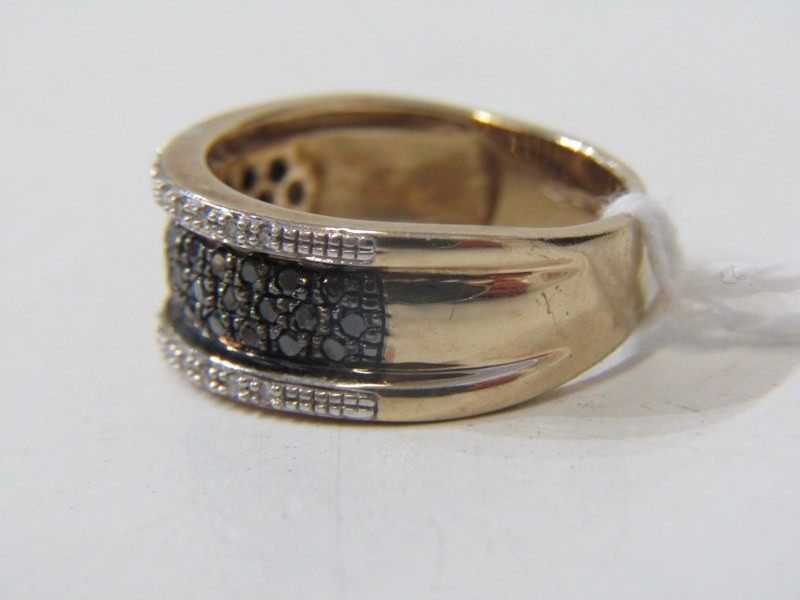 BLACK & WHITE DIAMOND CLUSTER RING, heavy 9ct yellow gold ring set a central plaque of black diamonds, with lines white diamonds to the outer, size Q, 5.6 grams