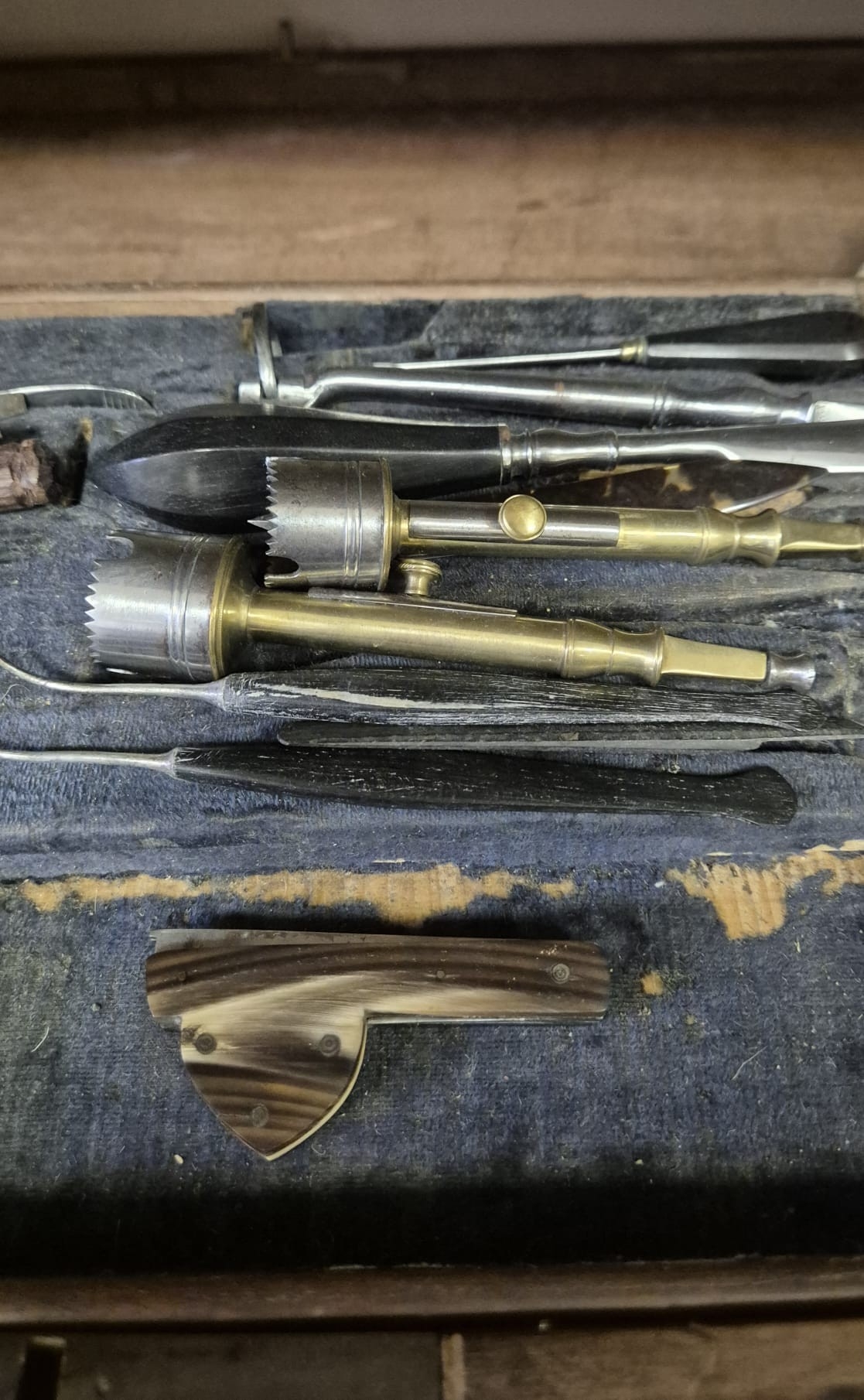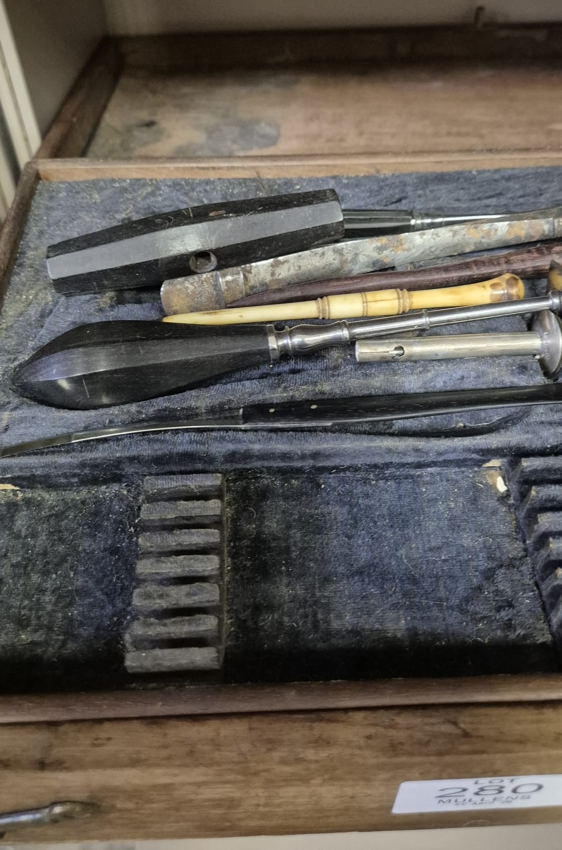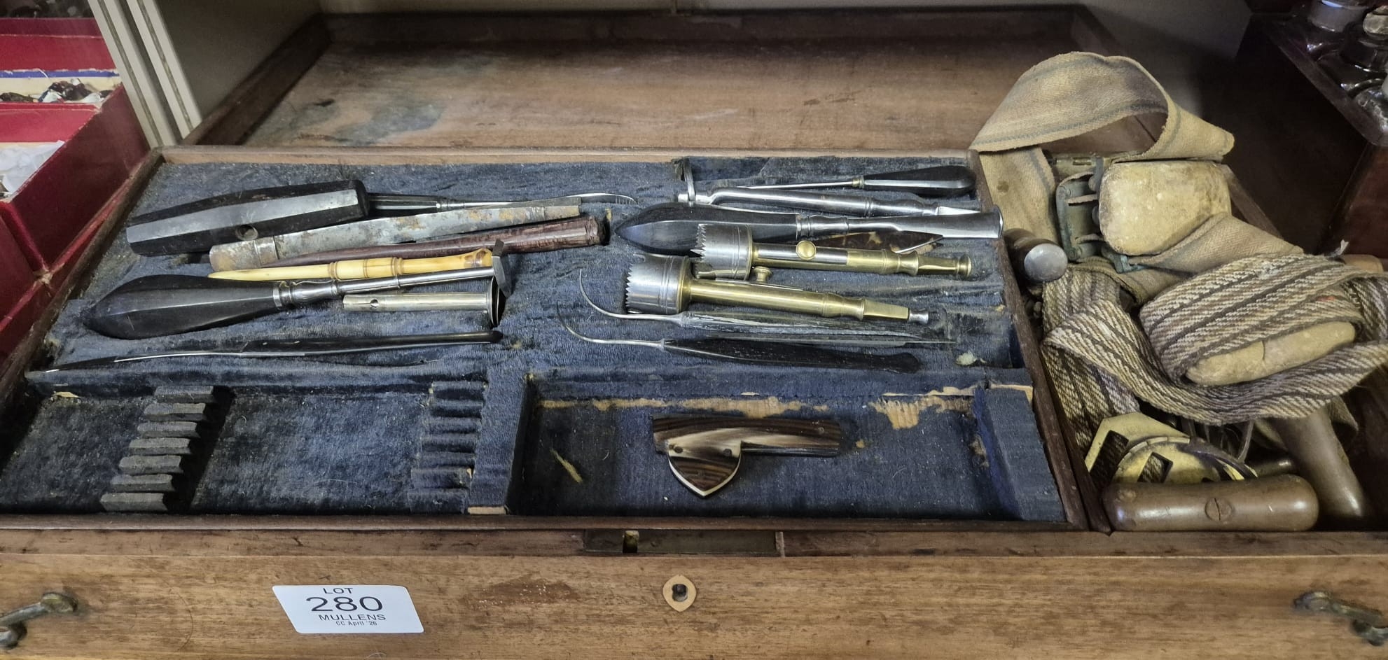 AN ANTIQUE CASED FIELD SURGEONS SET to include a miscellaneo...