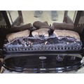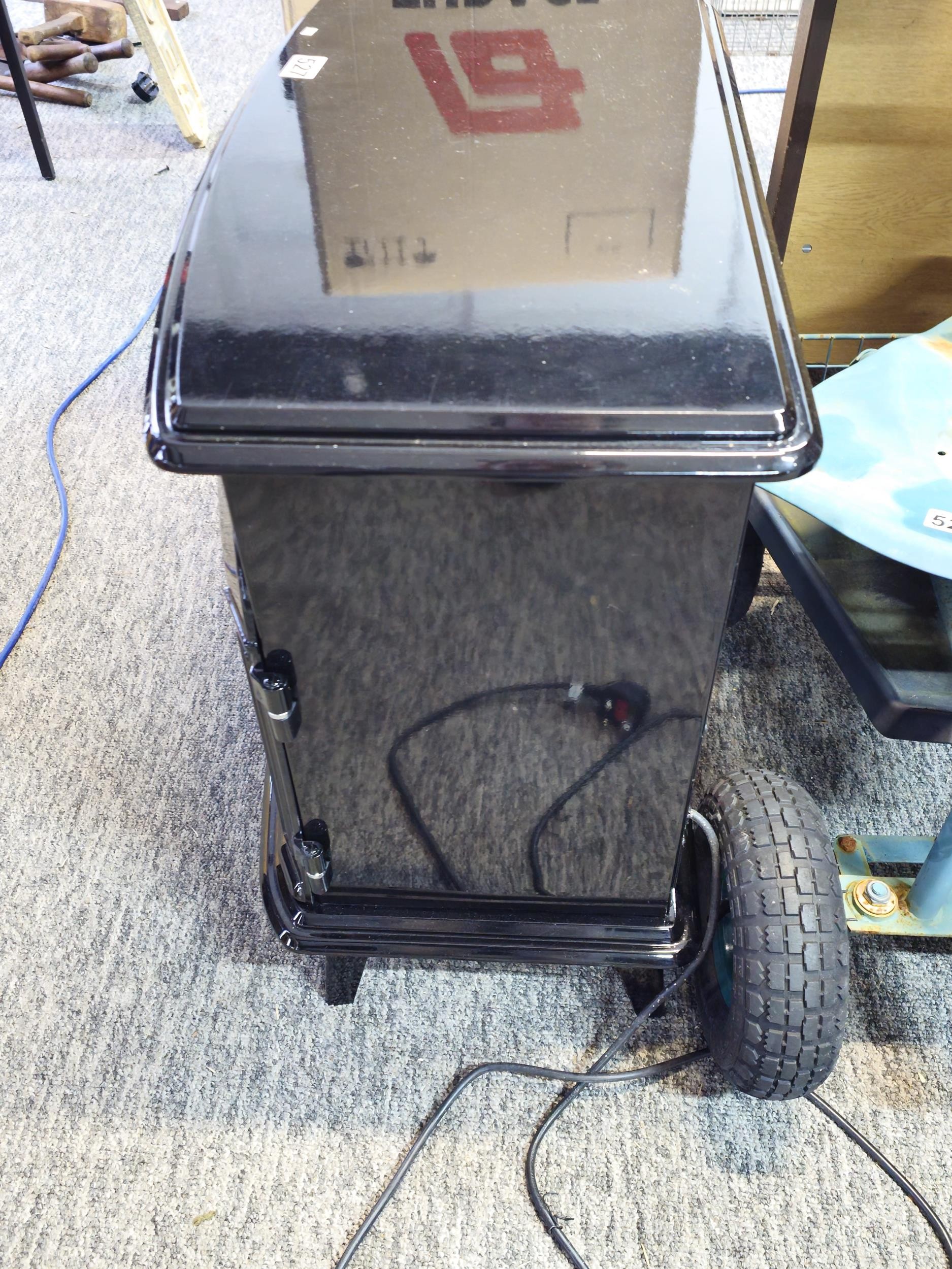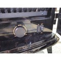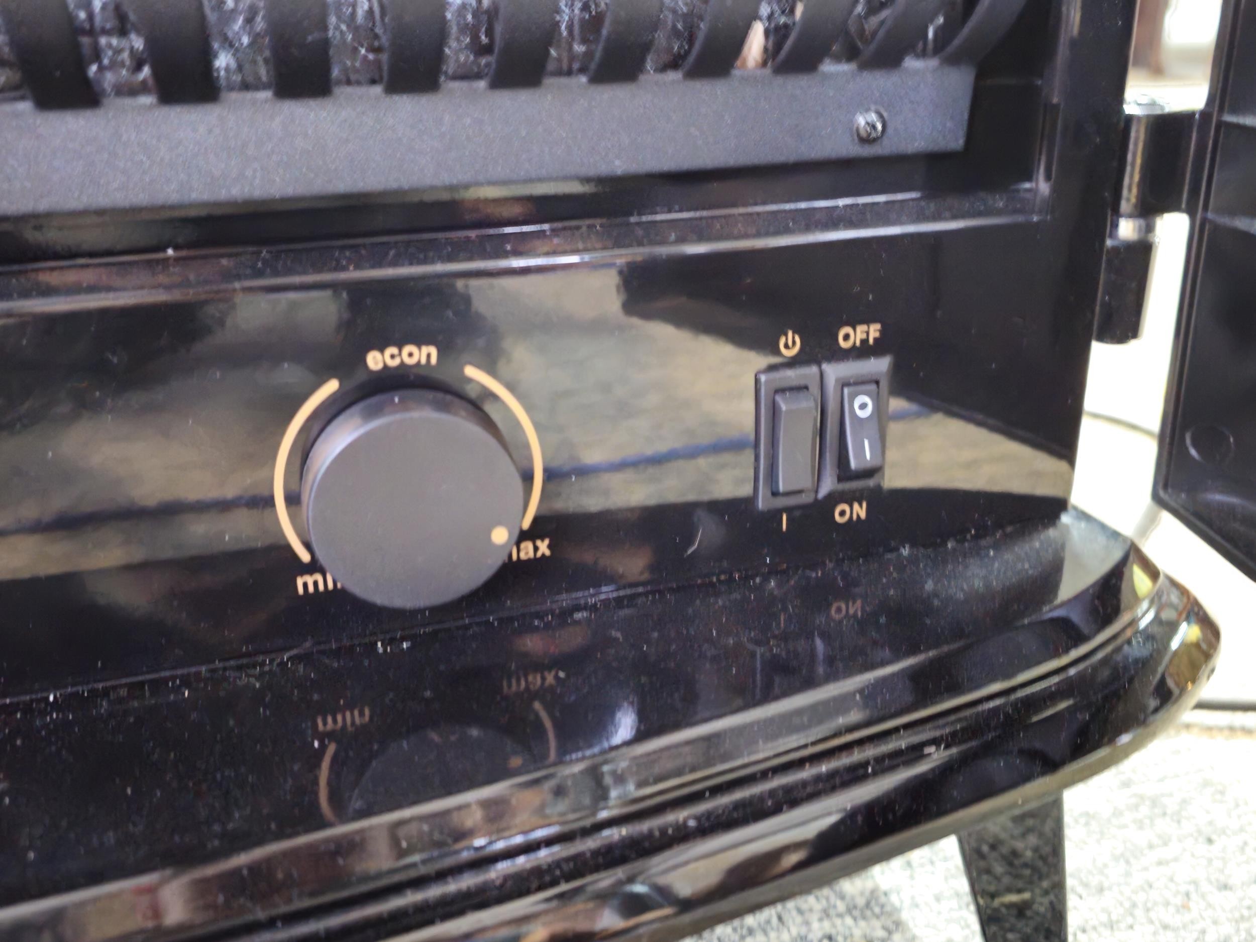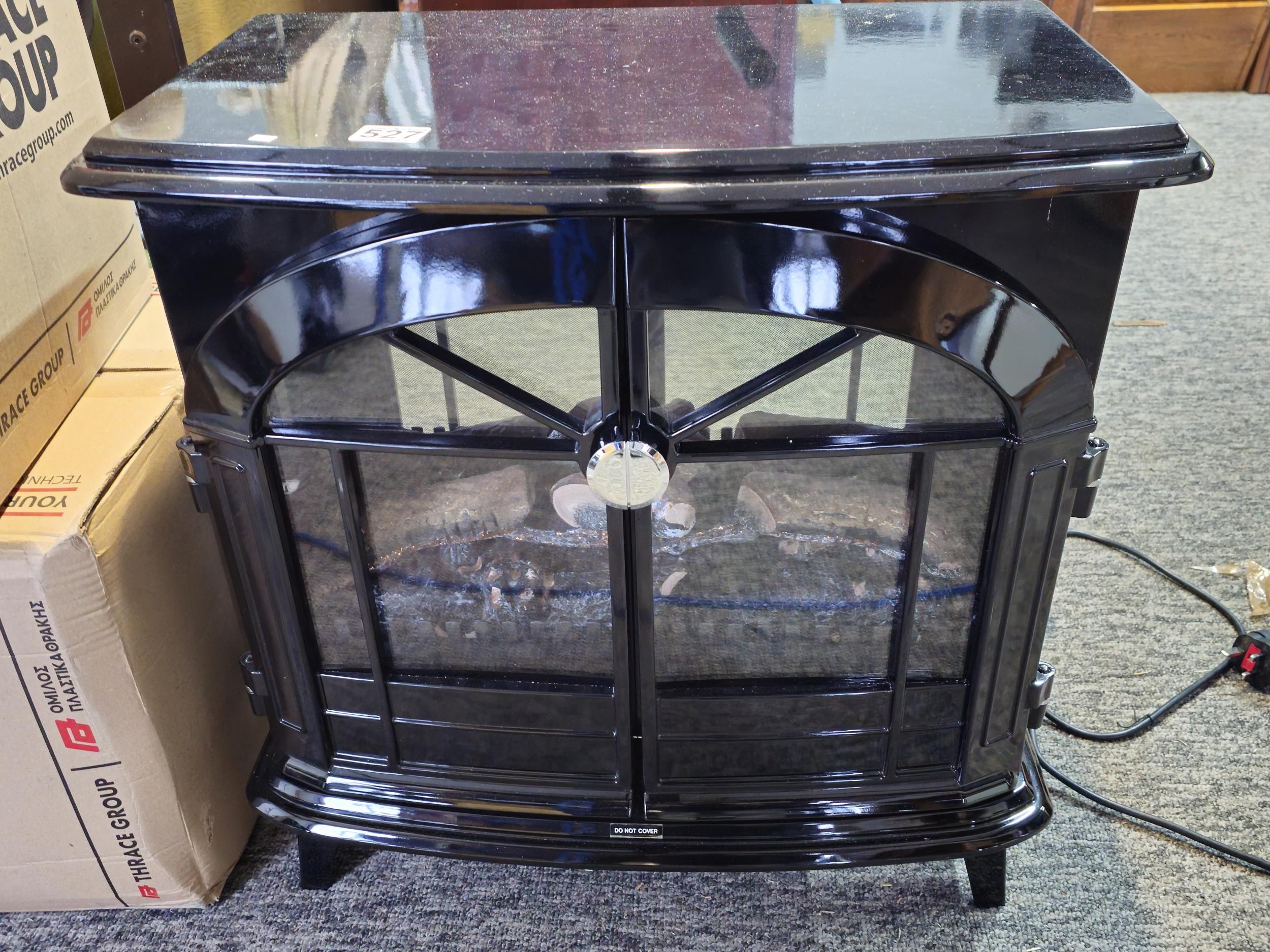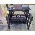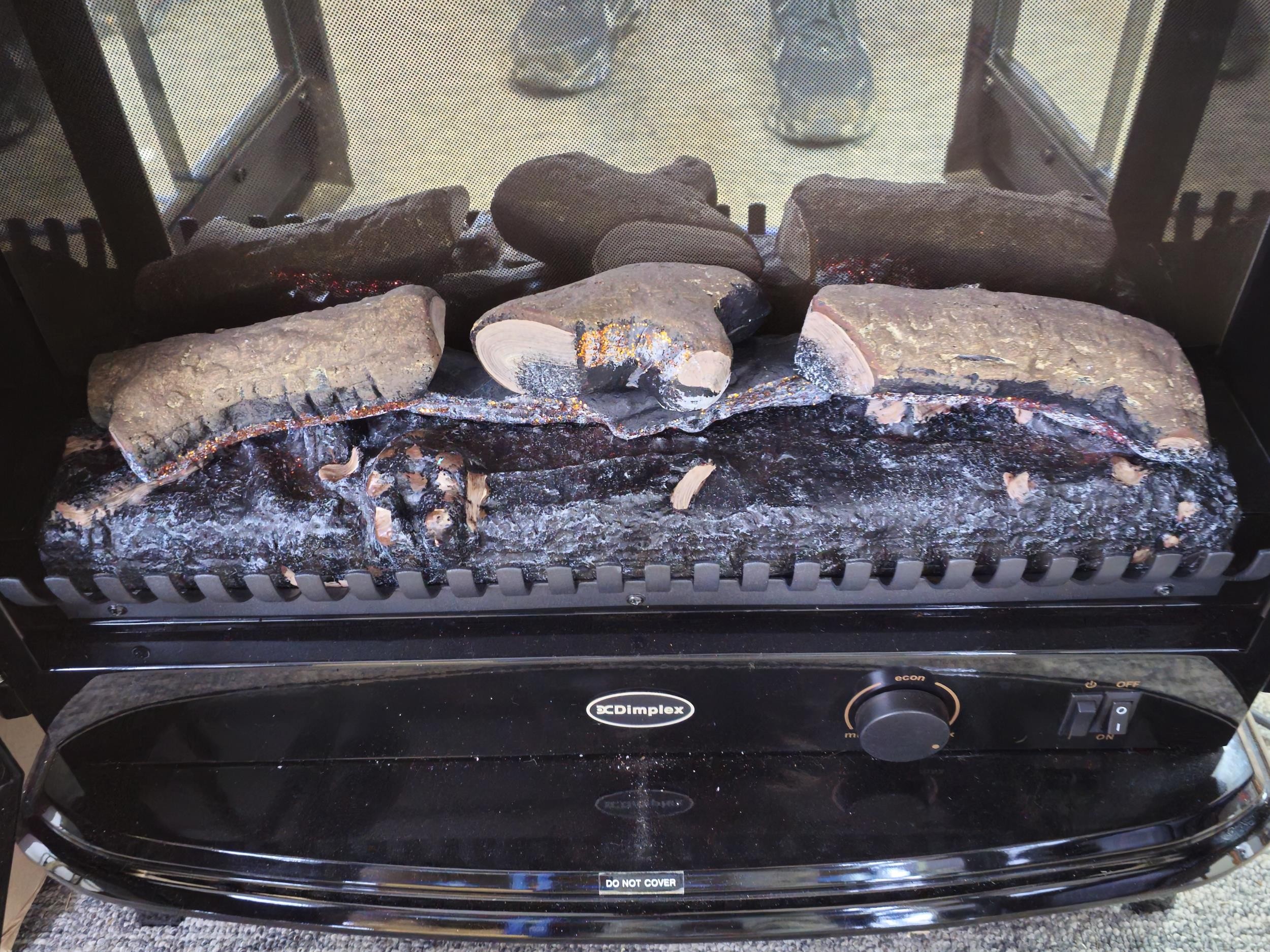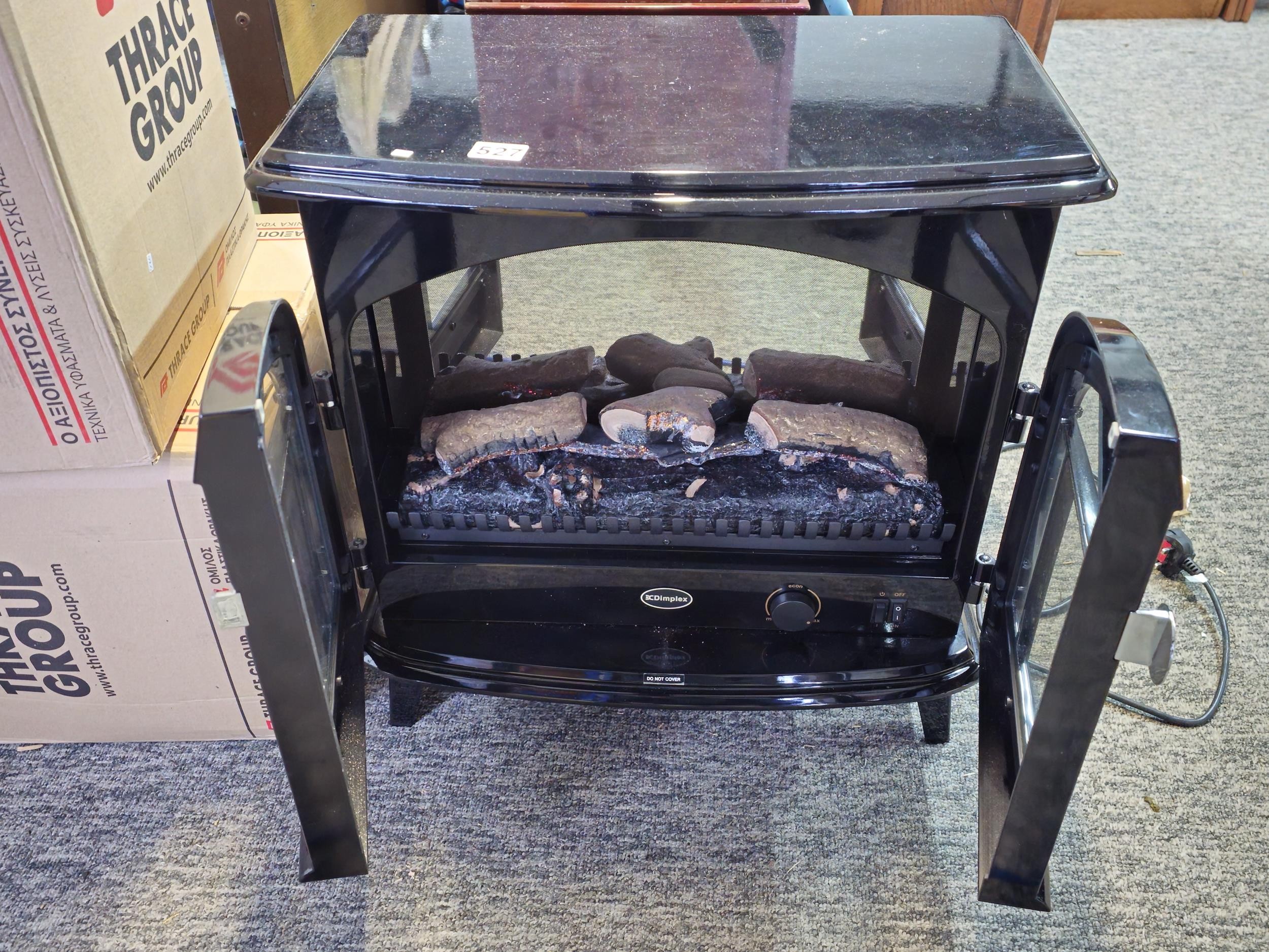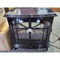 Good quality dimplex electric heater complete with backlight and wood fire effect has 2x arched doors with glazed fronts - height of 63 x length 63cm x depth 37cm at the widest point.