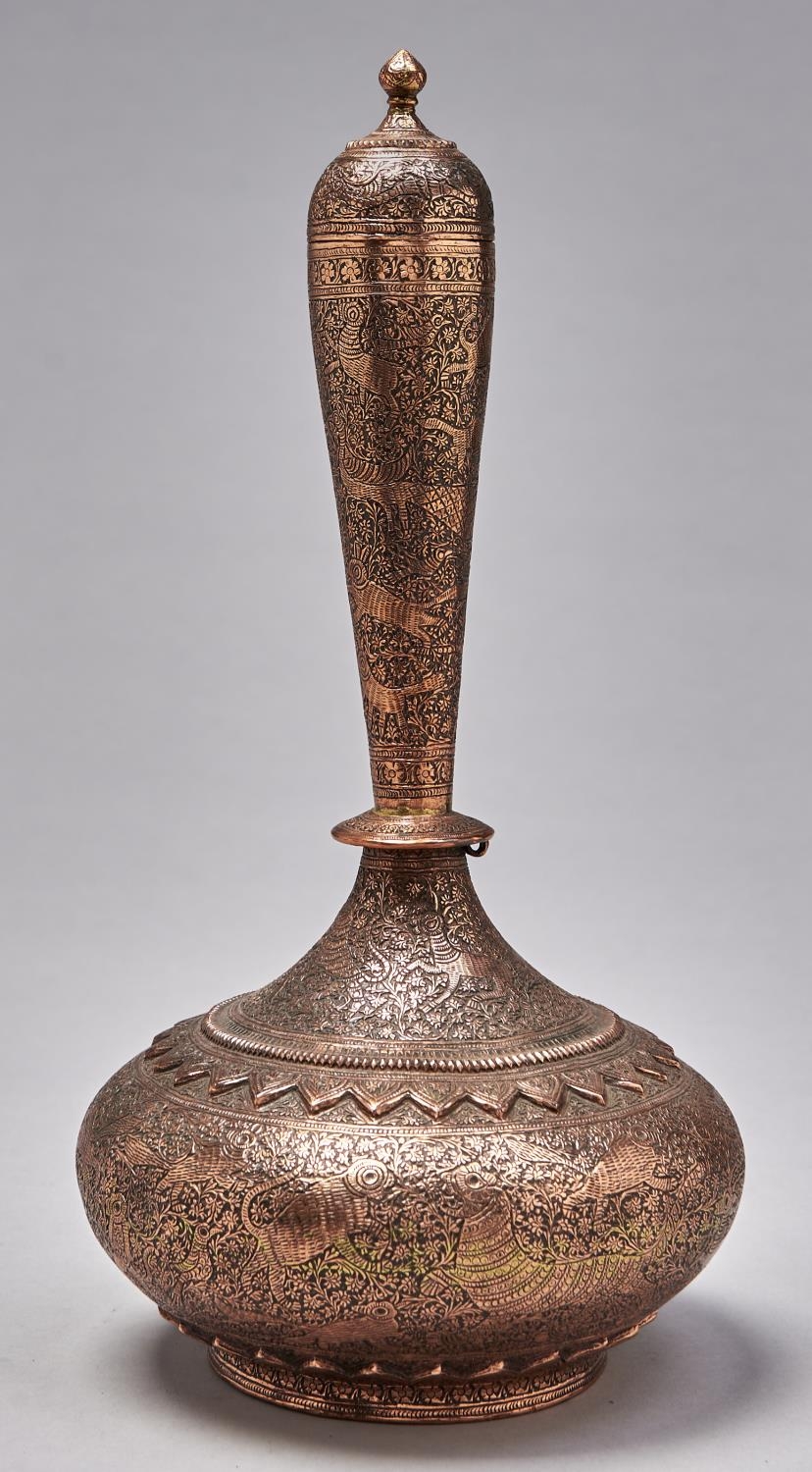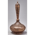 An Indian brass flask, Deccan, late 19th c, intricately chased and engraved with animals from the chase and tendrils, 38cm h