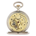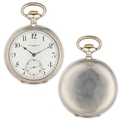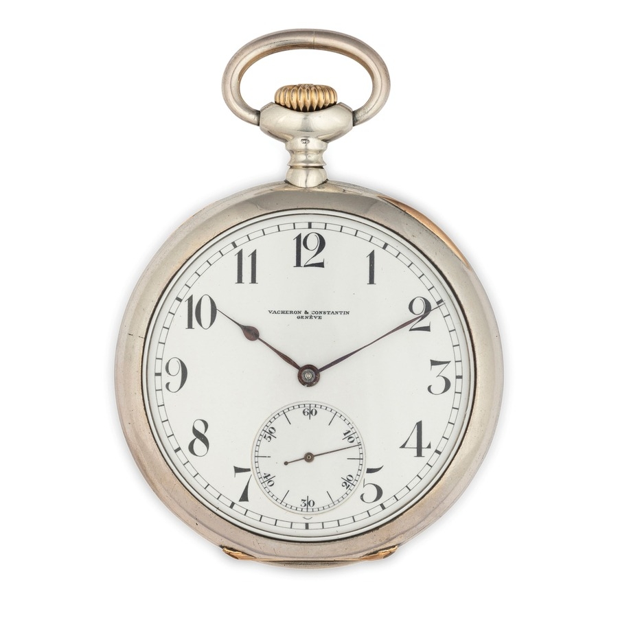 cassa in argento diametro 58 mm, punzone 900 V&C, seriale 228034, con cerniere, unghia per l'apertura del fondello e corona, in oro rosso, quadrante in smalto bianco con numeri romani, firmato Vacheron & Constantin Geneve, piccoli secondi al sei, lancette a pera in acciaio brunito, parapolvere firmato, movimento firmato seriale n. 367901. Orologio attualmente funzionante.