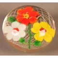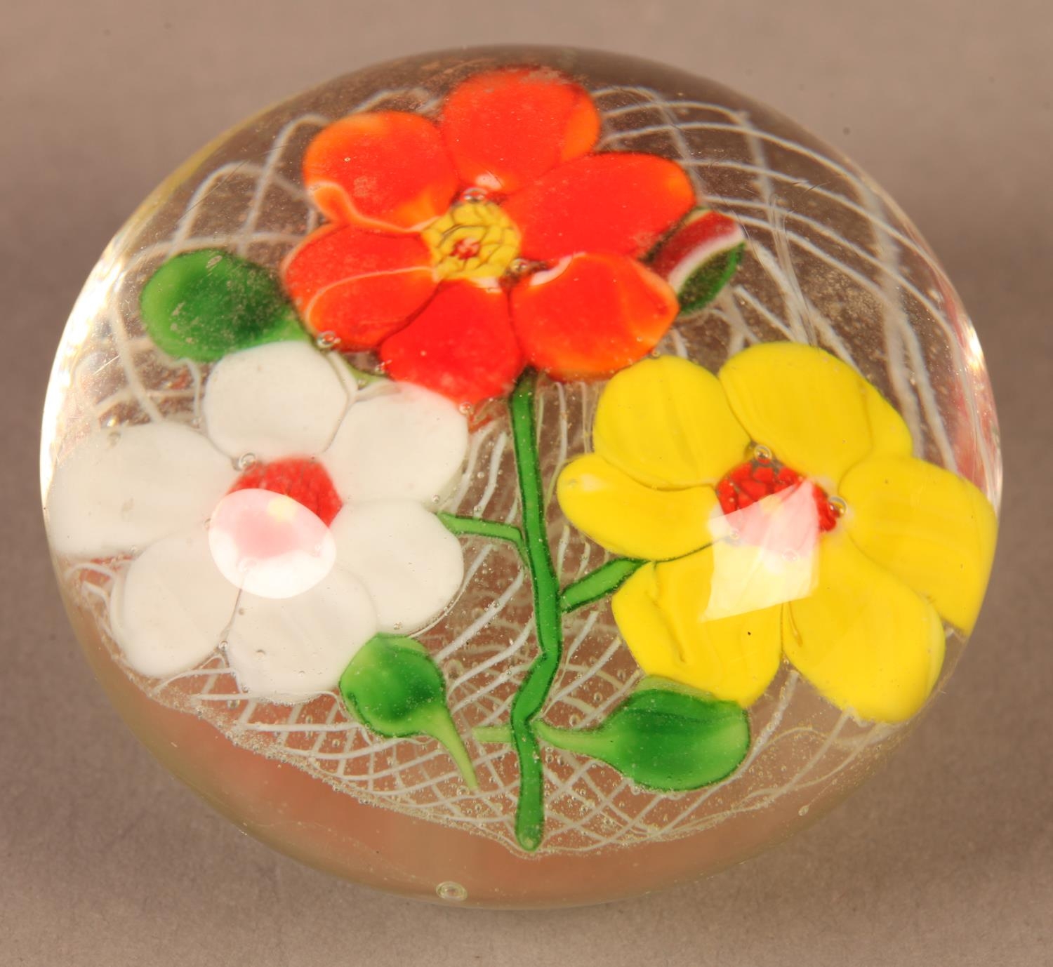 A glass paperweight with white, yellow and orange flowers on a white latticino ground, ground base, 6cm diameter