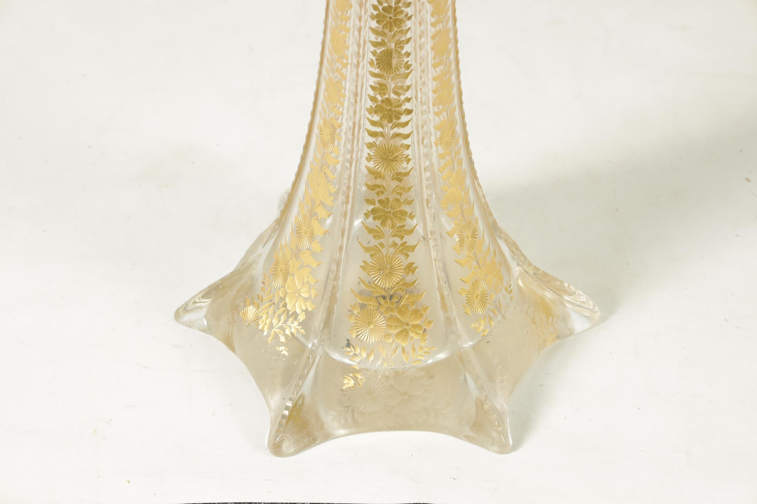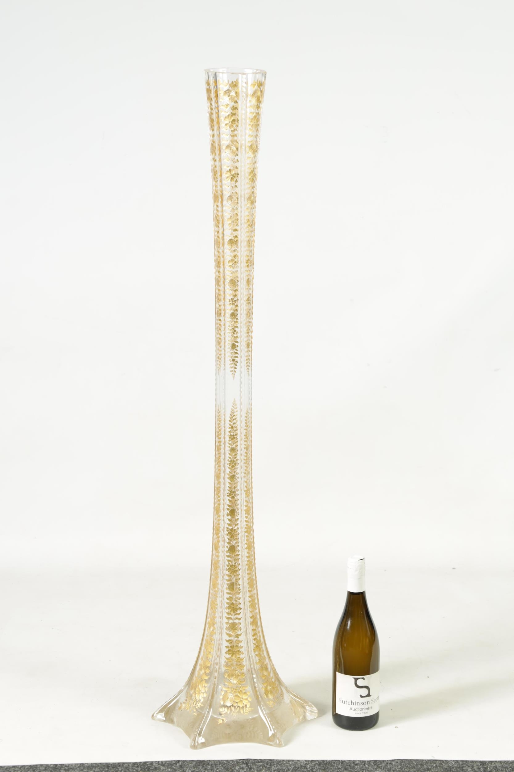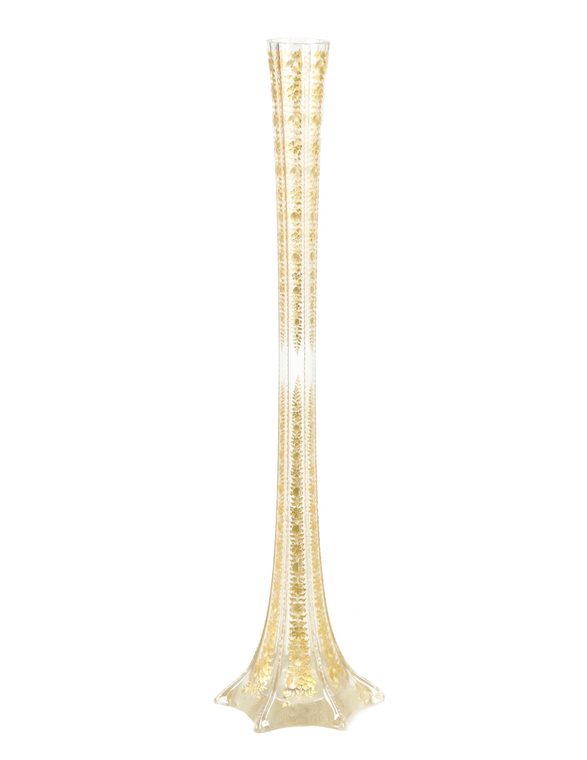 AN IMPRESSIVE EXHIBITION QUALITY 19TH CENTURY FRENCH BACCARAT GLASS FLOOR STANDING FLARED TAPERING TRUMPET VASE the facetted body with cut and gilt flower head and leaf decorated panels on a spreading scallop edge footed base. (111cm high )