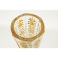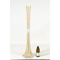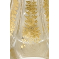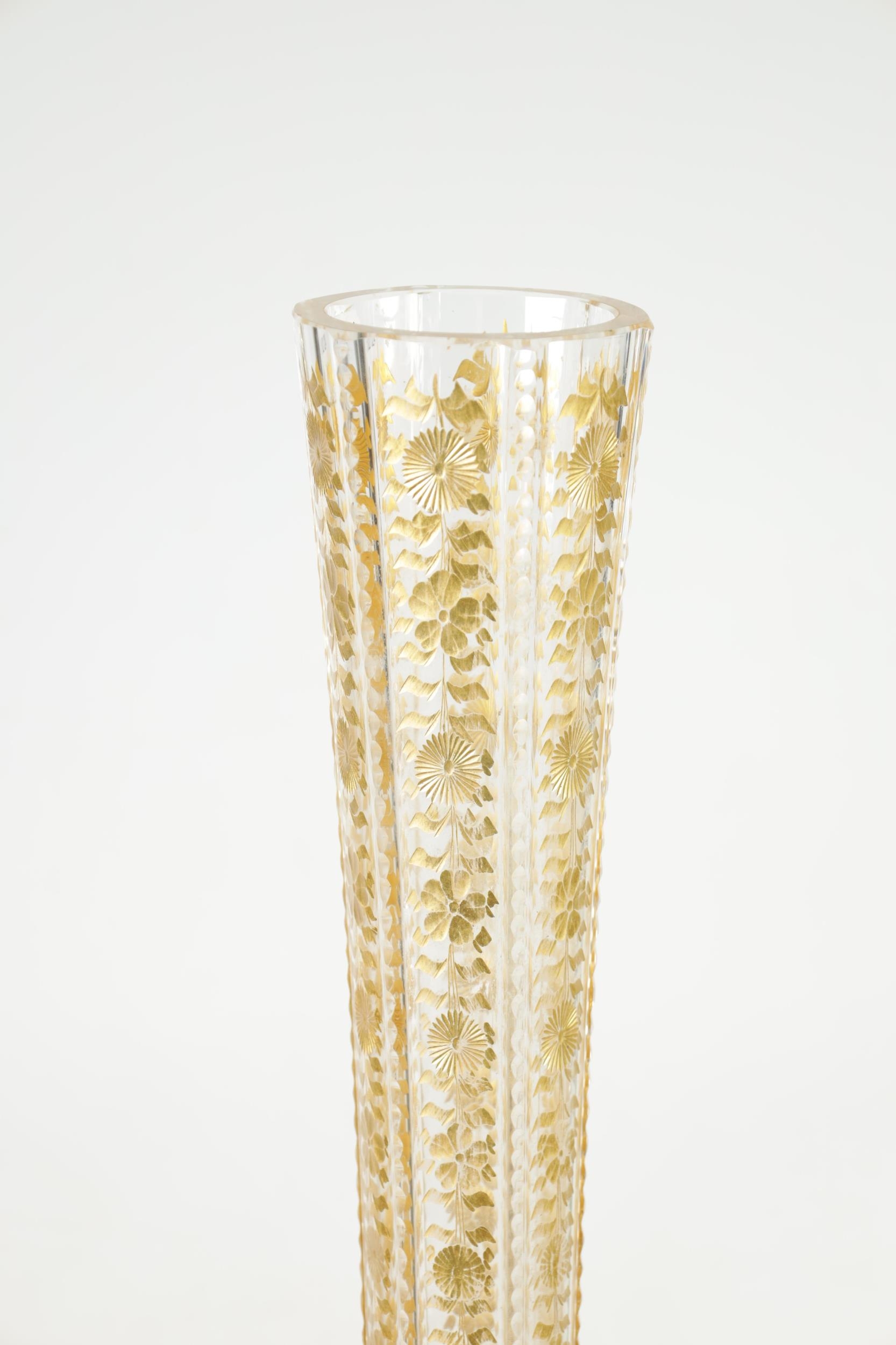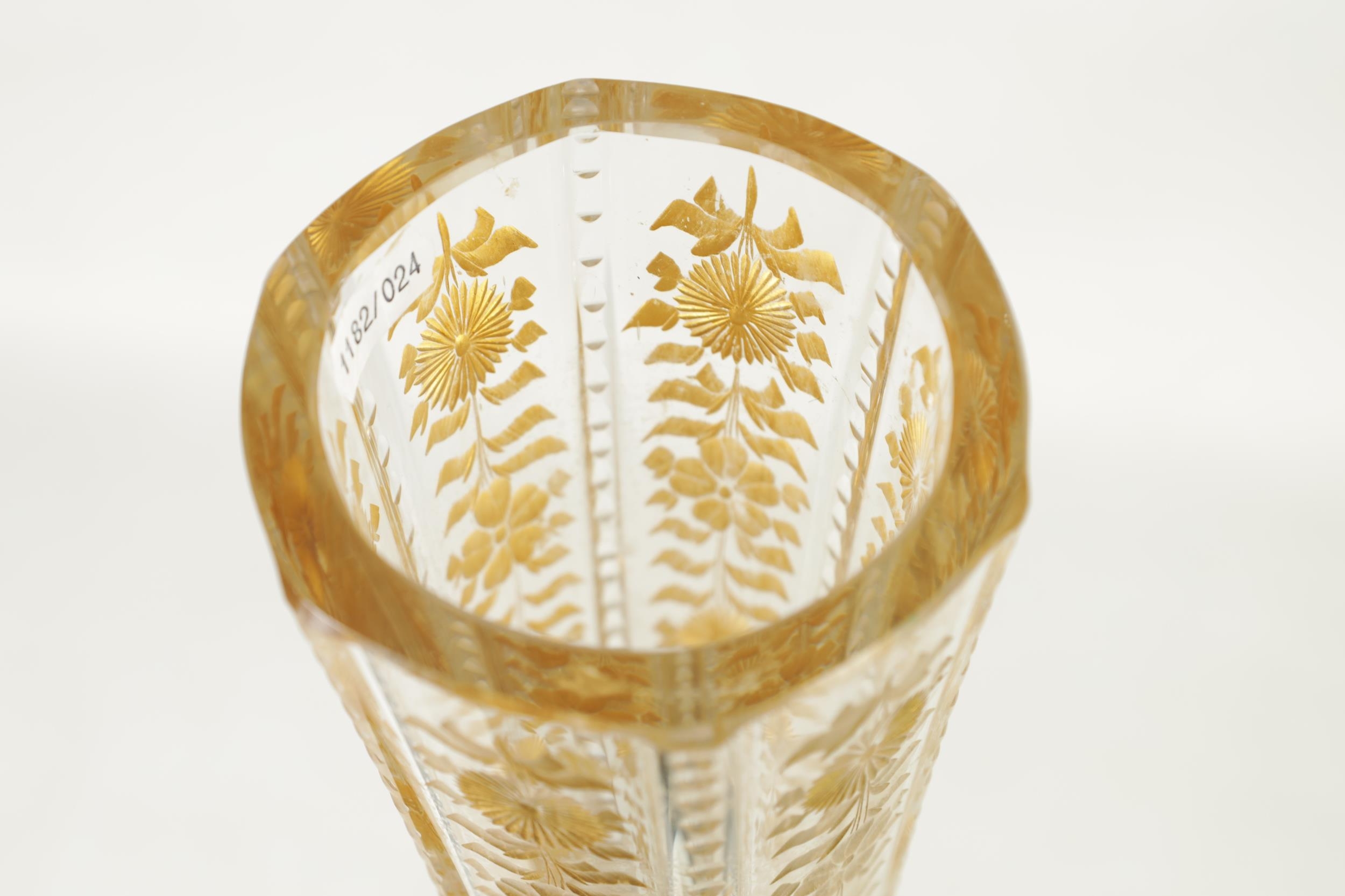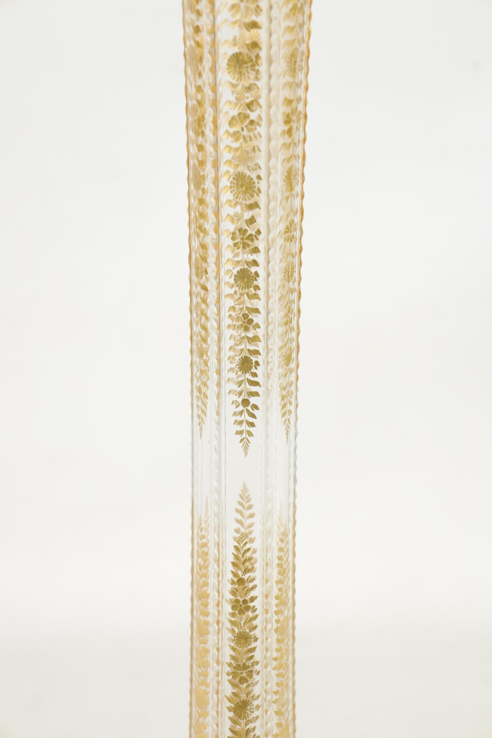 AN IMPRESSIVE EXHIBITION QUALITY 19TH CENTURY FRENCH BACCARAT GLASS FLOOR STANDING FLARED TAPERING TRUMPET VASE the facetted body with cut and gilt flower head and leaf decorated panels on a spreading scallop edge footed base. (111cm high )