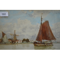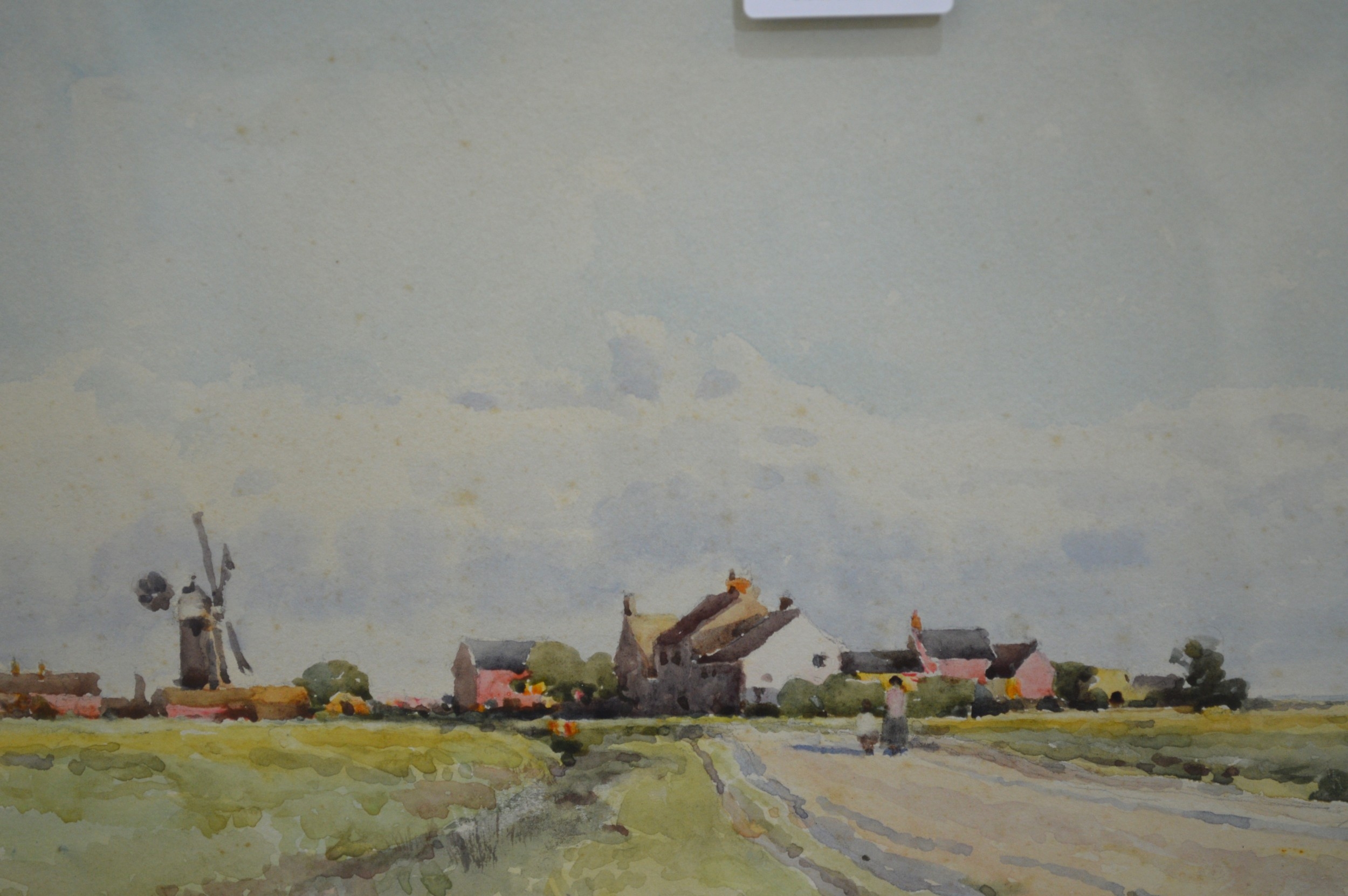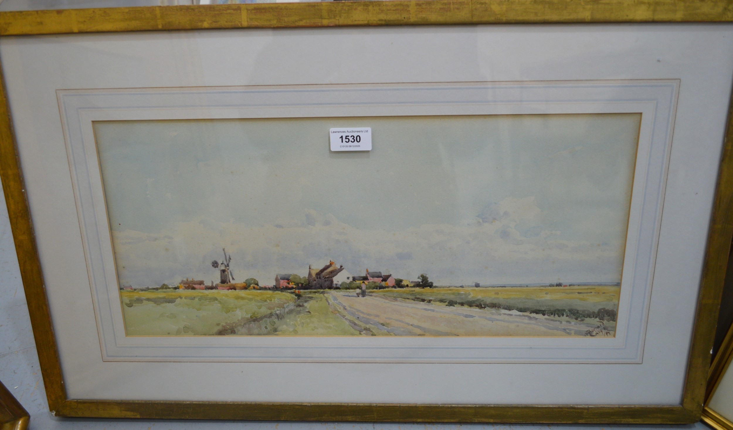Margaret Bernard, watercolour, lowland scene with windmill, 20 x 50cm, gilt framed