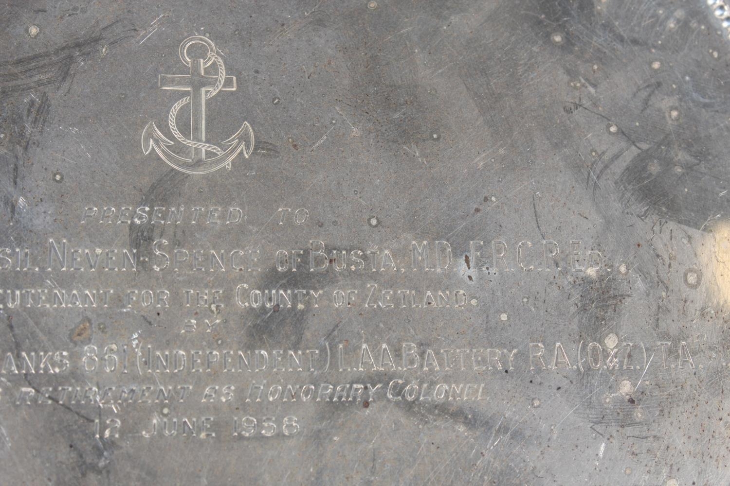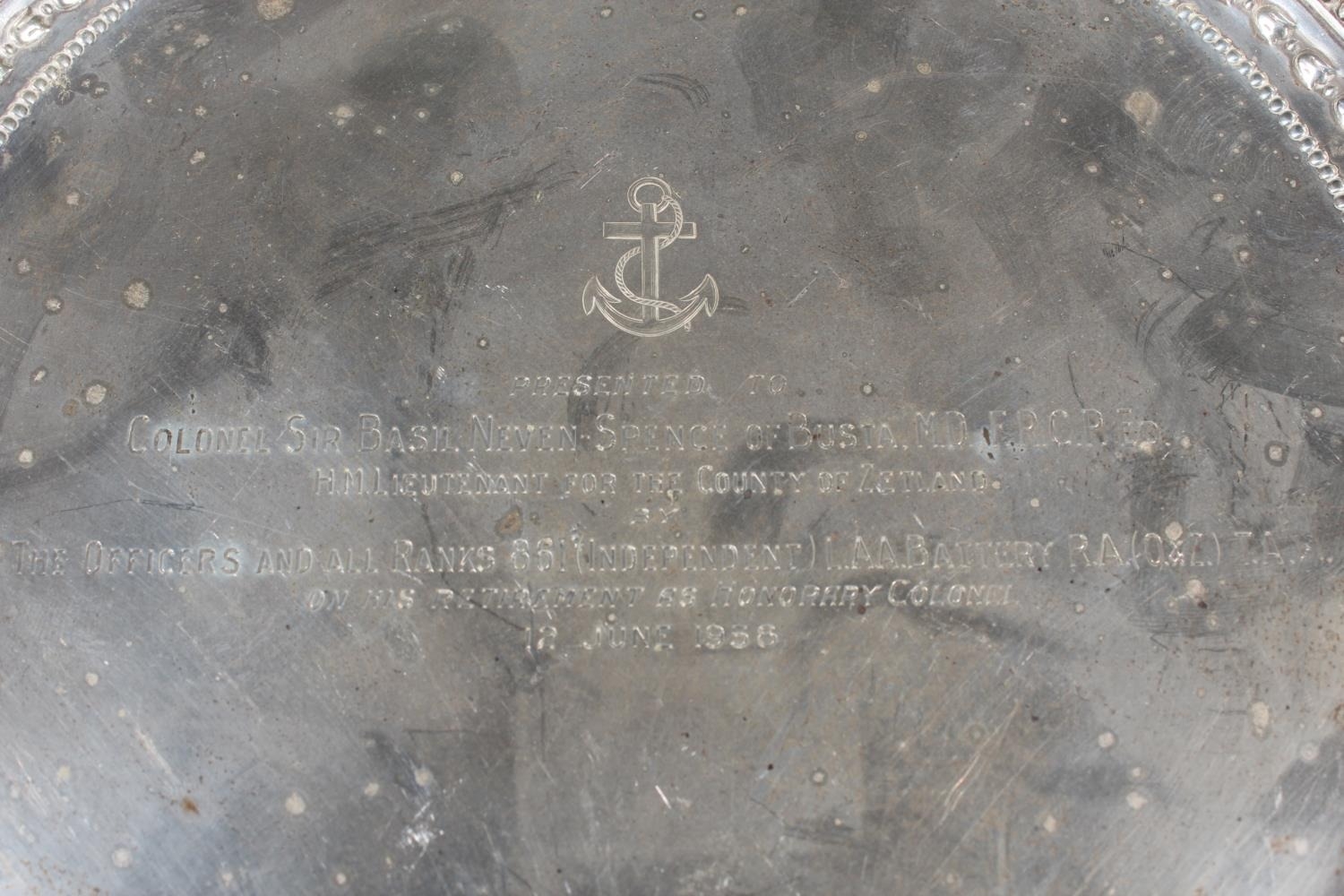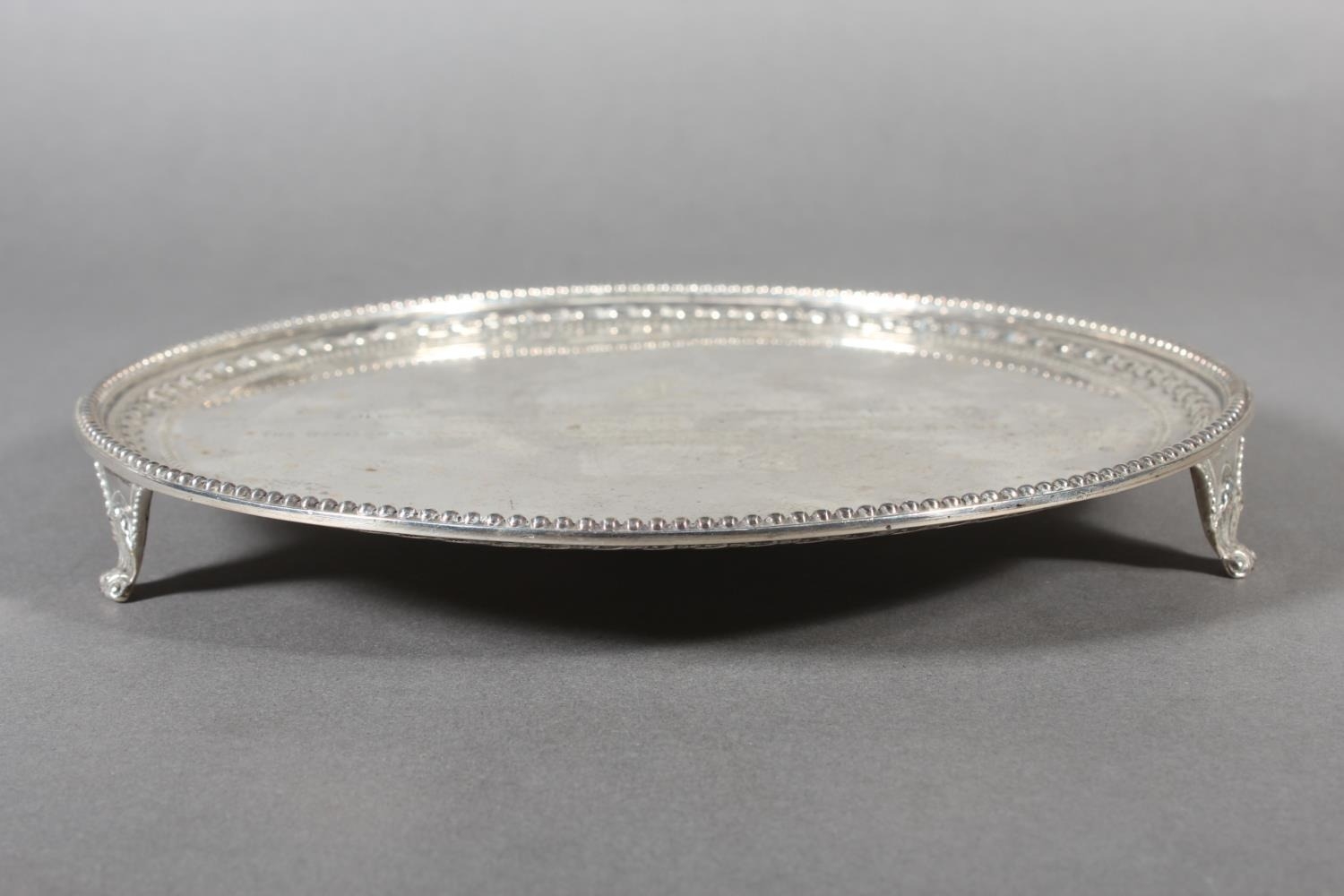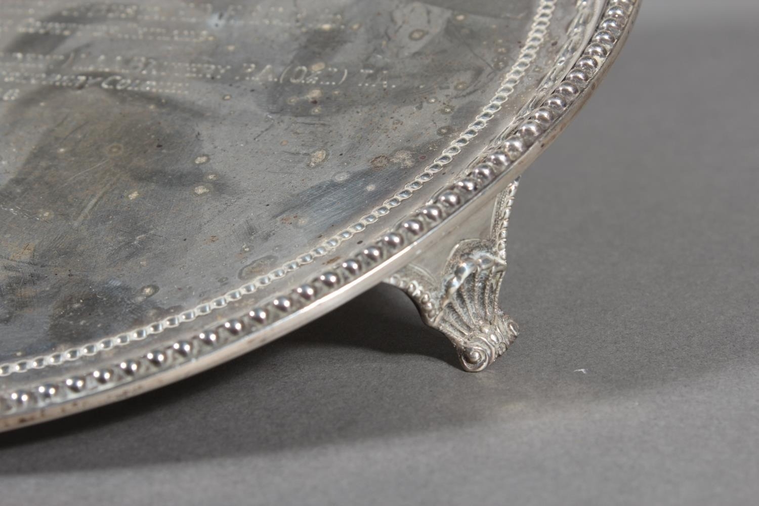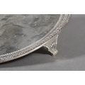 Victorian silver salver with decorative border and raised on tripod supports, Daniel & John Wellby, London, 1891, 'presented to Colonel Sir Basil Neven-Spence of Busta M.D.,F.R.C.P.Ed H.M Lieutenant for the county of Zetland on his retirement, 461g.