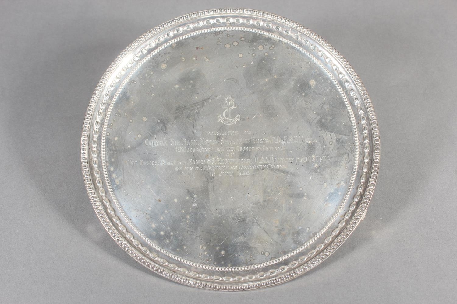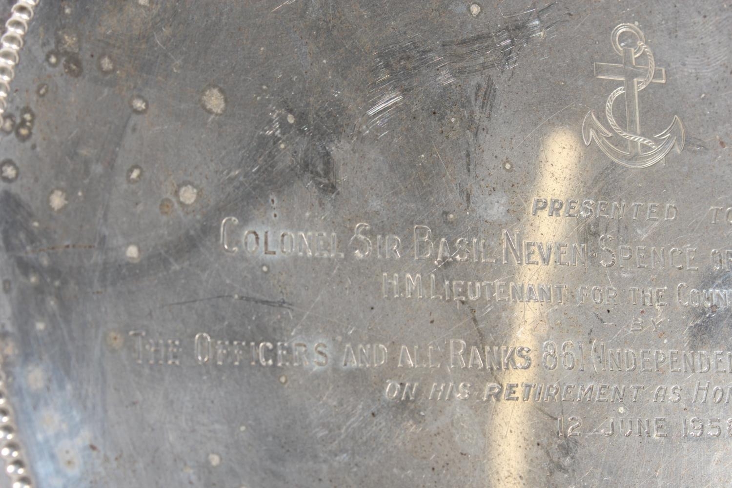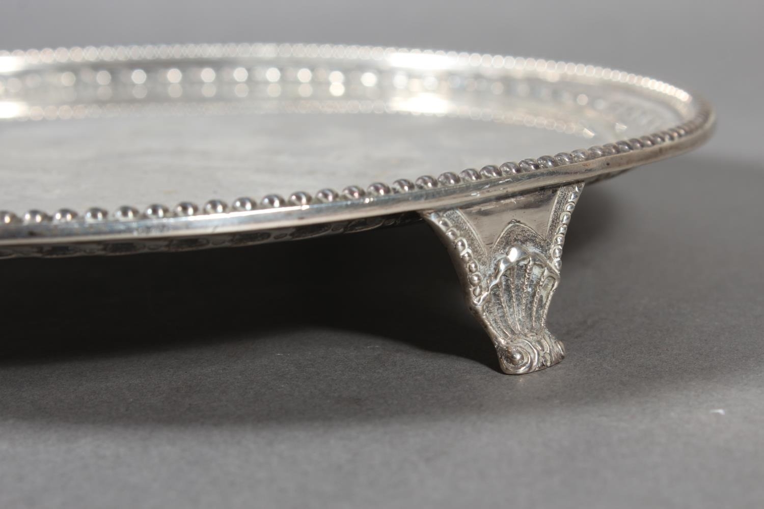Victorian silver salver with decorative border and raised on tripod supports, Daniel & John Wellby, London, 1891, 'presented to Colonel Sir Basil Neven-Spence of Busta M.D.,F.R.C.P.Ed H.M Lieutenant for the county of Zetland on his retirement, 461g.