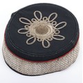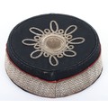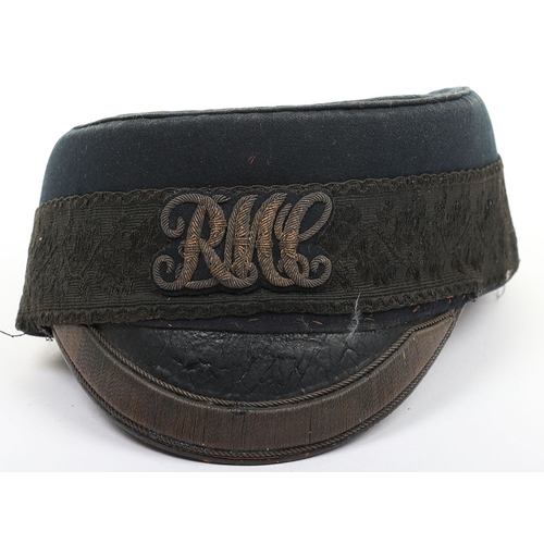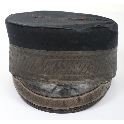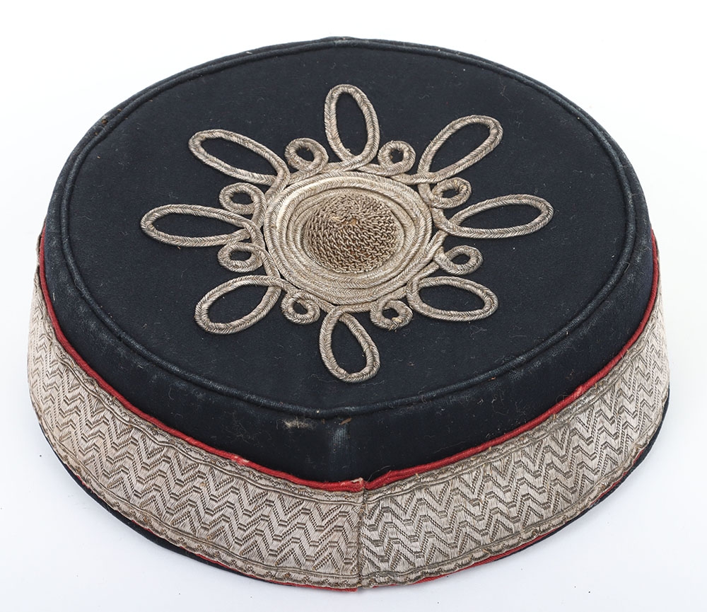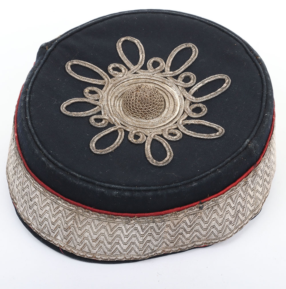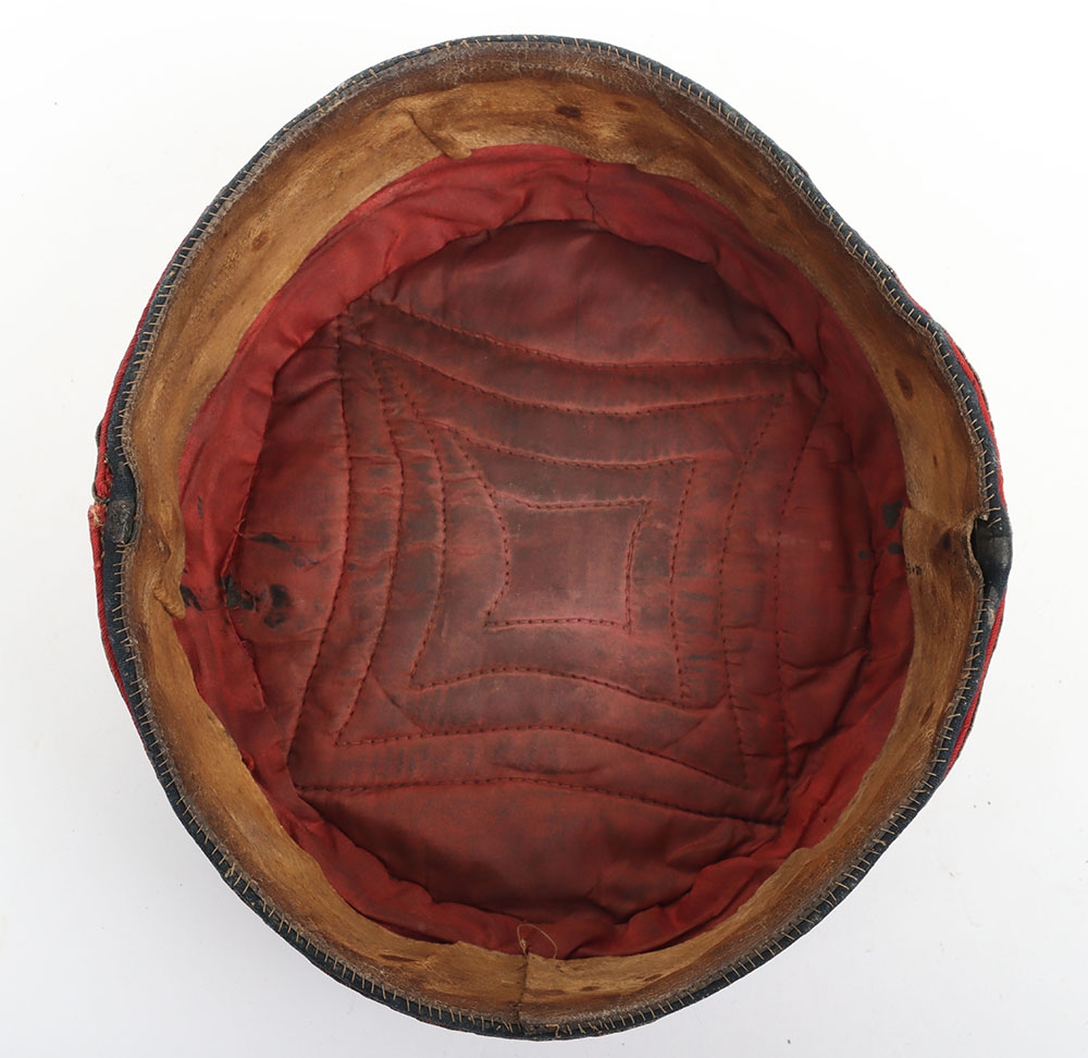Volunteer Artillery Officers Pill Box. Made from dark blue cloth, with silver lace with scarlet welts to sides and silver lace pattern & button to top. Crimson lining with leather band. In generally near very good condition, but with wear.