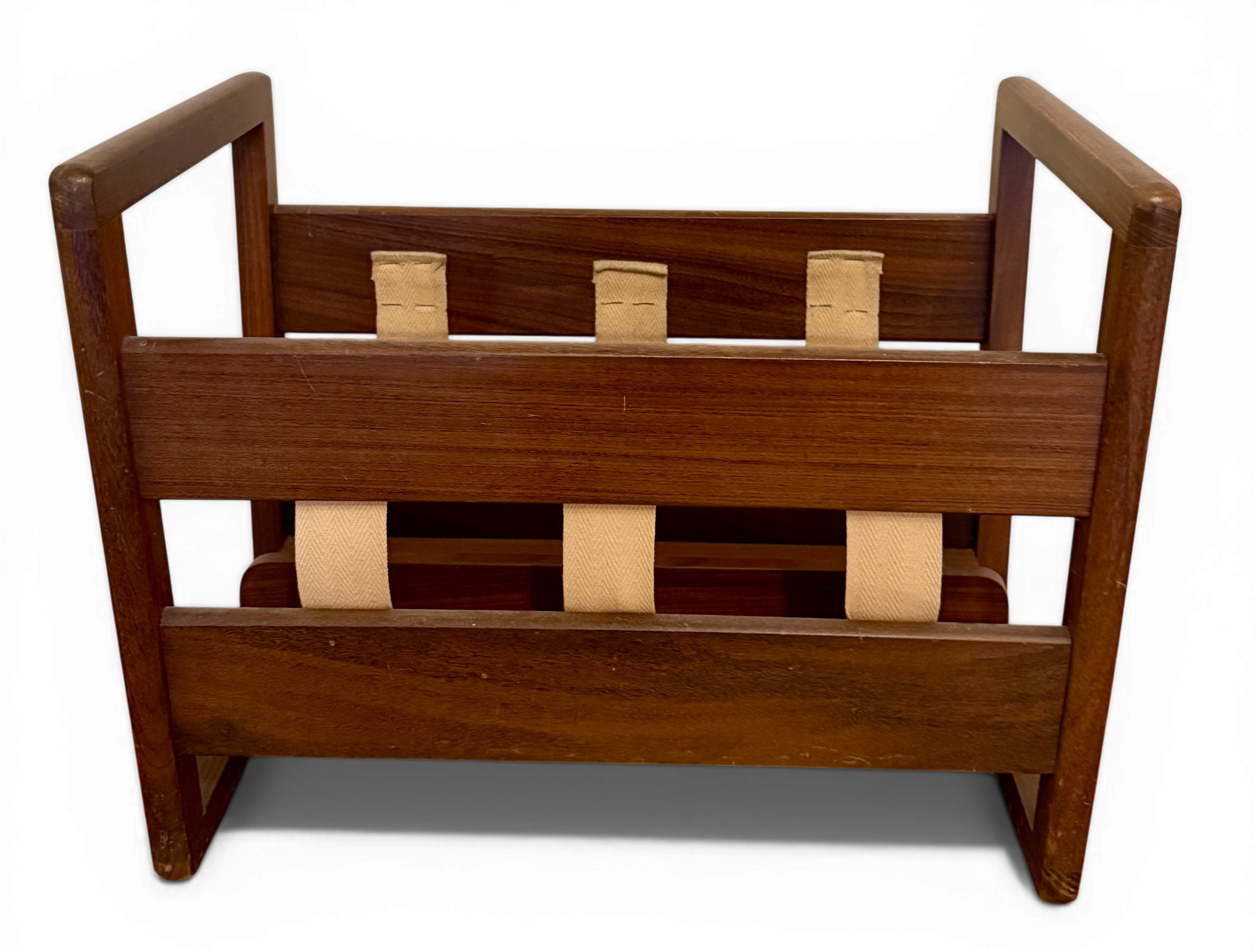 A mid 20thC teak magazine rack. 43cm x 24cm x 35cm h.