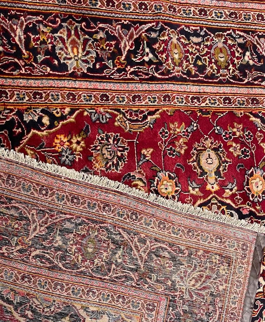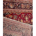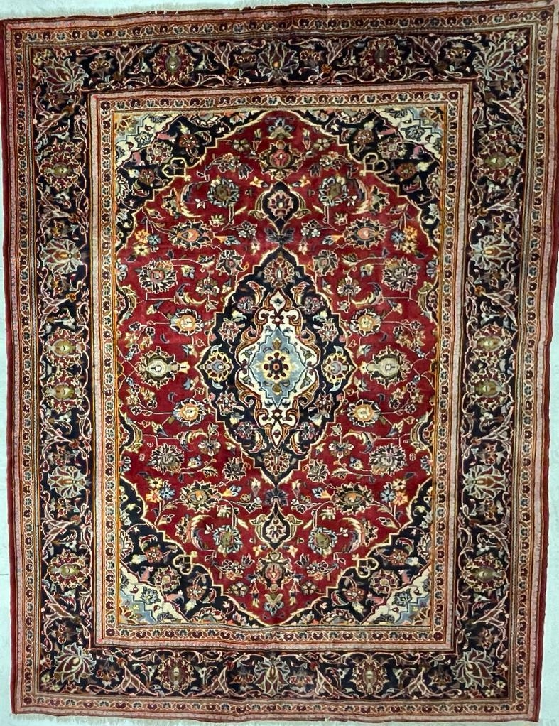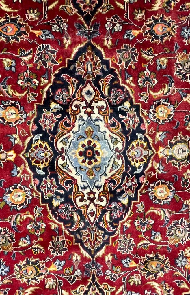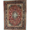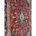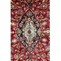 A 20th century Central Persian Islamic Kashan floor rug carpet having a central medallion in light blue & cobalt within a central red panel enclosed in series of outer borders decorated with foliate & floral patterns. Measures approx. 280 x 195cm.