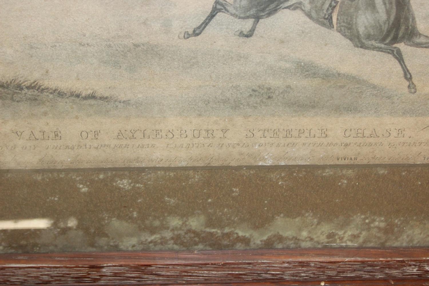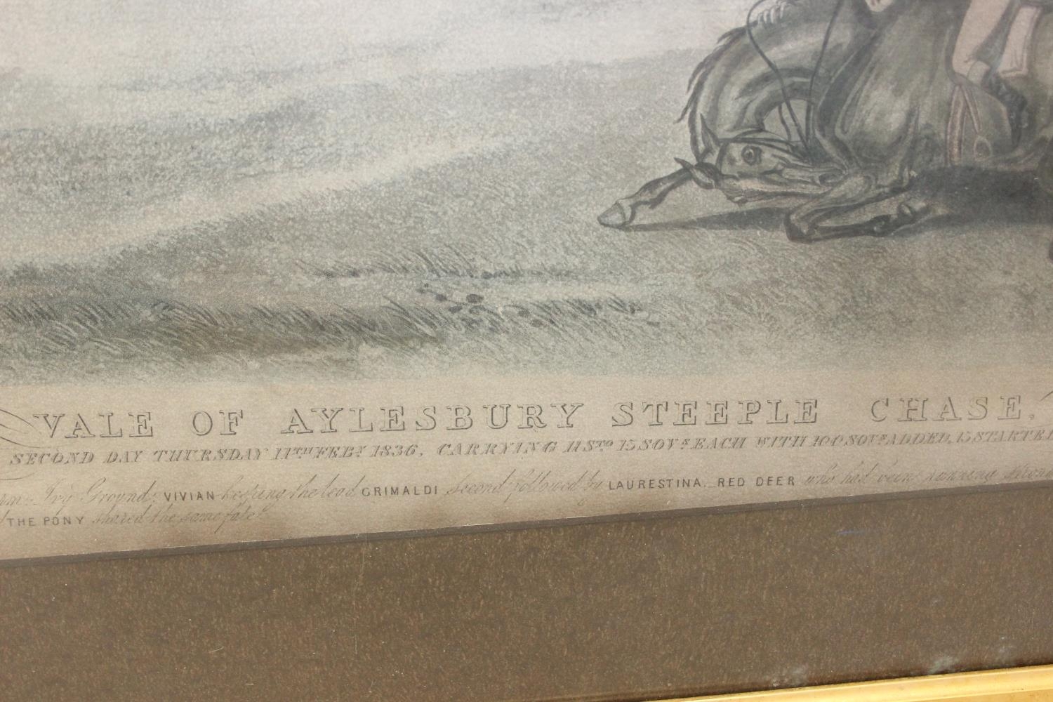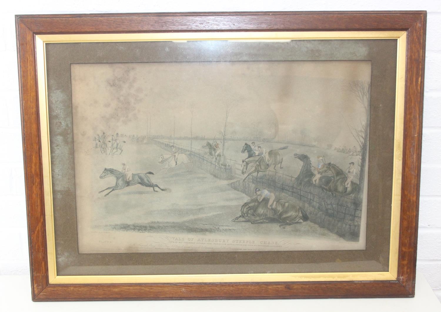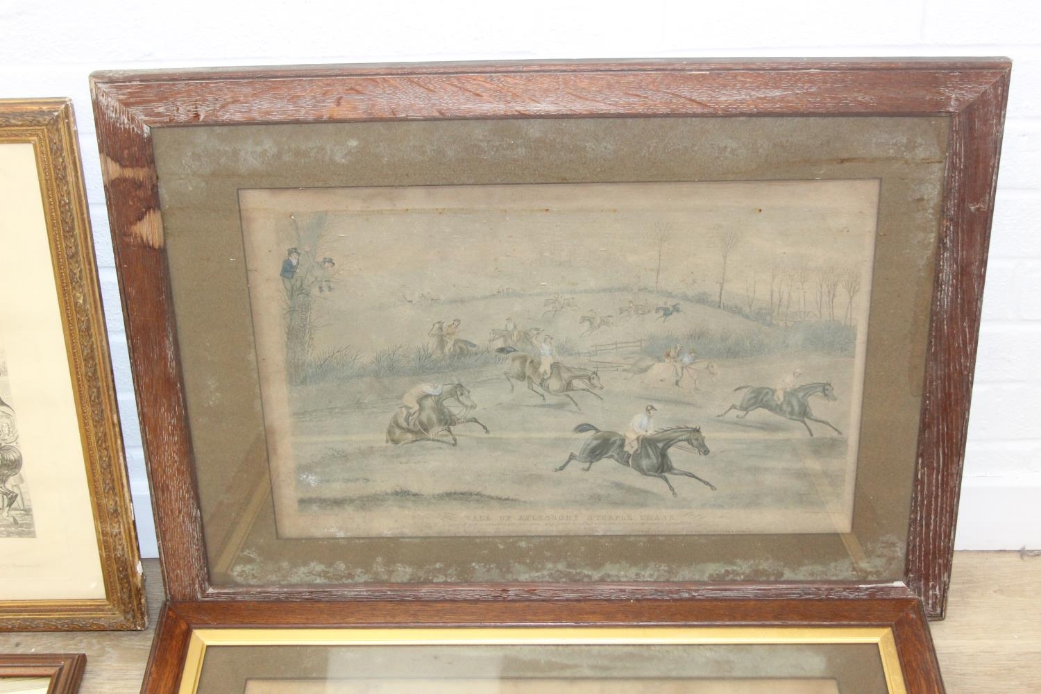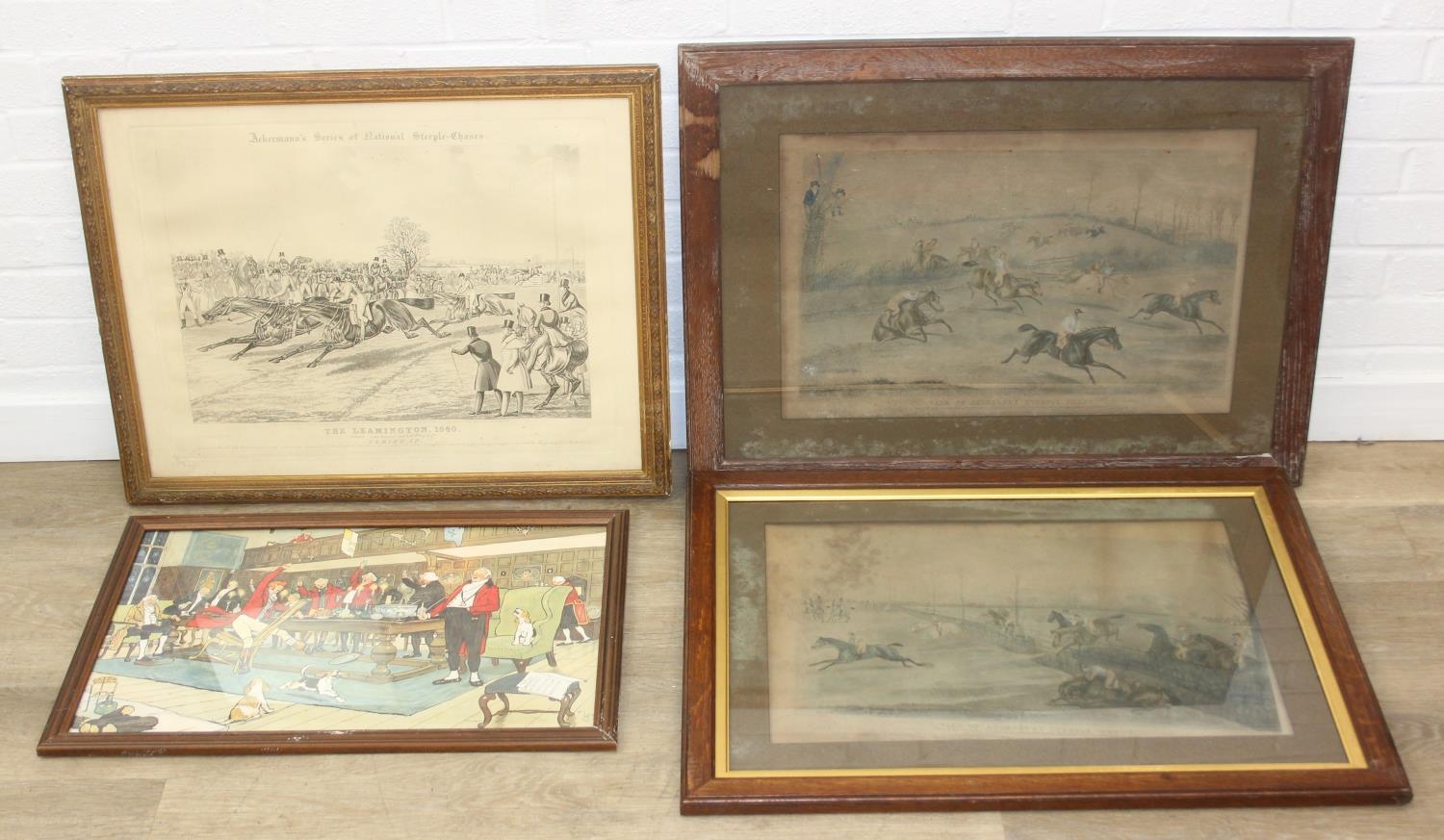 Four assorted hunting related prints to inc one after Cecil Aldin, Ackermann's Series of National Steeple Chases "The Leamington 1840" & two antique distressed prints of the Vale of Aylesbury Steeple Chase, the largest 81cm x 60cm [4]