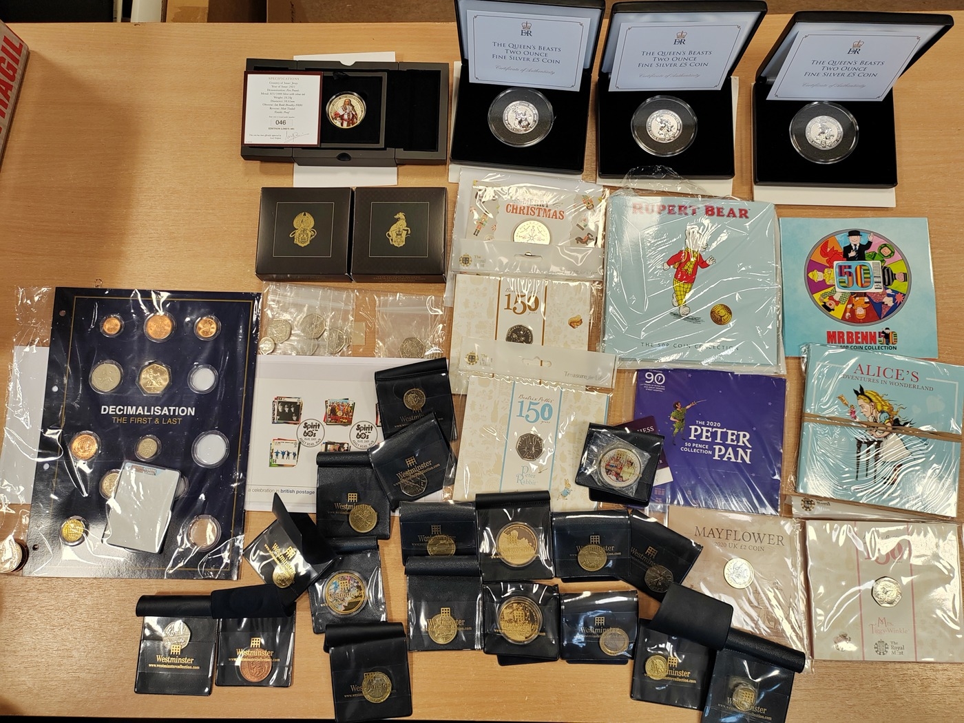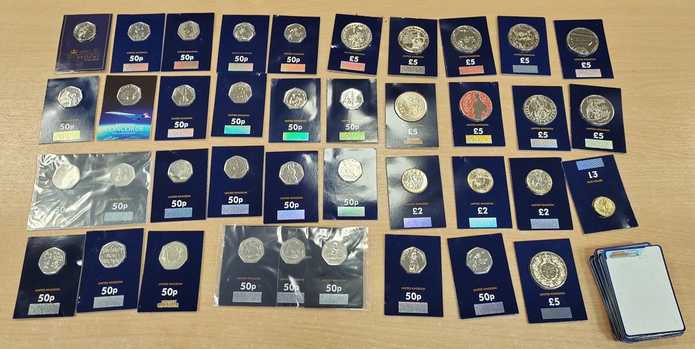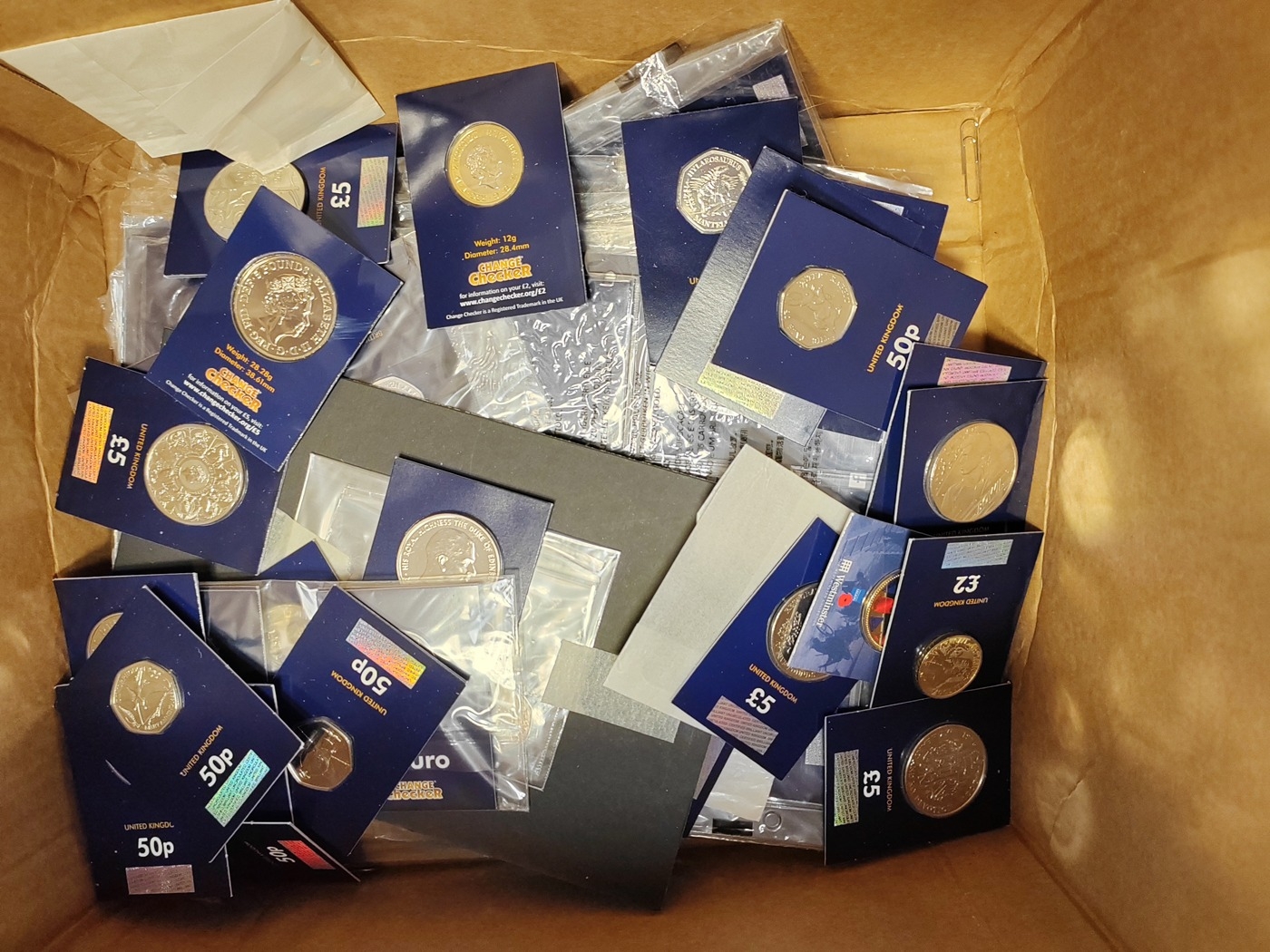 Collection with boxed uncirculated 2020 2oz silver Queens Beast Lion and Unicorn (2), boxed silver proof FDC 2021 Queens Beast Griffin and Greyhound, Jersey Sir Robert Walpole £5 FDC, plus Change Checker coins with sealed carded £5 (29), £2 (17), 50p (63), coins packs (6) etc. and range of uncirculated coins. (B)