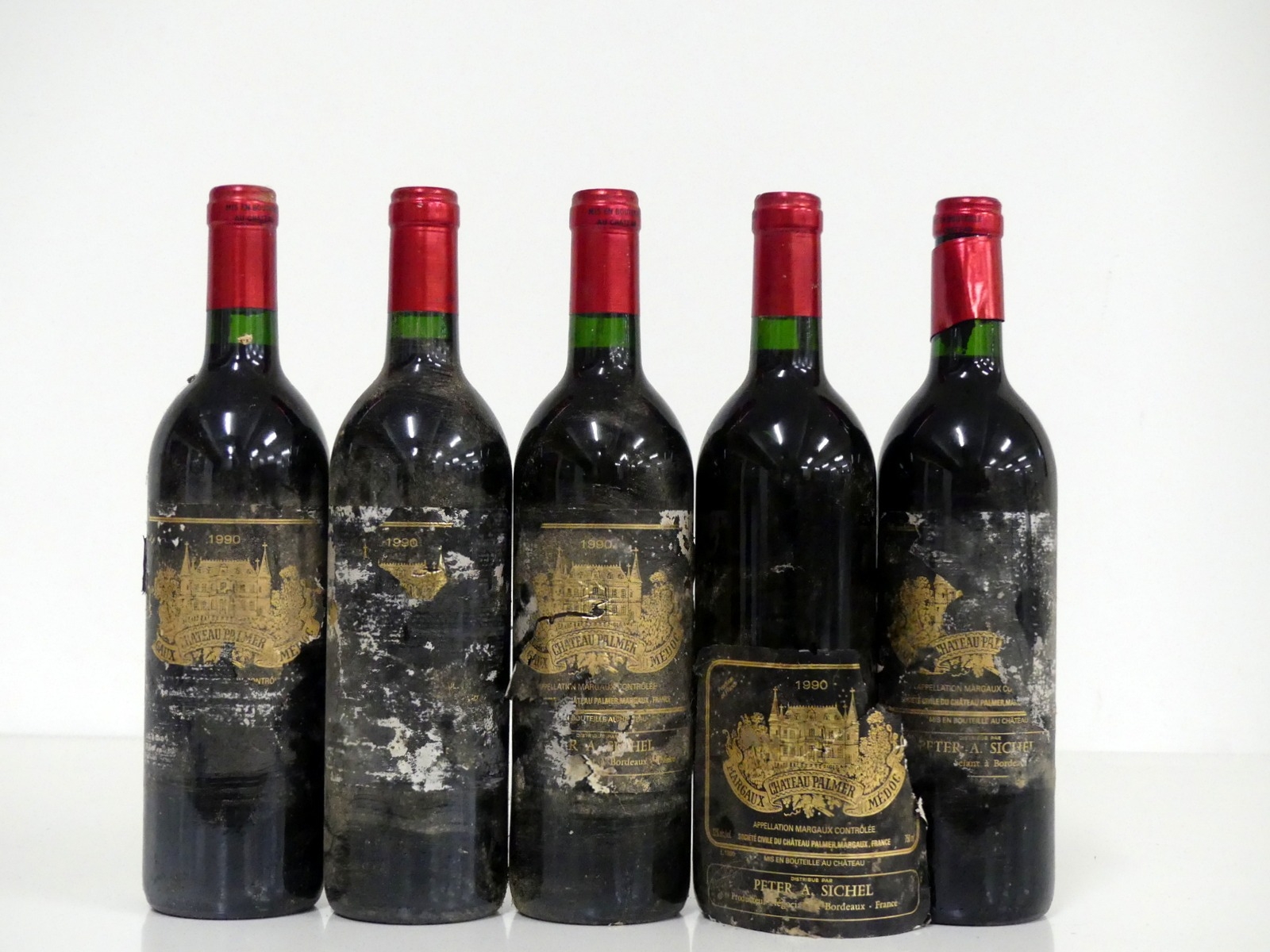 5 bts Ch. Palmer 1990 Cantenac (Margaux) 3me Cru Classé, 2 Sichel shipping labels, 1 hf/i.n, 4 i.n, bs, cdl, pt dis, loose labels, 1 foil cut/shortened by JSC,