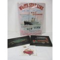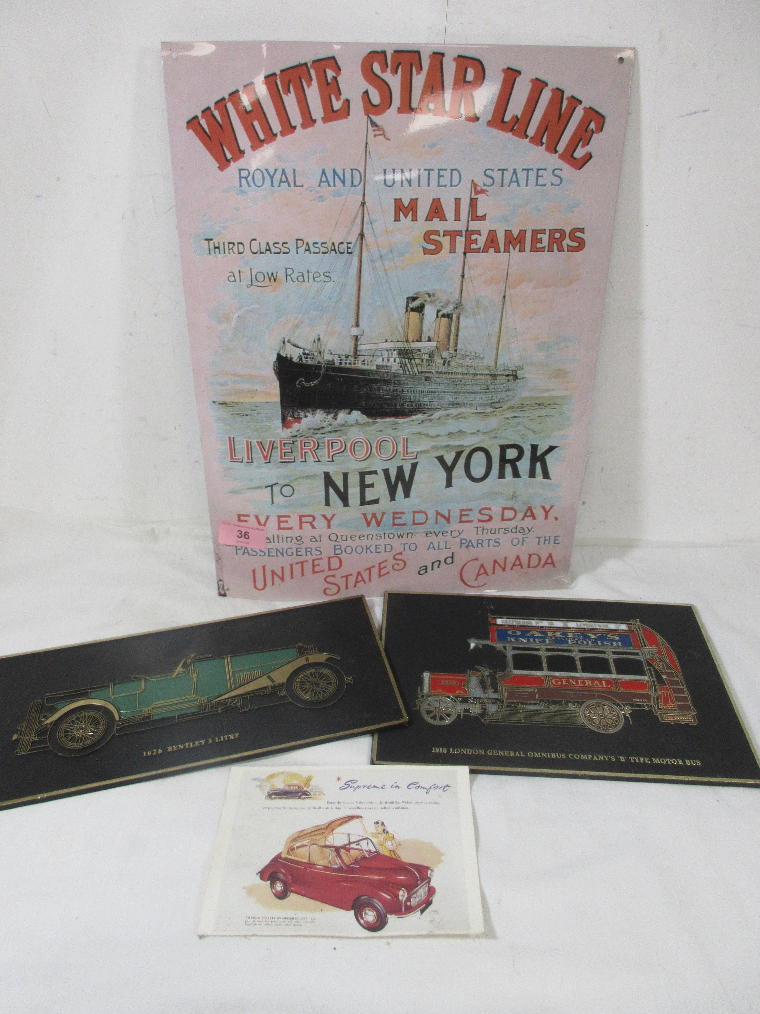 White star light metal sign 12 by 18 inches ,two plastic 1970s cars signs and a Morris convertible advertising postcard .