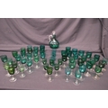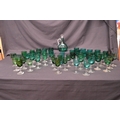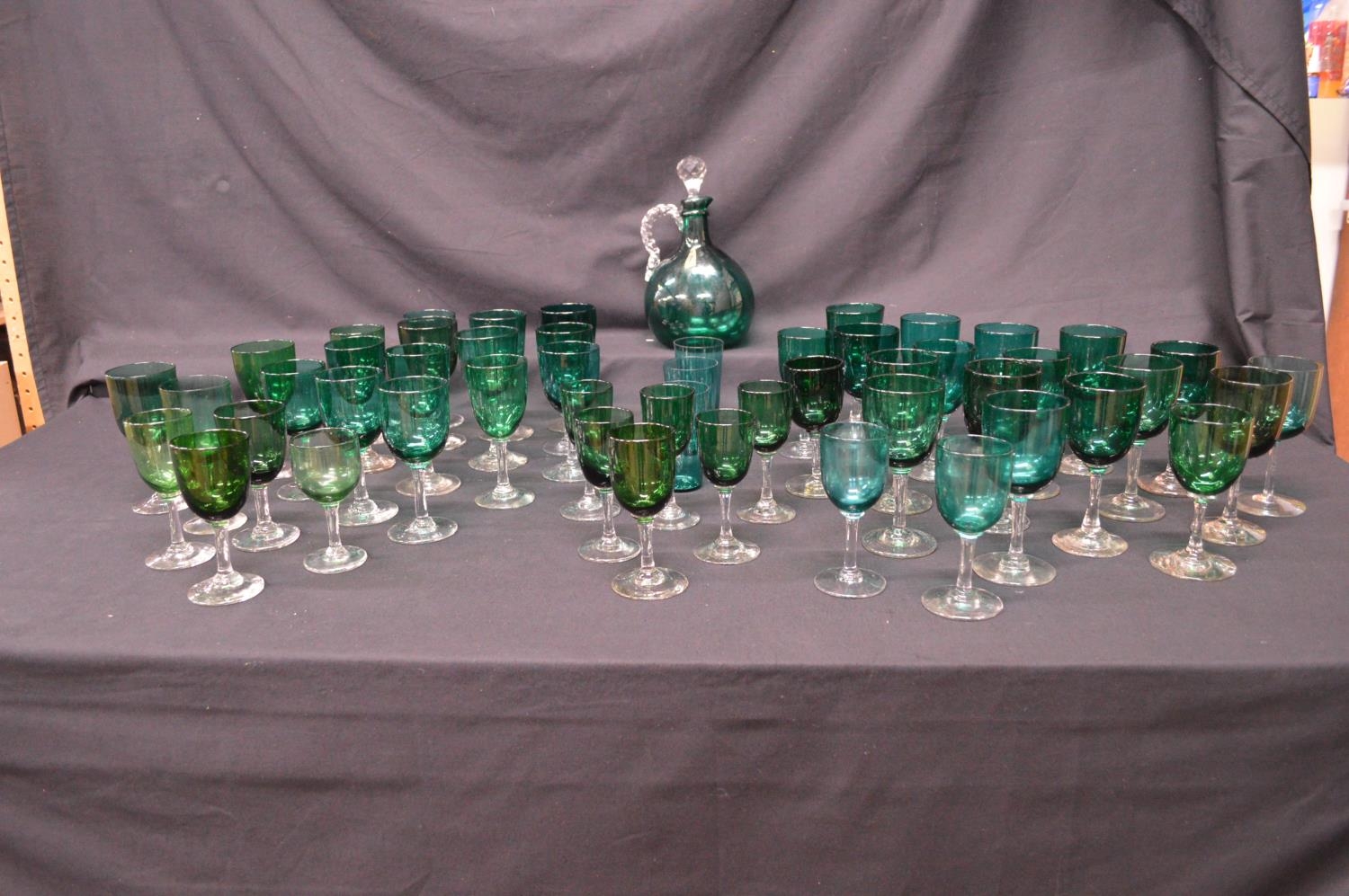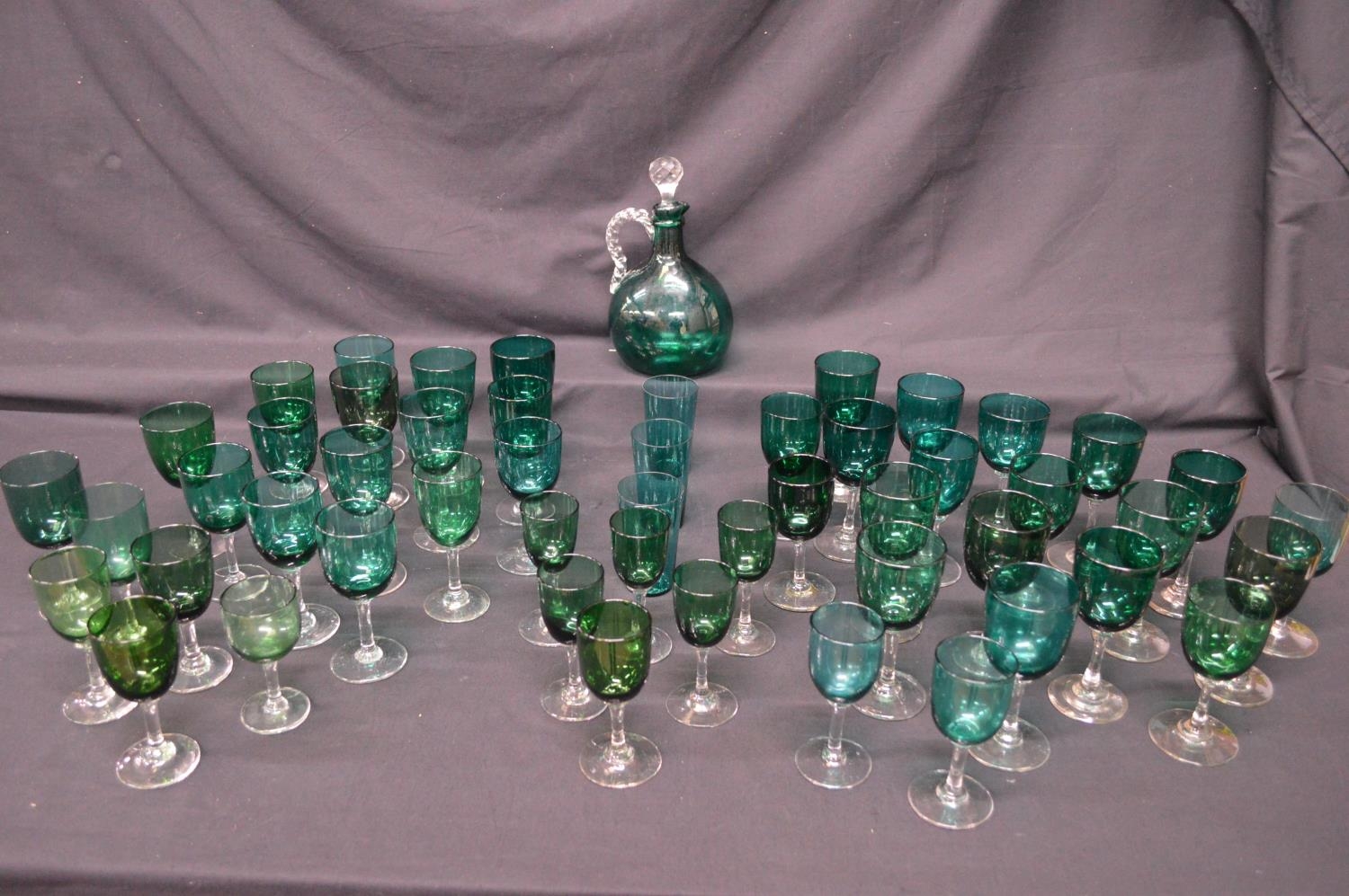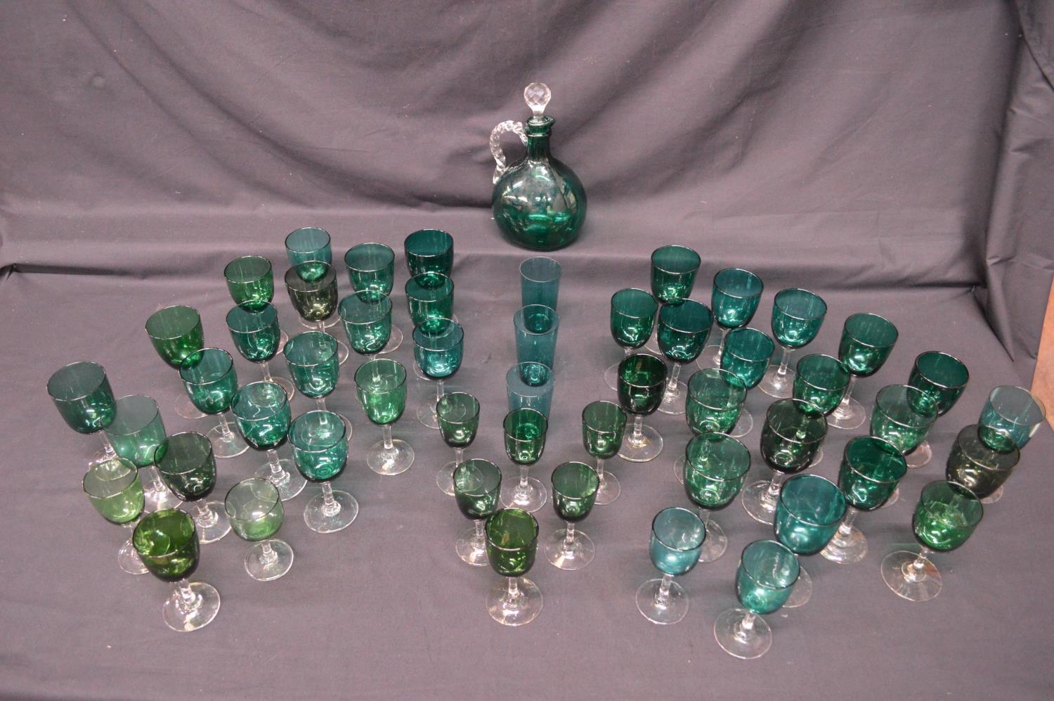 Collection of forty eight Georgian Green wine glasses having green bowls on clear stems and circular bases together with three beakers and a decanter