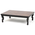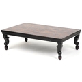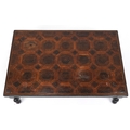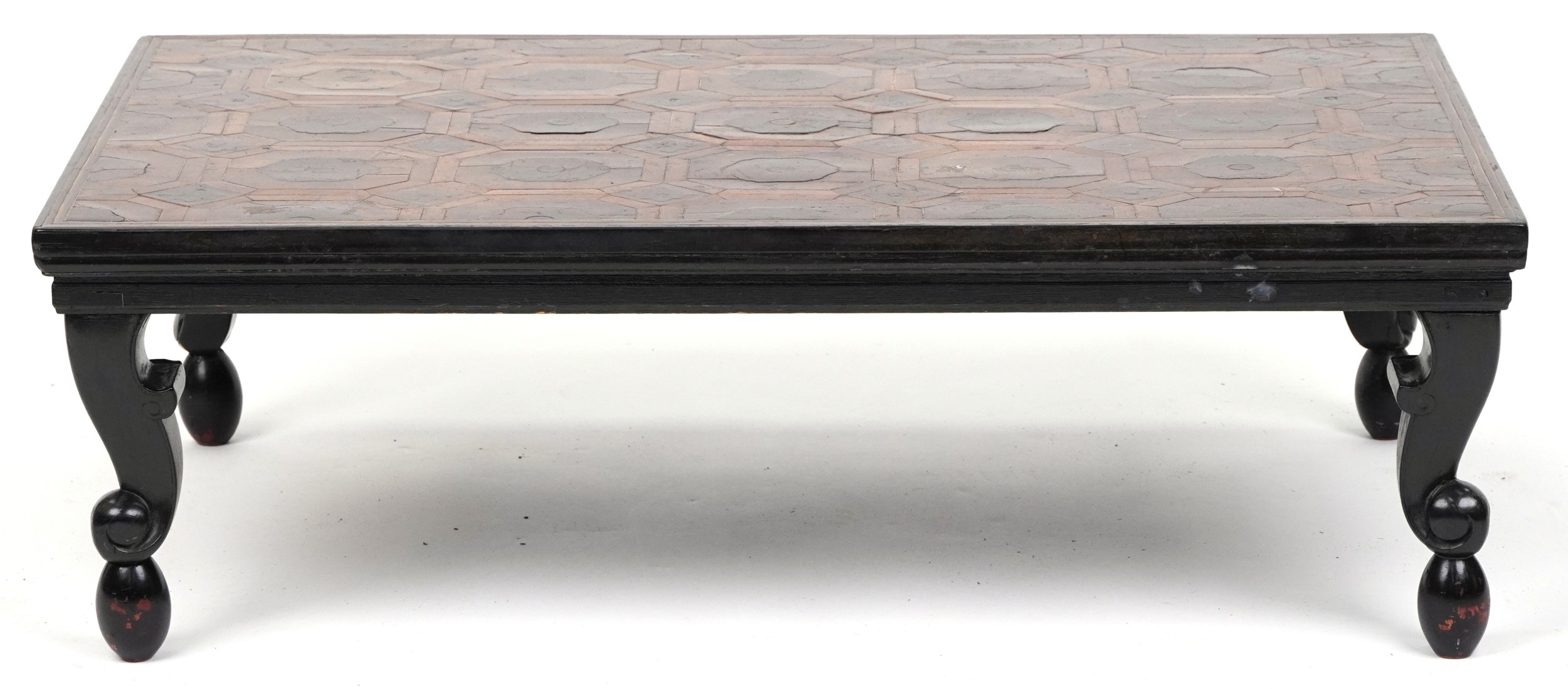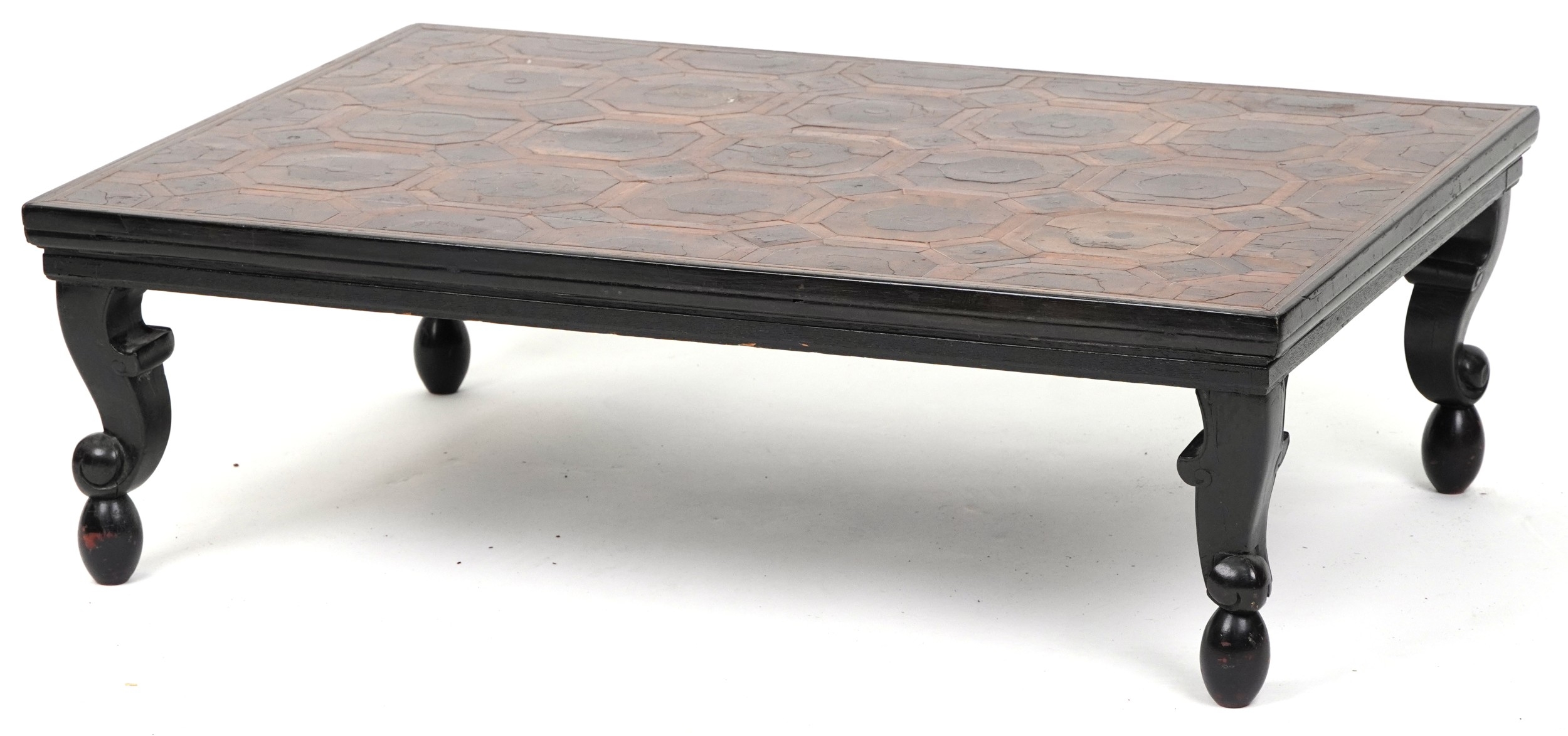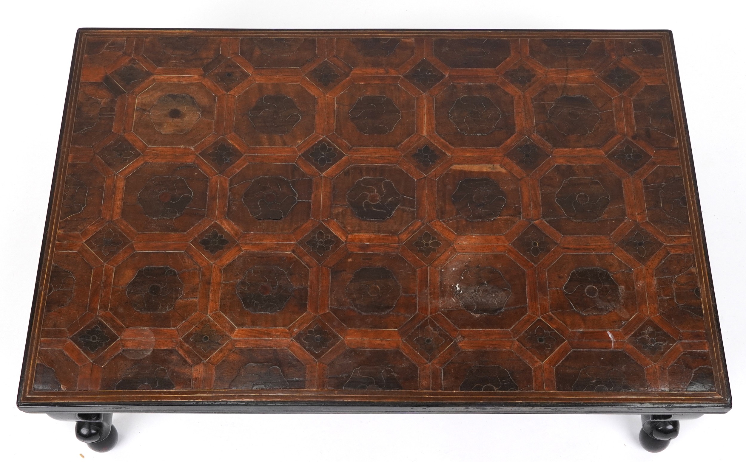 An 18th century mahogany and oyster veneered rectangular occasional table, the top with wire inlaid flower head decoration, raised on cabriole legs, 30cm H x 95cm W x 65cm D.
