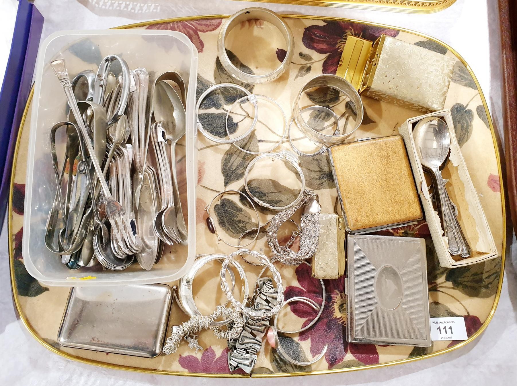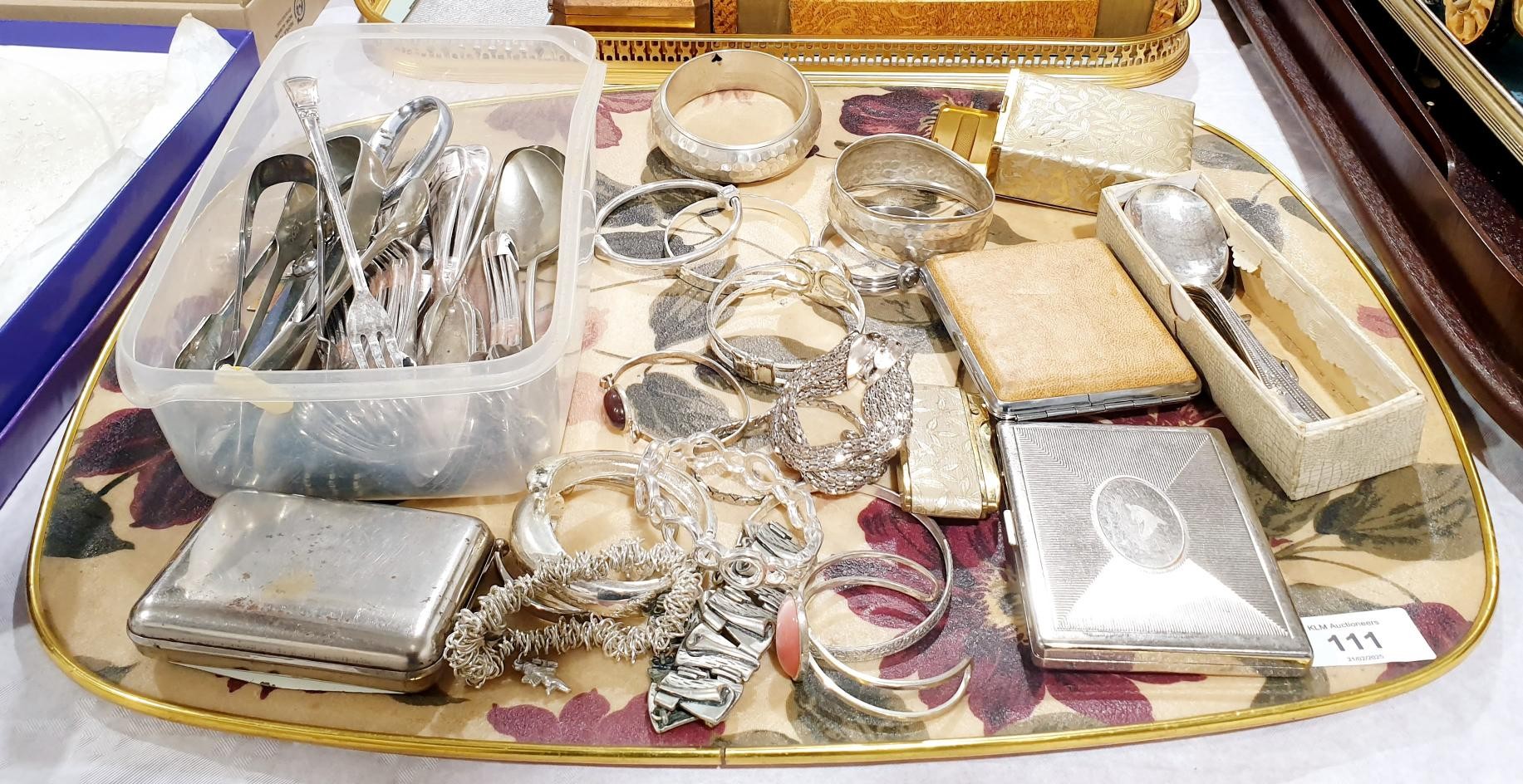 Flatware, cigarette cases and costume jewellery. UK shipping £14.