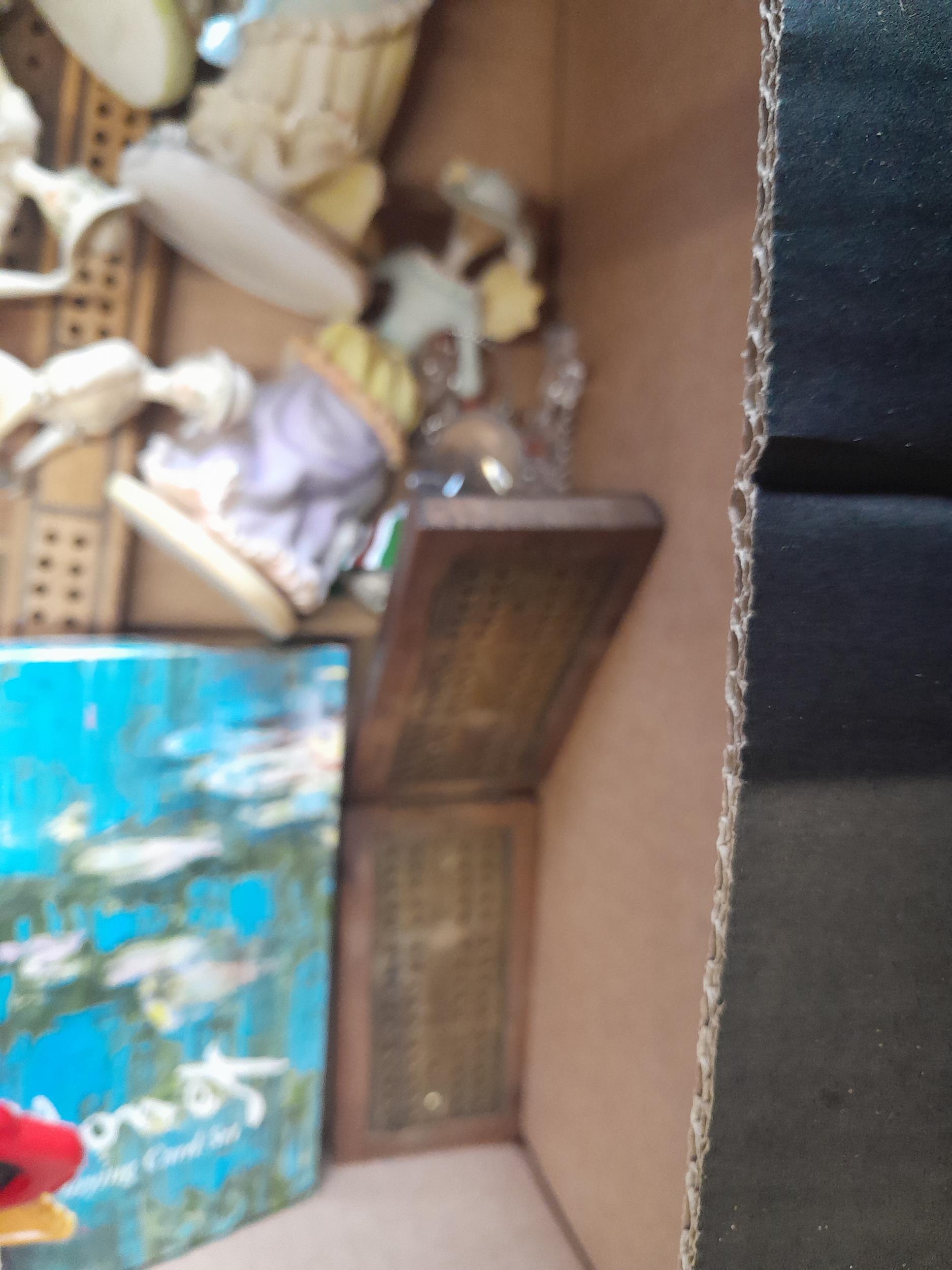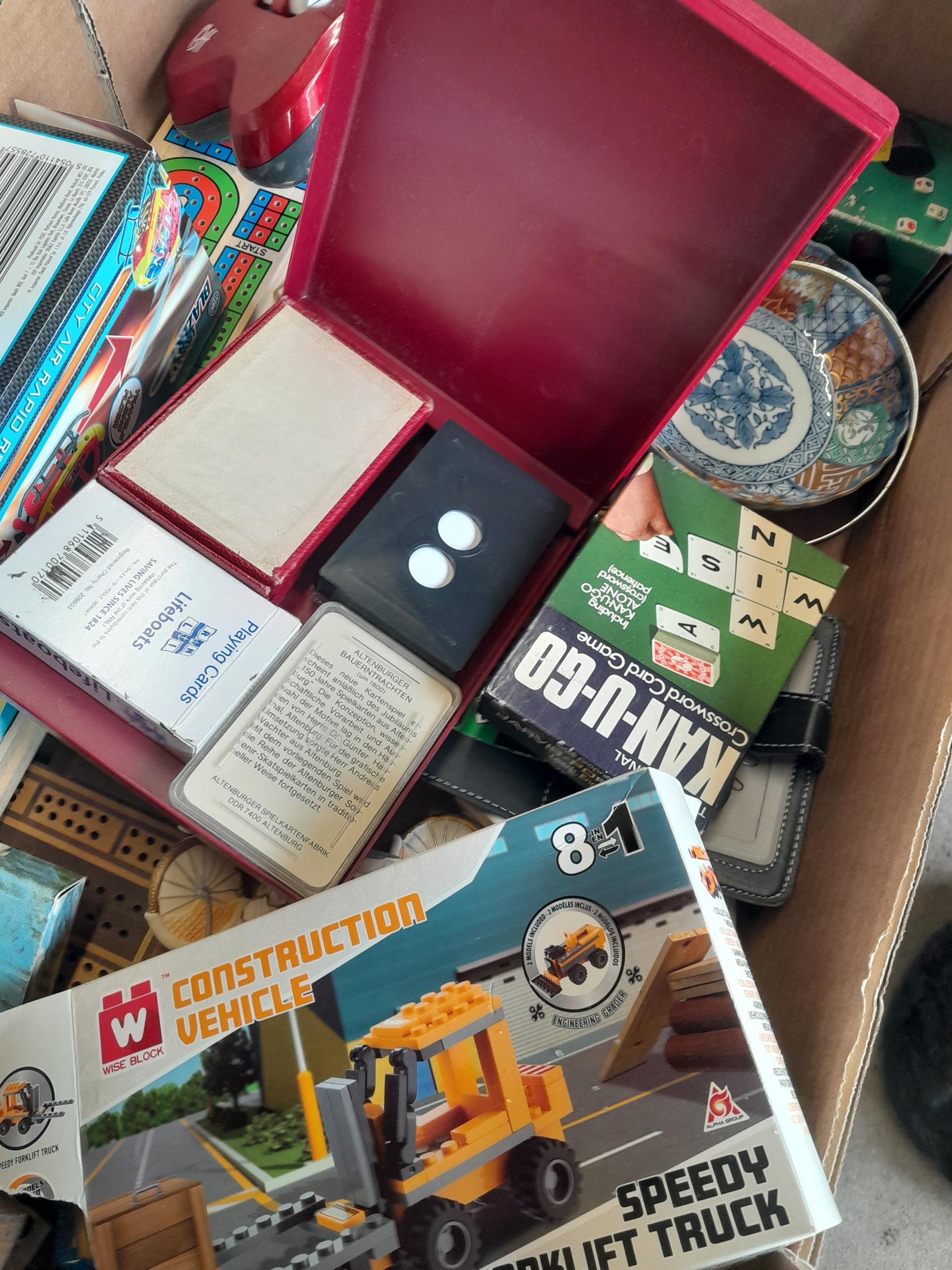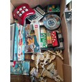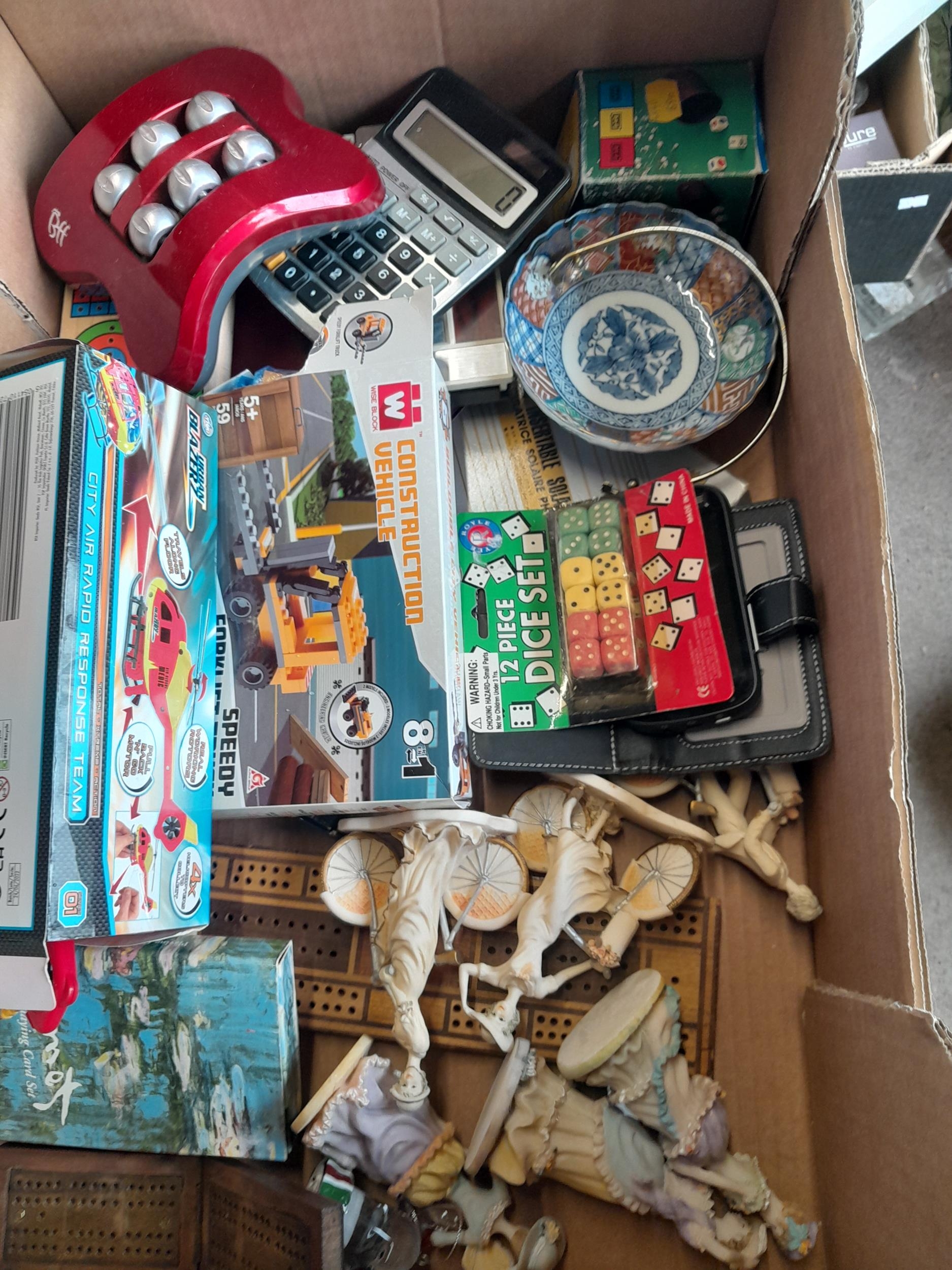 Box of assorted puzzles, reproduction folding cribbage boards, resin figures etc.