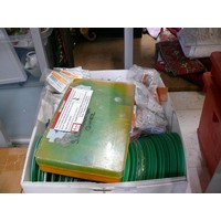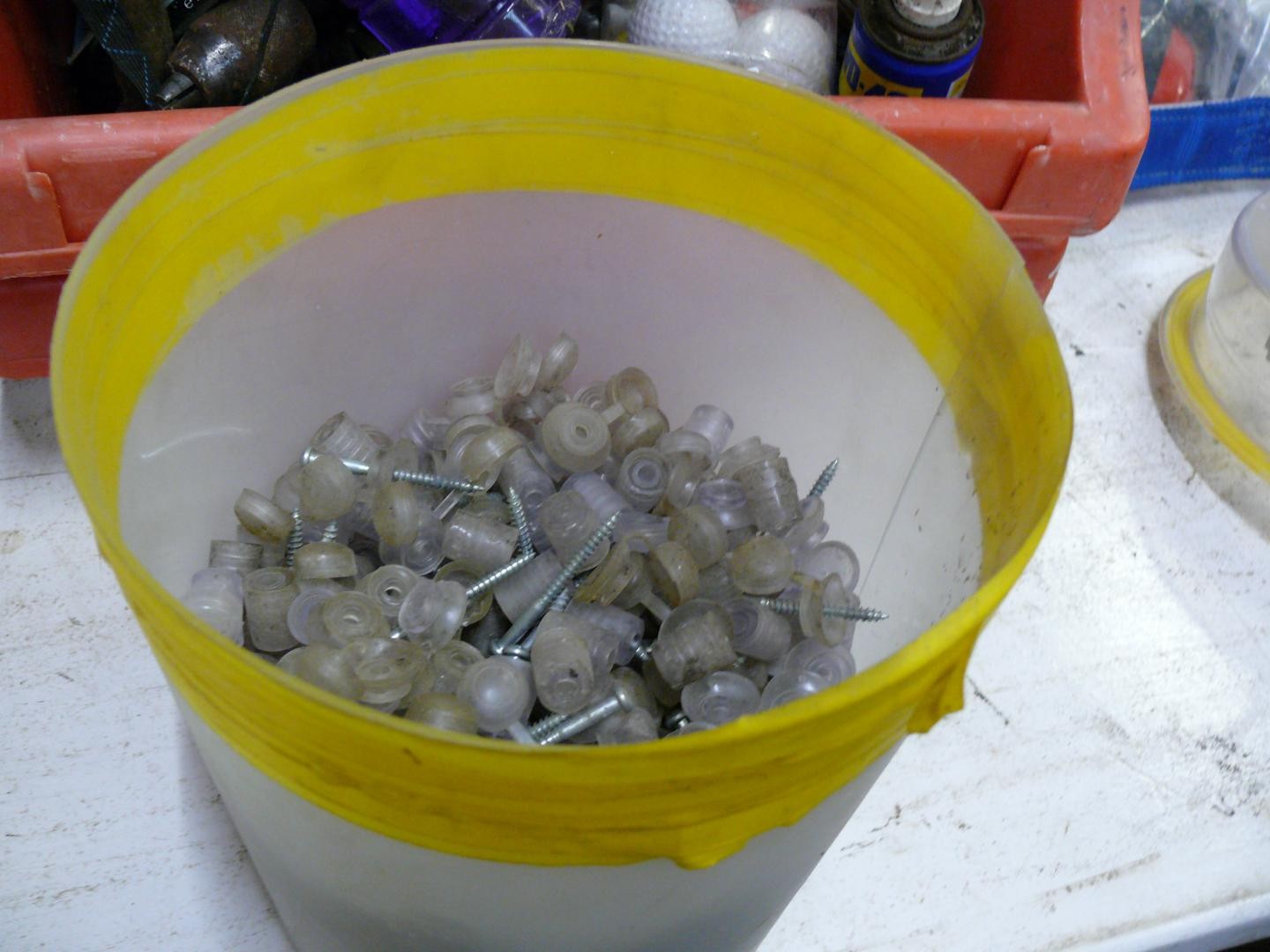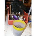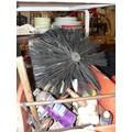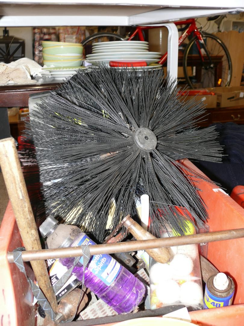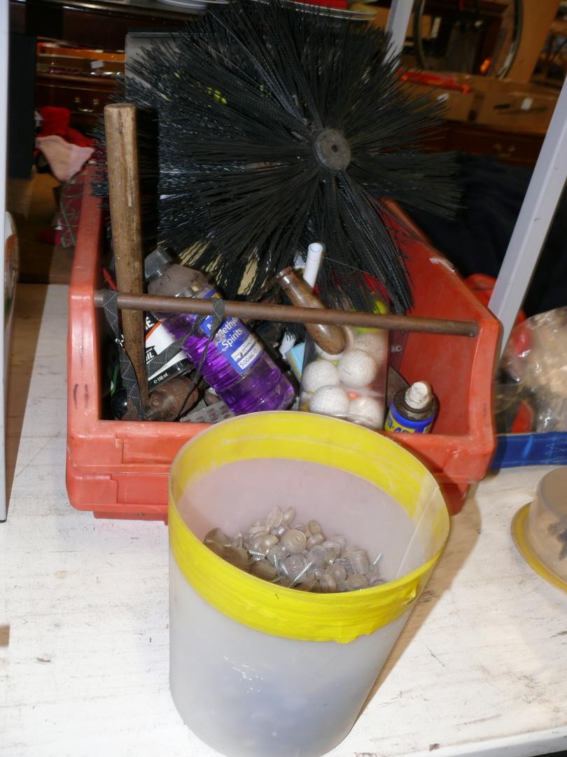 2 MAXI BINS FULL OF CORRUGATED ROOF FIXINGS, 2 CHIMNY SWEEP BRUSHES, AUTOSOCK TRACTION AID AND A SELECTION OF VARIOUS HAND TOOLS