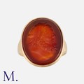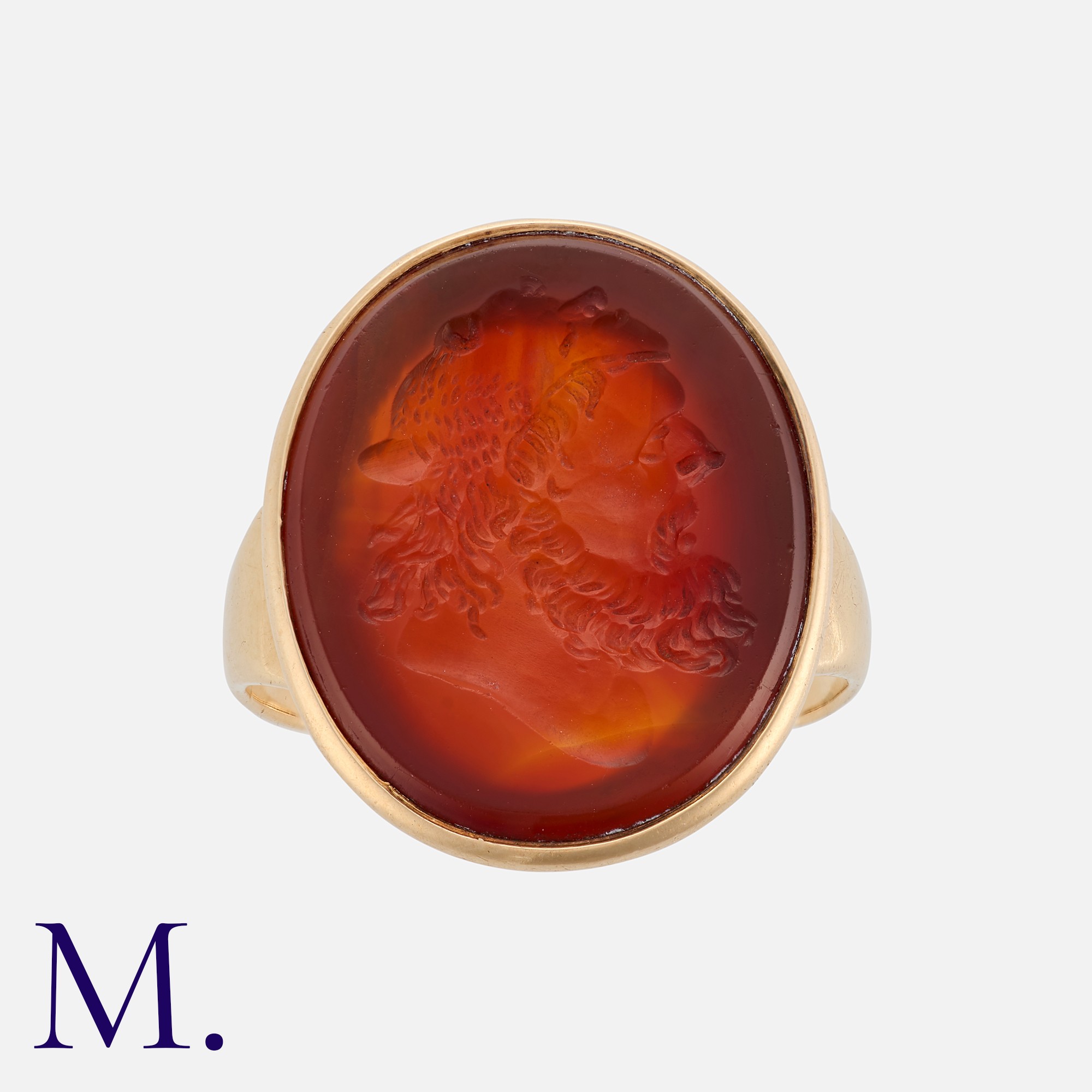 A Carved Carnelian Intaglio Ring in yellow gold, set with a carved carnelian intaglio depicting the profile of a classical man. Unmarked, tests indicate 9 carat gold.