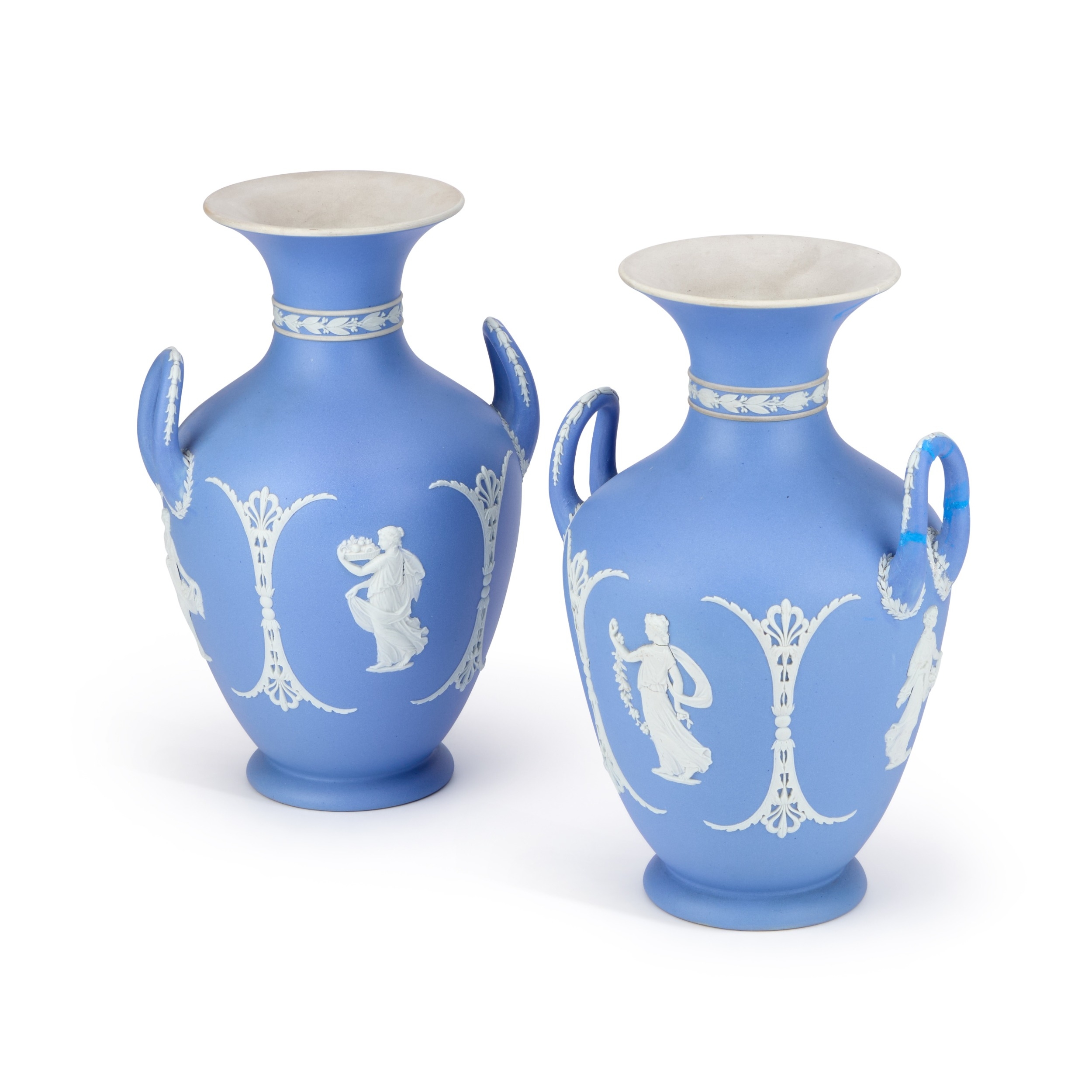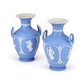 A PAIR OF WEDGWOOD BLUE JASPER TWO-HANDLED VASES 19TH CENTURY