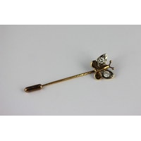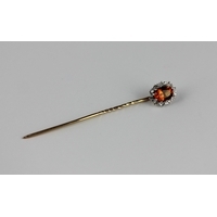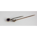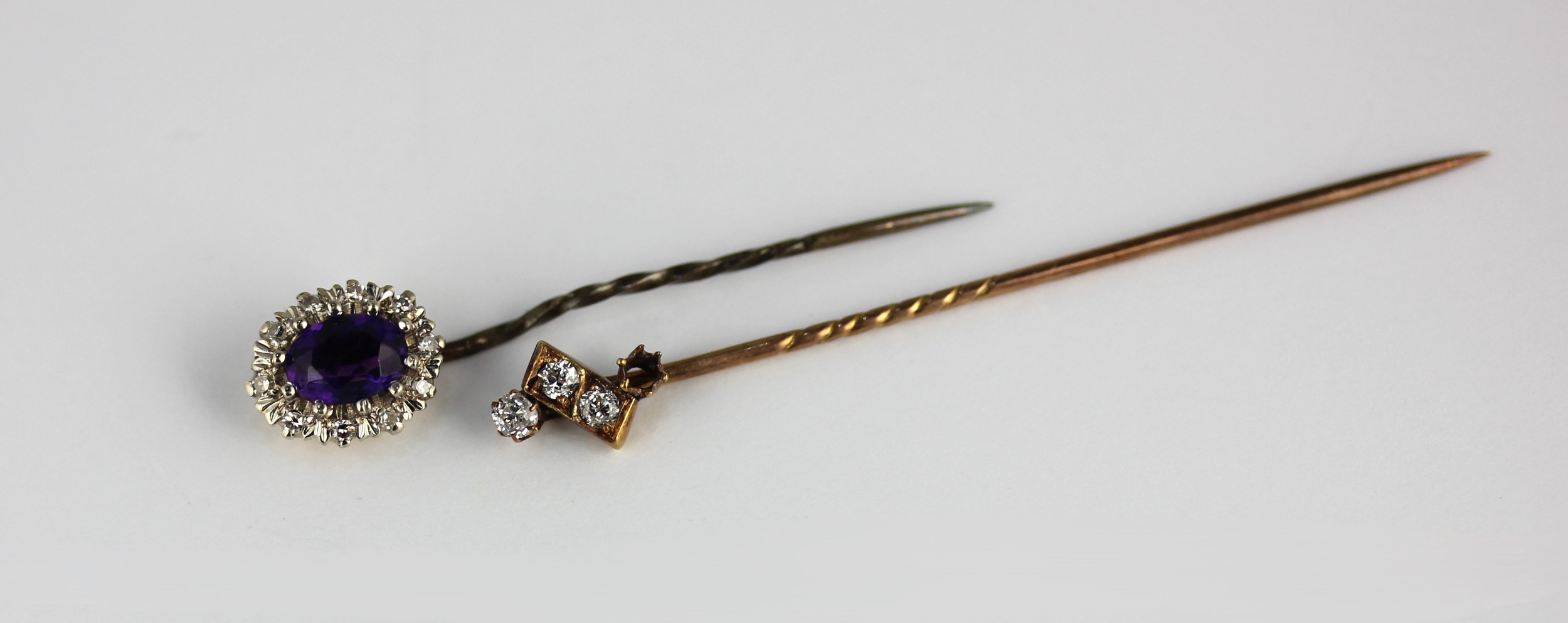 A gold amethysts and diamond oval cluster stick pin and a gold stick pin mounted with three cushion shaped diamond and one further gemstone lacking combined gross weight 3.4g