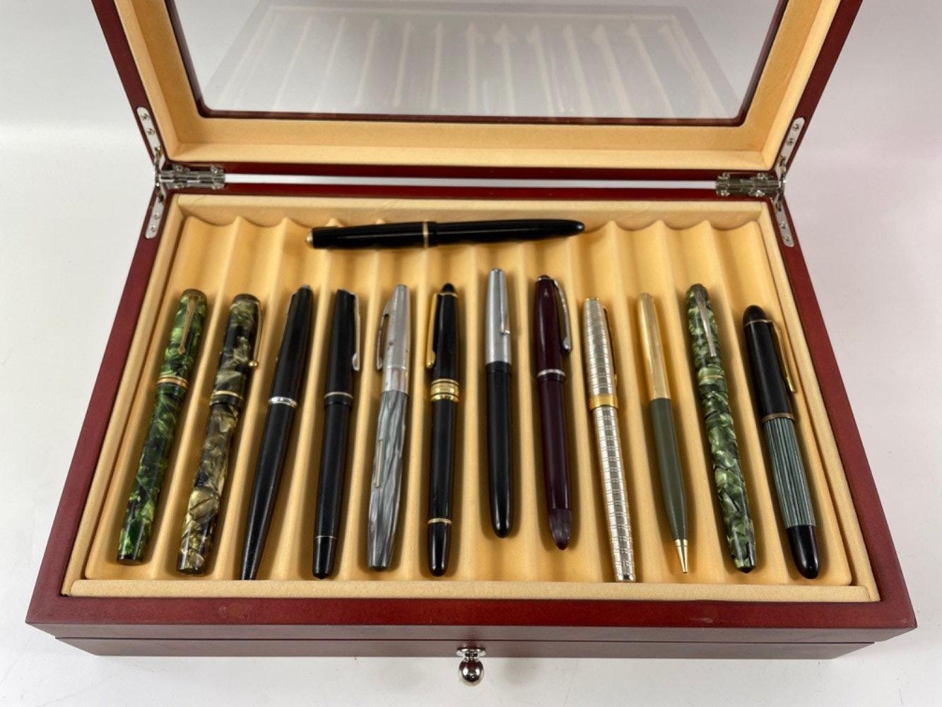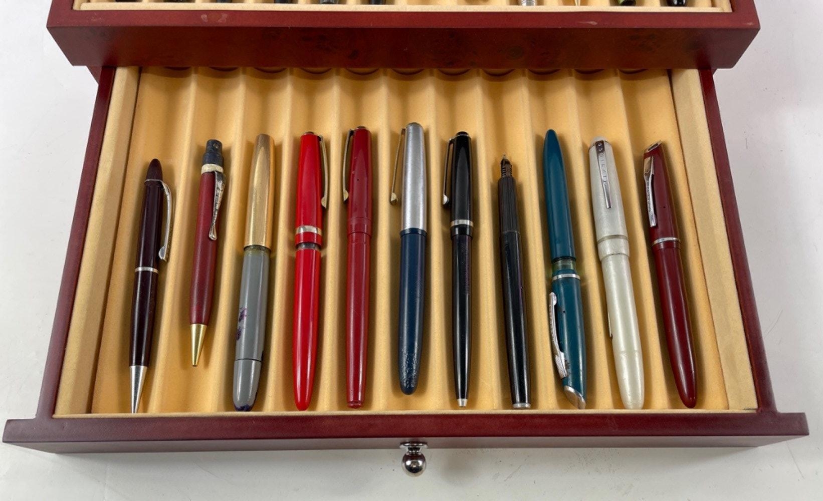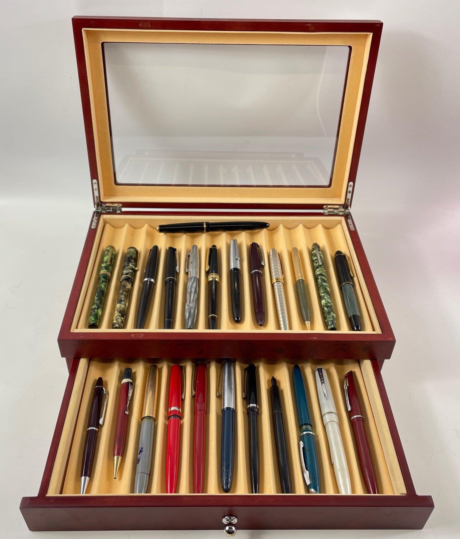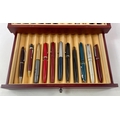 Modern 23 slot quality wooden Pen collectors cabinet complete with 24 vintage mainly fountain pens. Includes Parkers, Mentmore, Conway Stewart, Platignum etc.