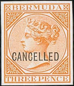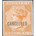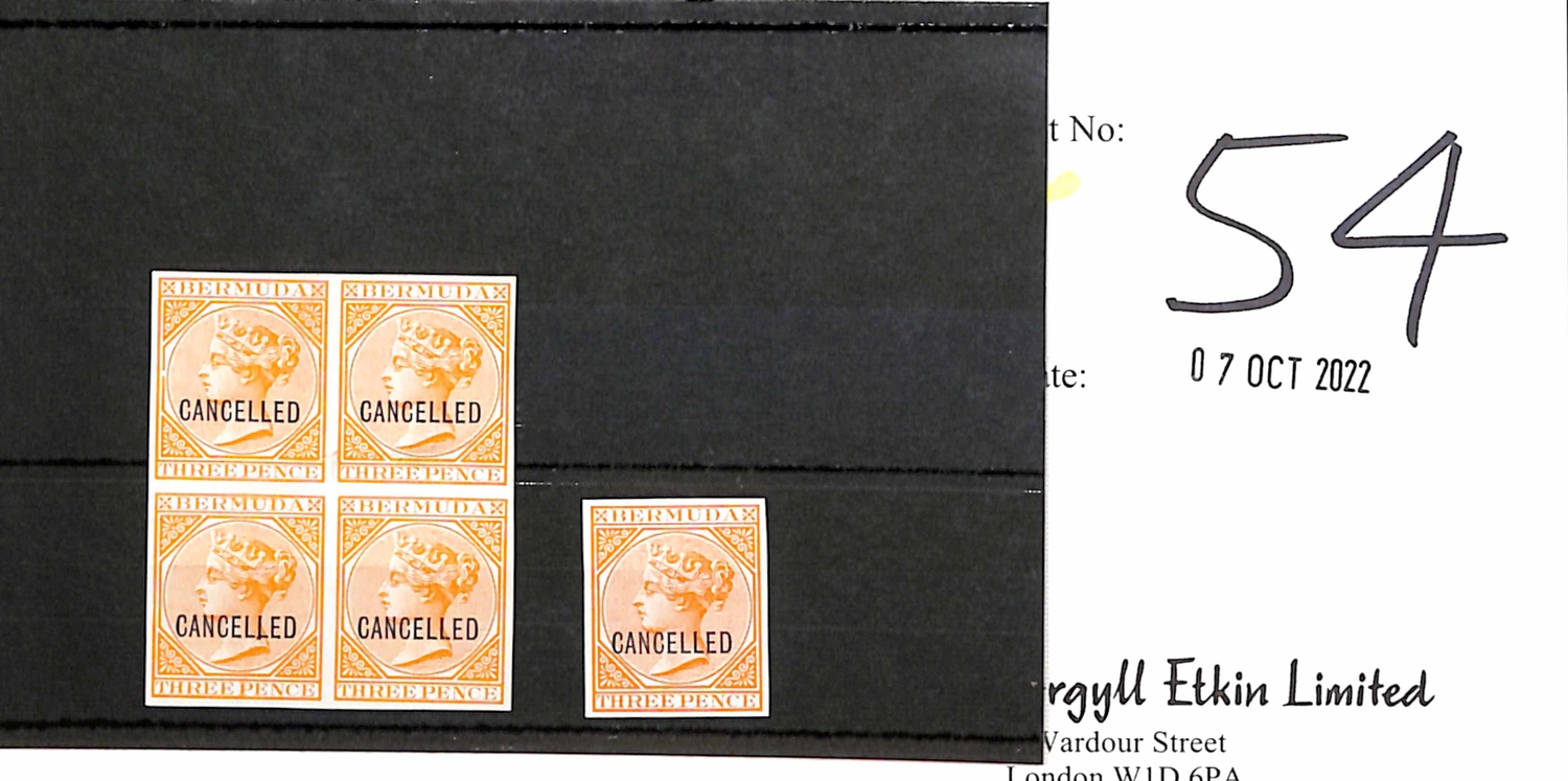 3d Orange, imperforate plate proof block of four and a single on thick surfaced paper, no watermark, each overprinted "CANCELLED", the single in a deep shade. (5). Photo on Pages 14 & 18.