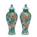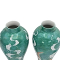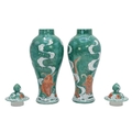 Pair of Chinese style vases and cover decorated with carp to the lid and a cloud dragon a carp to the body, H25cm. Marked with a crown and Staffs to the base.