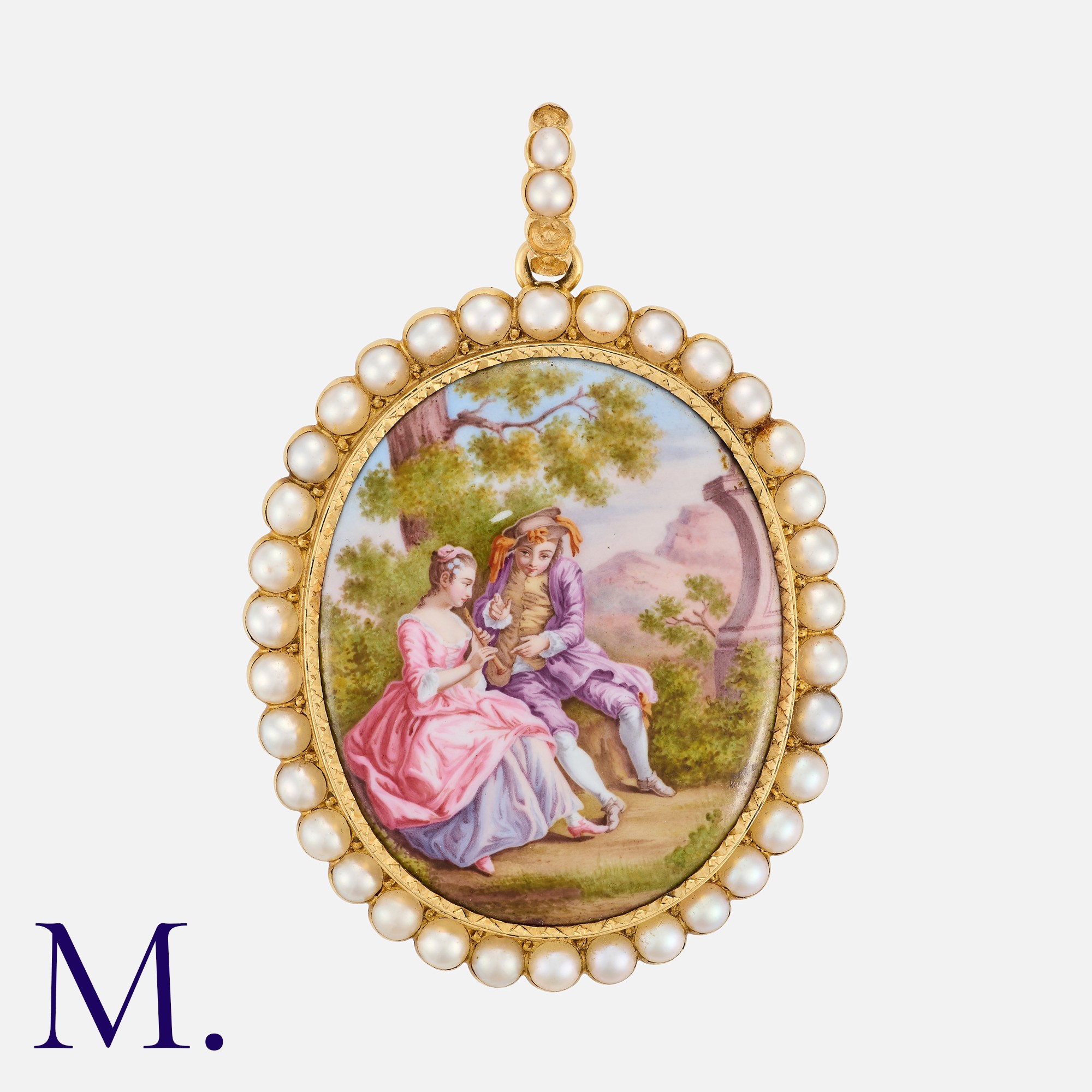 An Antique Miniature Pendant in 18K yellow gold, with enamel miniature of a romantic gallant scene of young lovers sitting in a countryside setting with feet touching. French Owl mark and tests indicating 18ct gold. Pearl-set surround and bale (removable bale fitting).