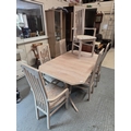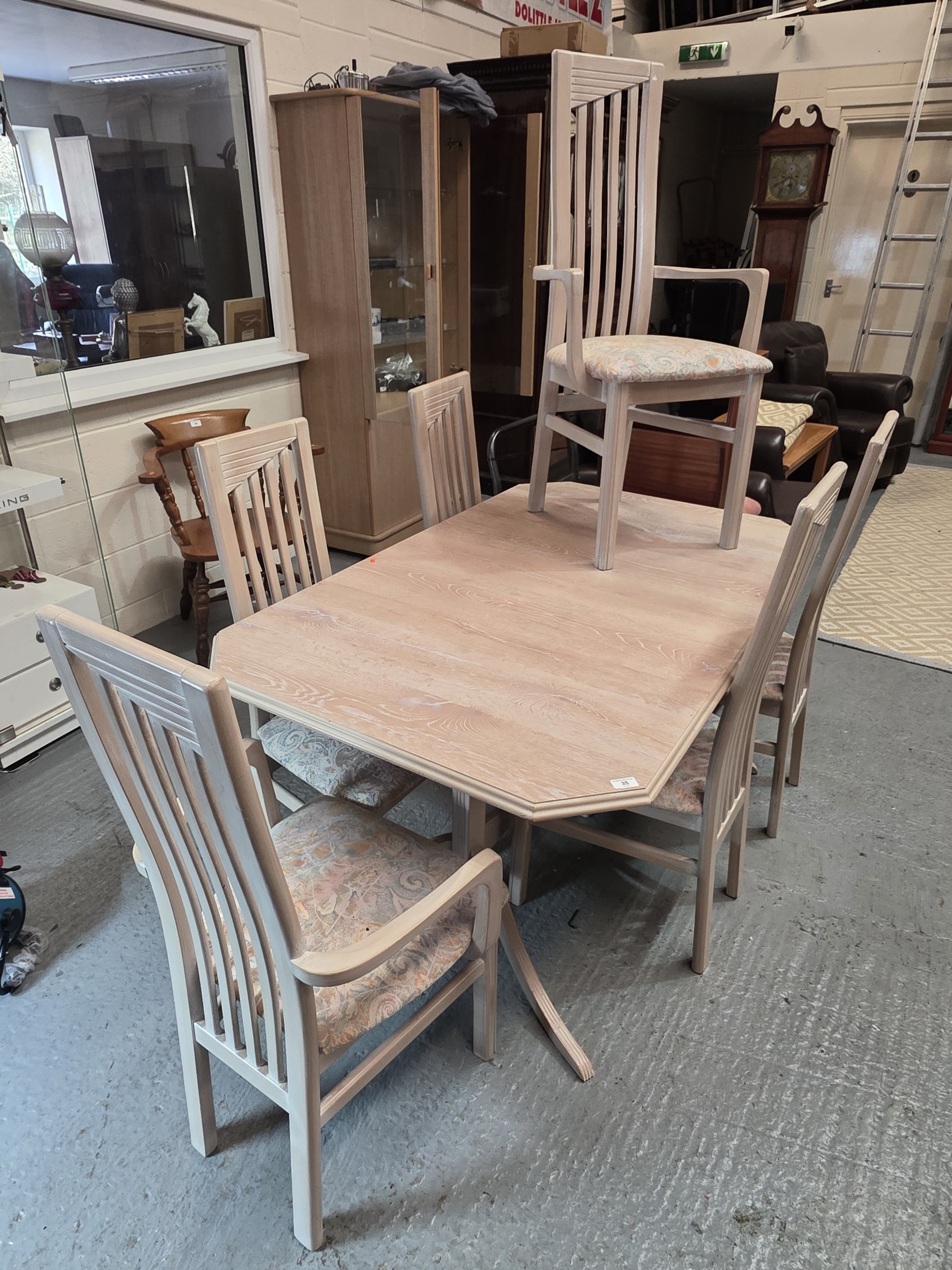 BLEACHED OAK EXTENDING DINNING TABLE AND SIX CHAIRS