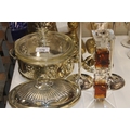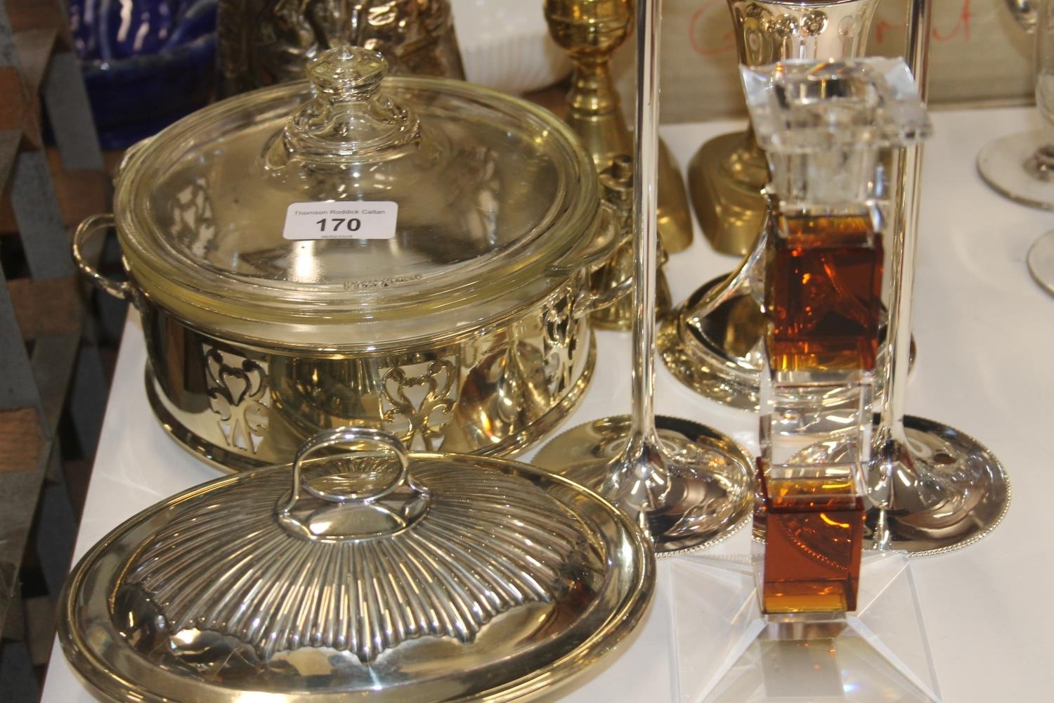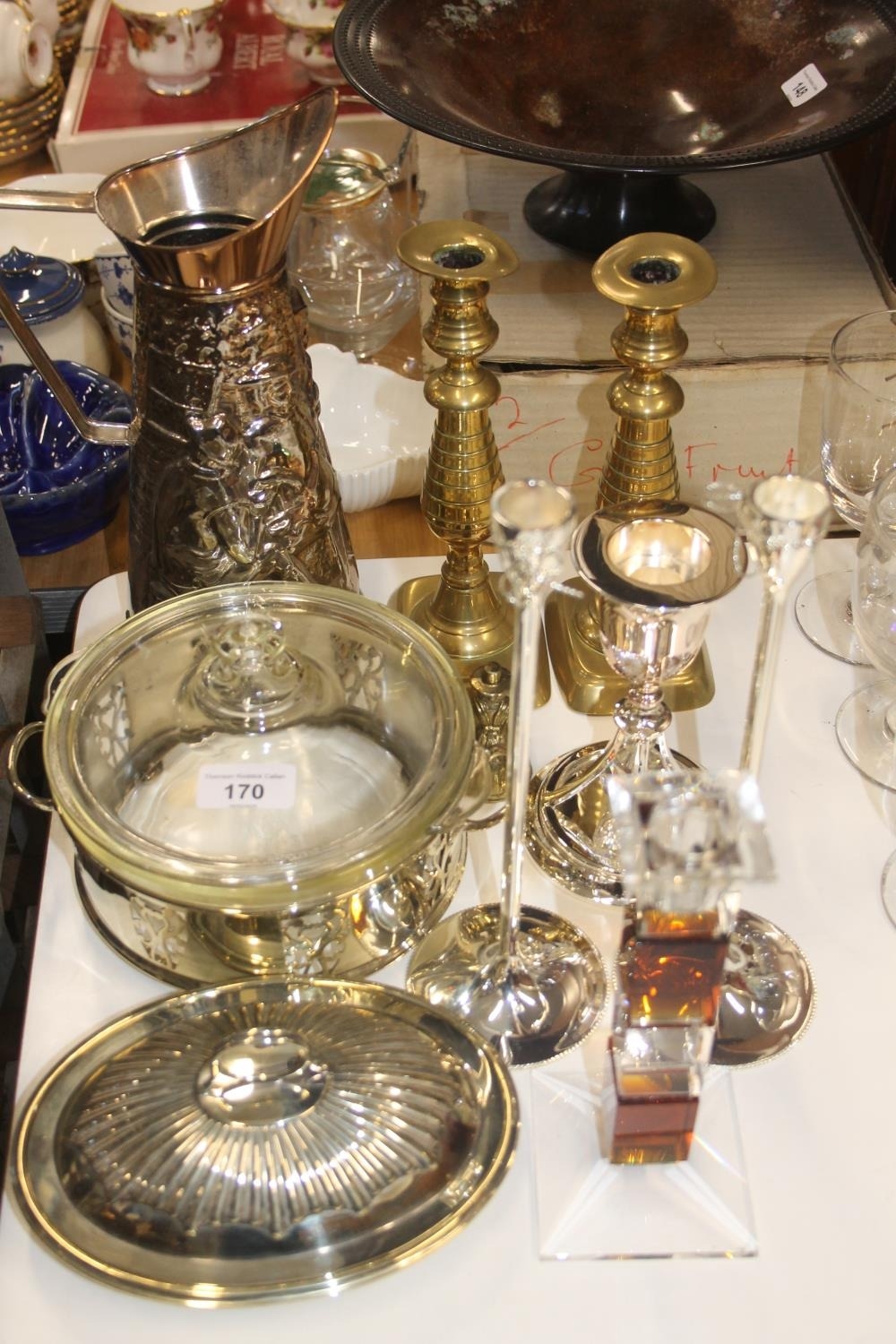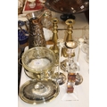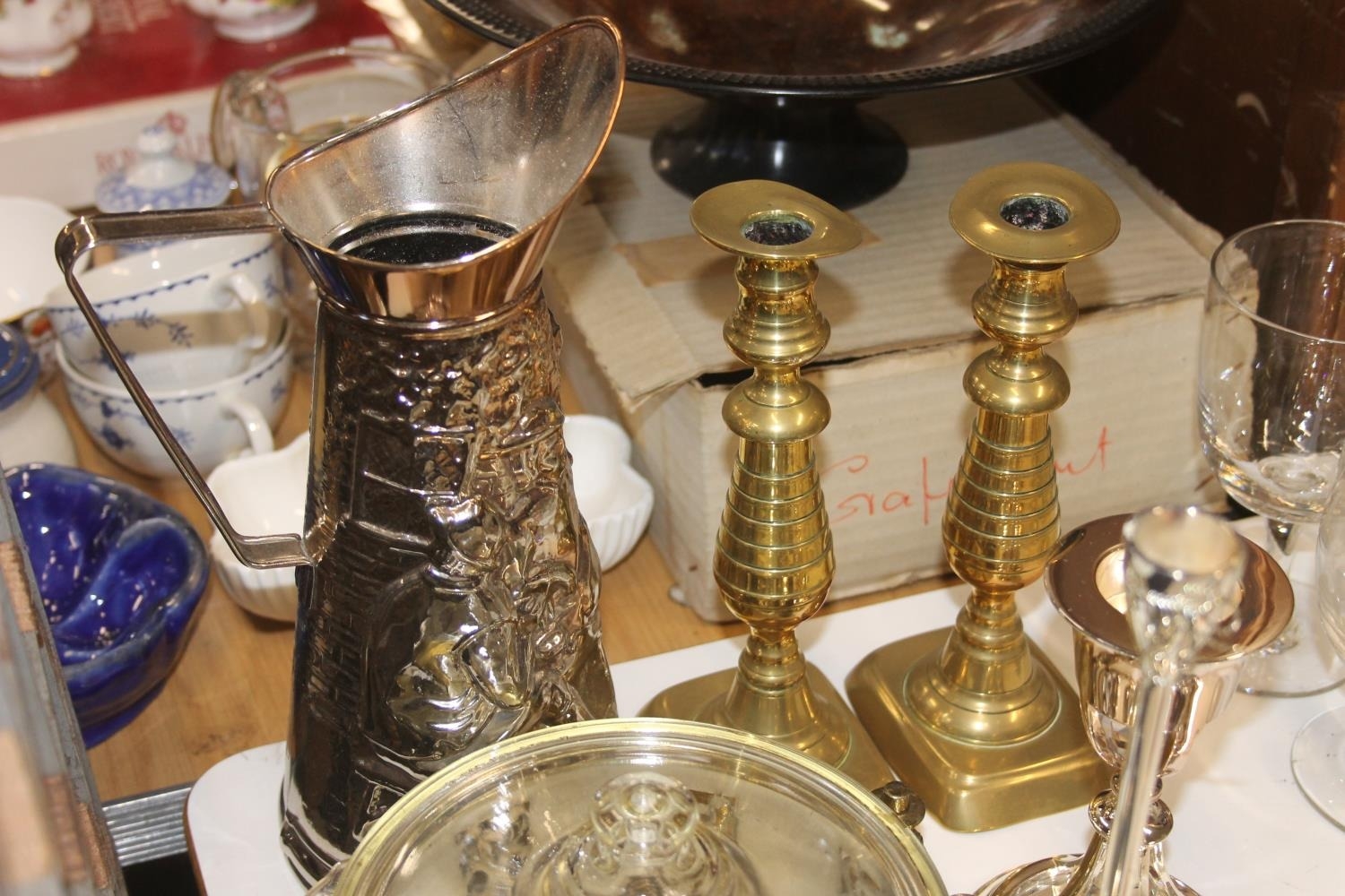 A pair of brass candlesticks, silver plated candlesticks, jug, glass art deco style candlestick etc.