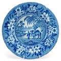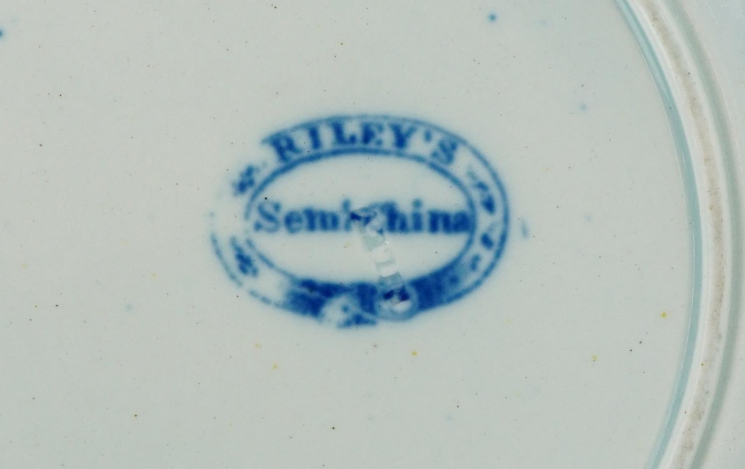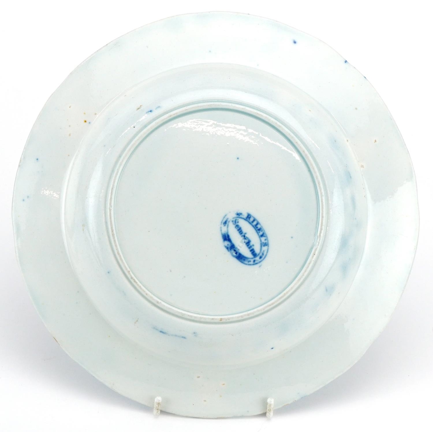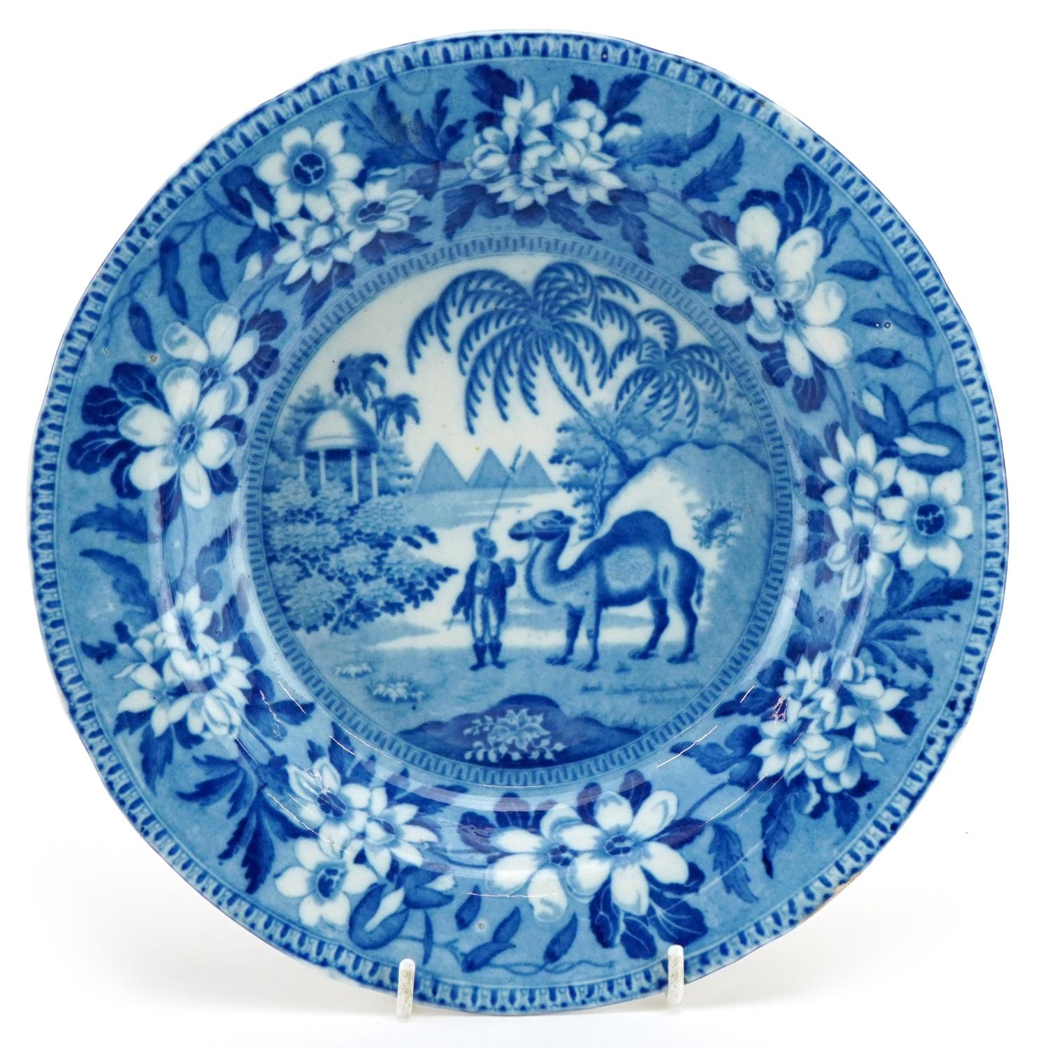 A 19th century Riley's bowl transfer printed in blue and white with an Egyptianesque scene, 25cm in diameter.