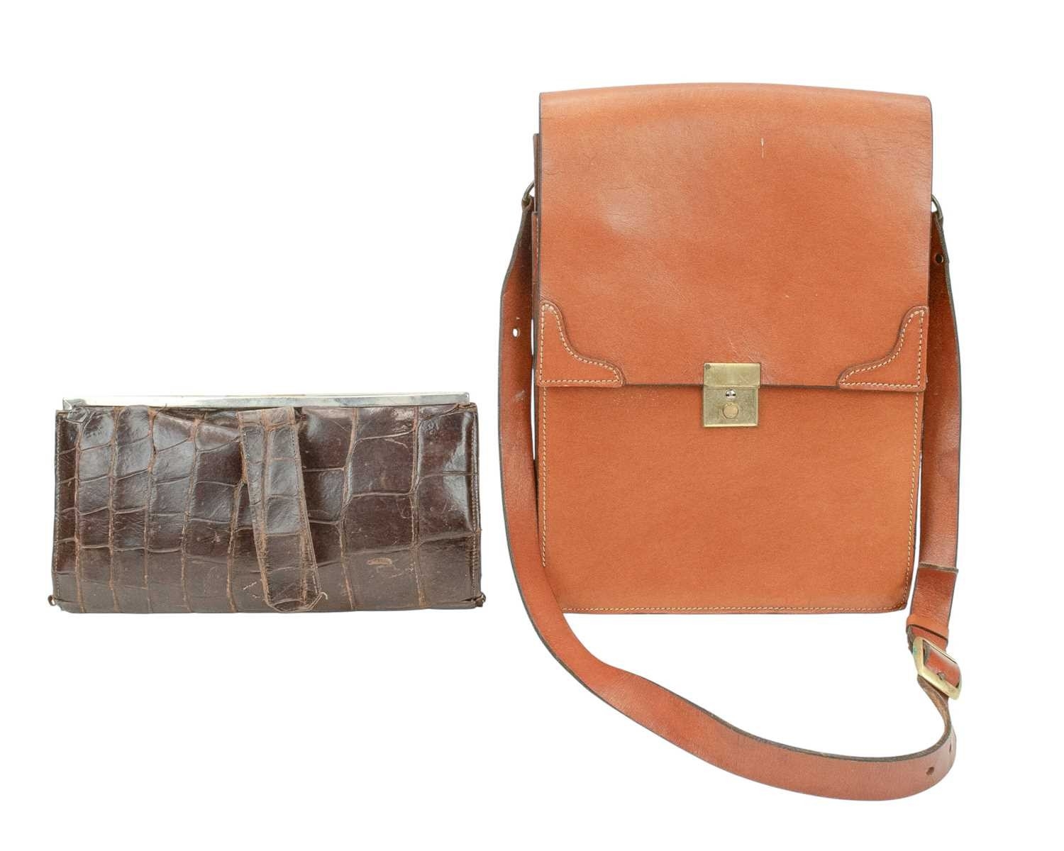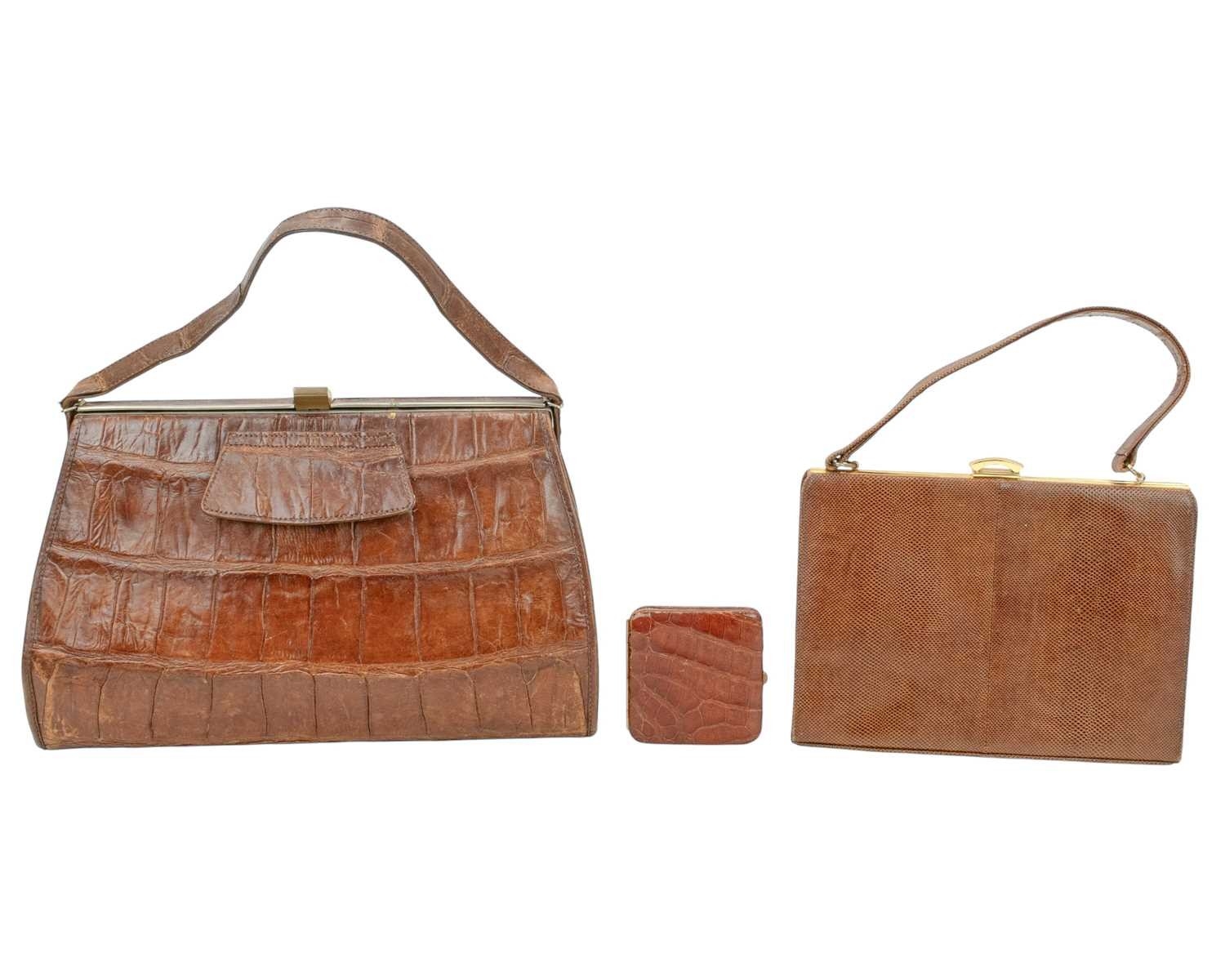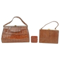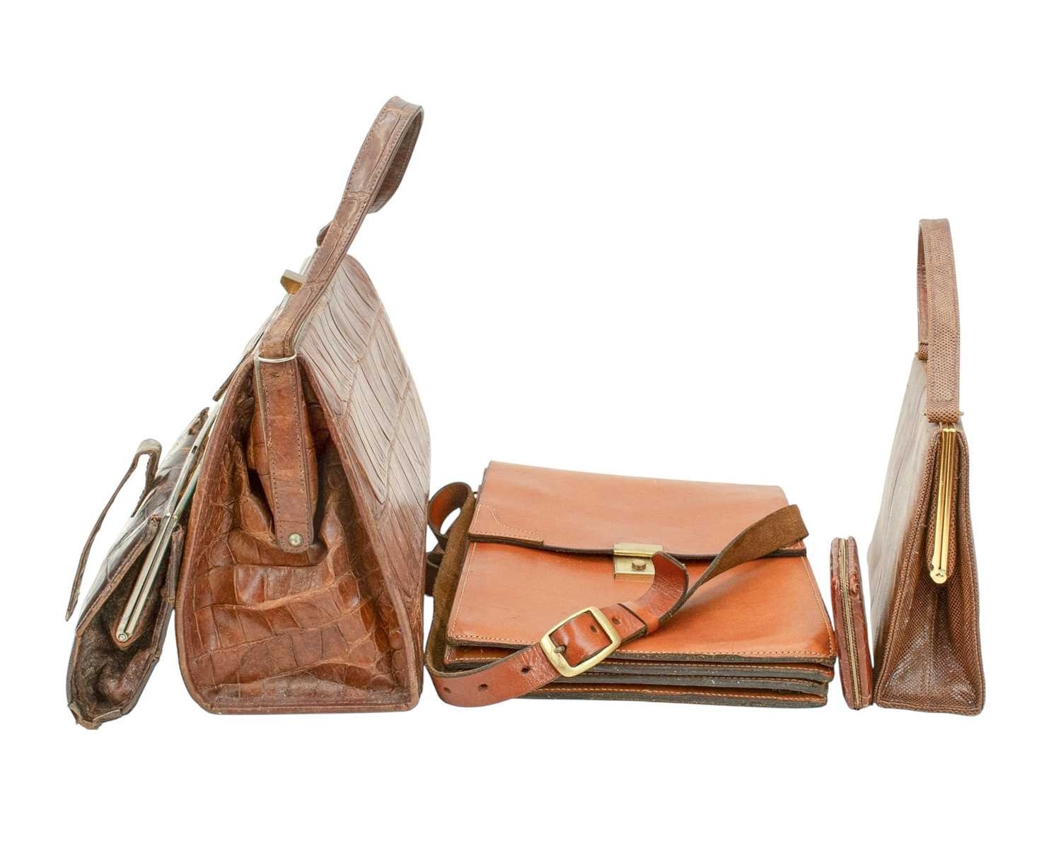 A crocodile skin handbag with matching purse. Circa 1940/1950, clasp fastening, suede lining with internal pockets, width 36cm, height 38cm including the handle, depth 15cm, with a leather satchel bag, a crocodile skin clutch bag, a crocodile skin cigarette case and a Marquessa handbag and matching purse (7).