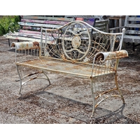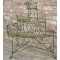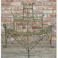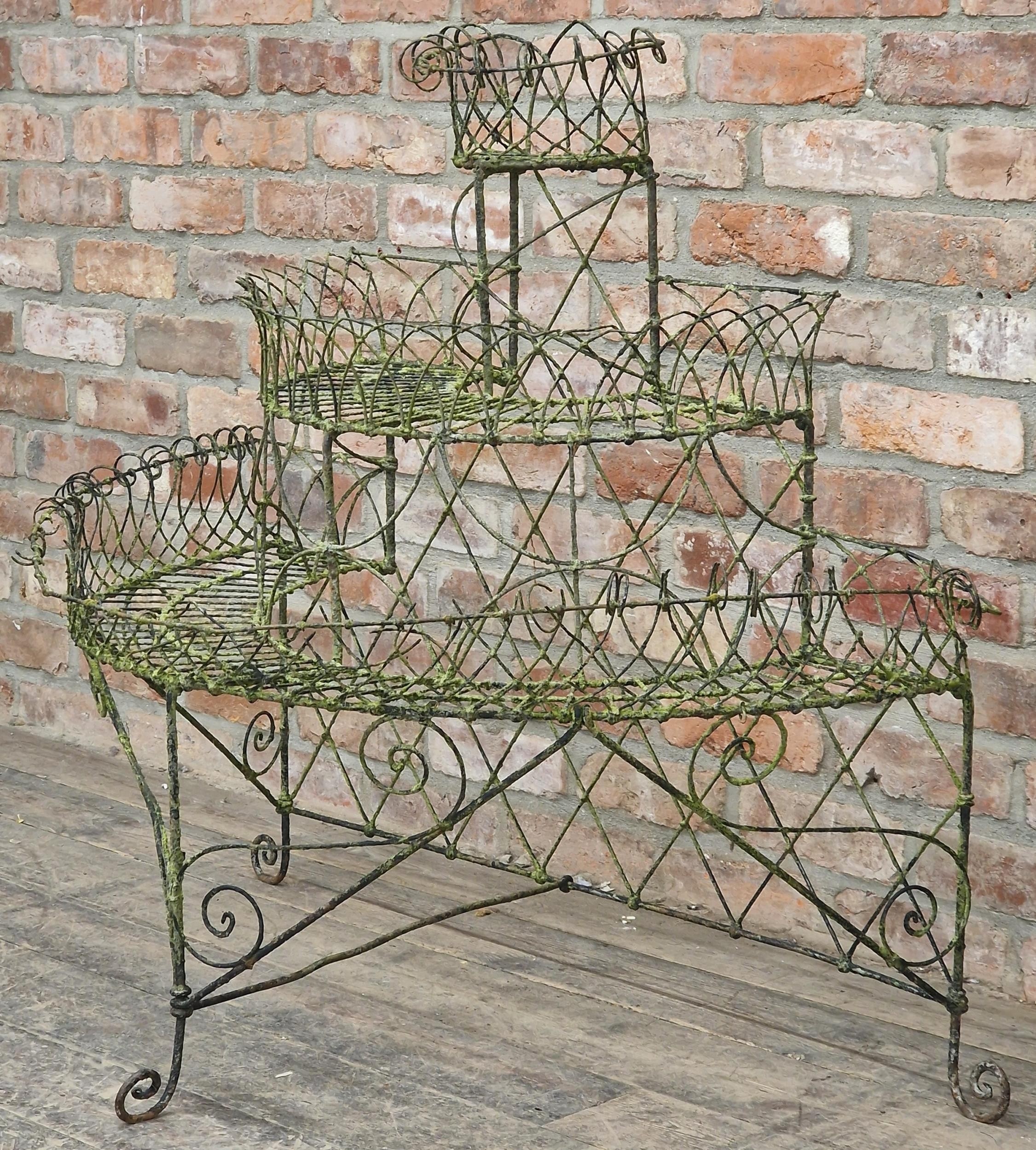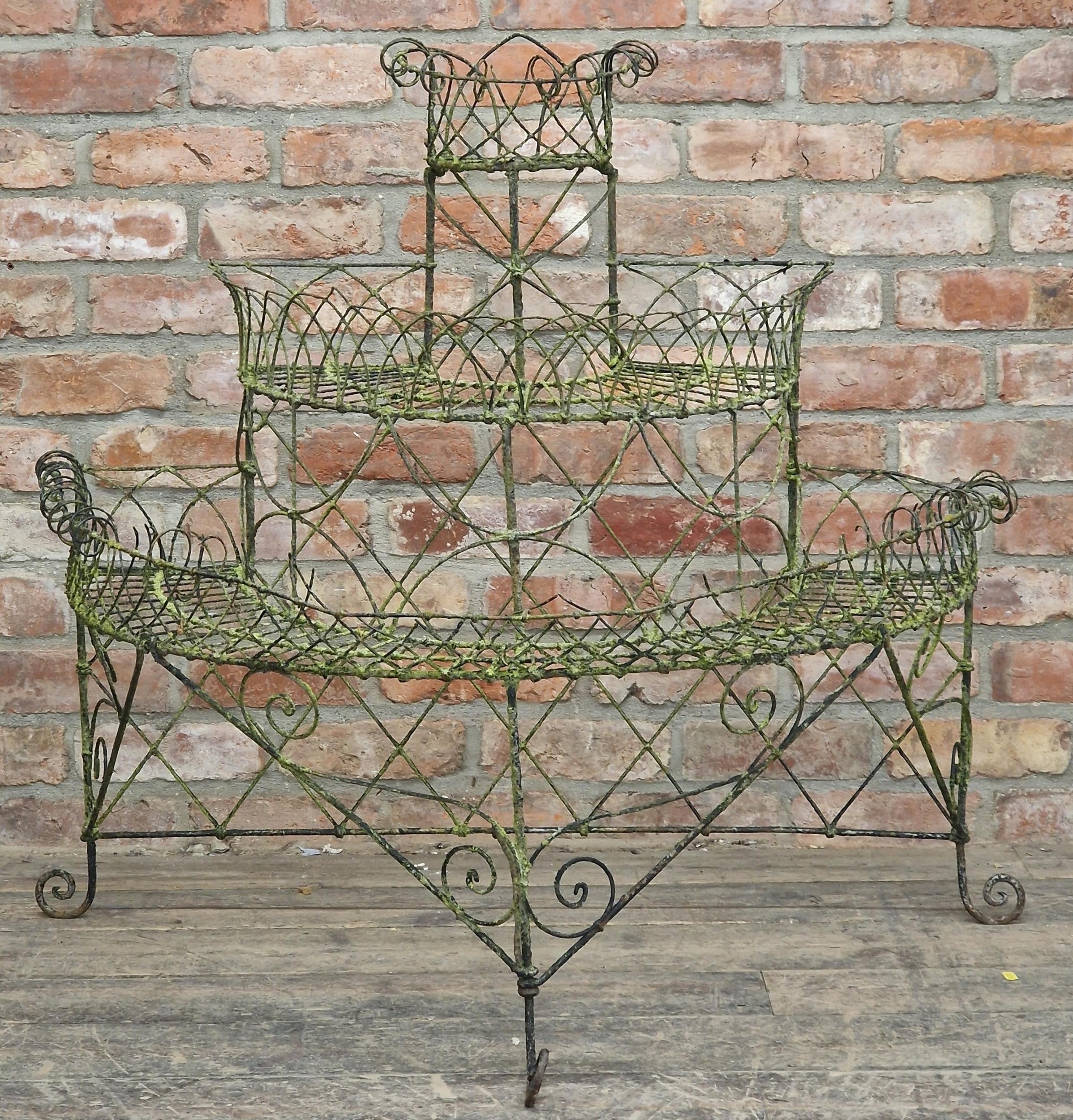 Victorian wirework demi lune three tiered plant stand with scrolled detail, H 100cm x W 106cm x D 60cm (AF)