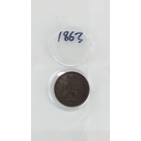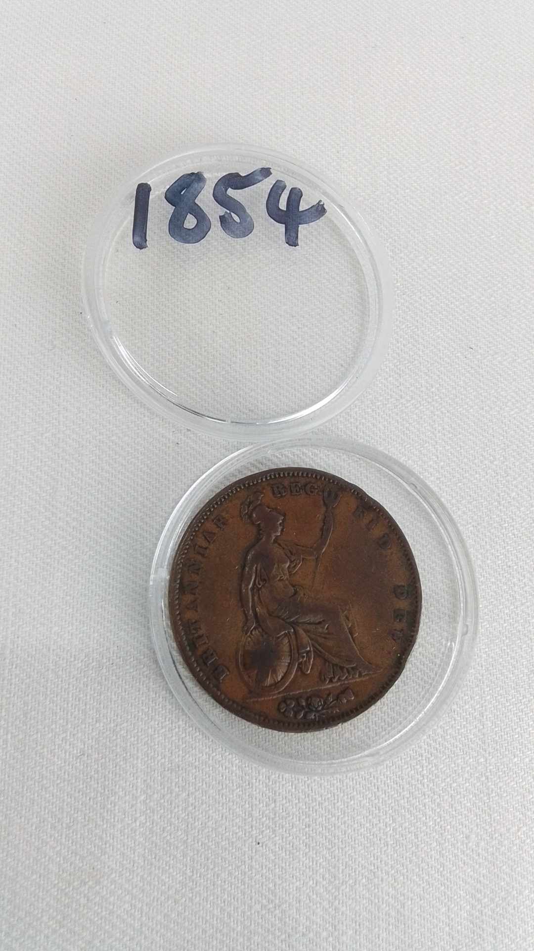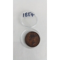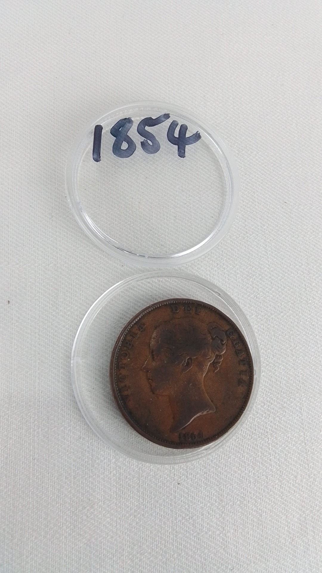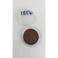 One Victorian bronze penny, 1854, obverse with laureate head of Queen Victoria and reverse with seated Britannia and trident.