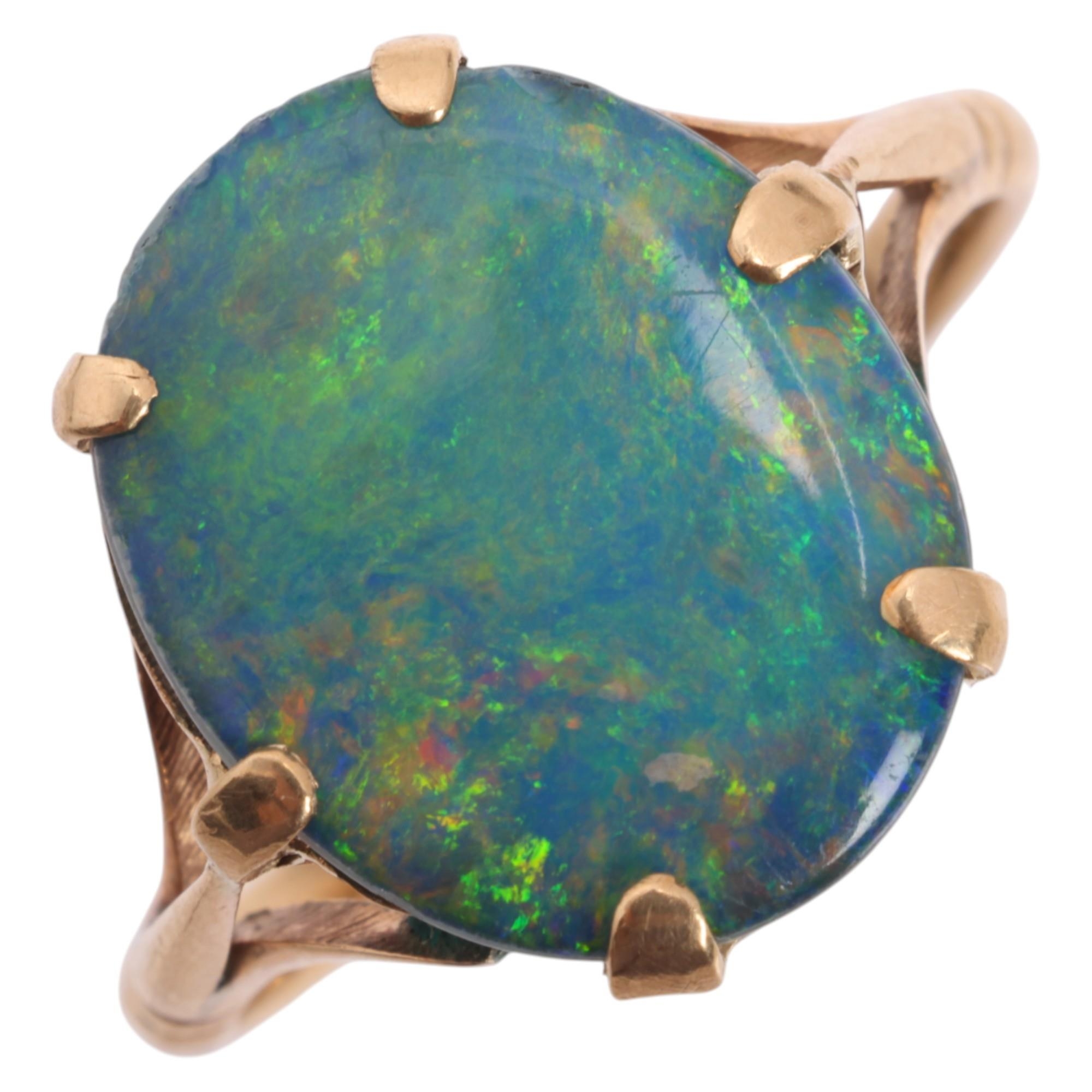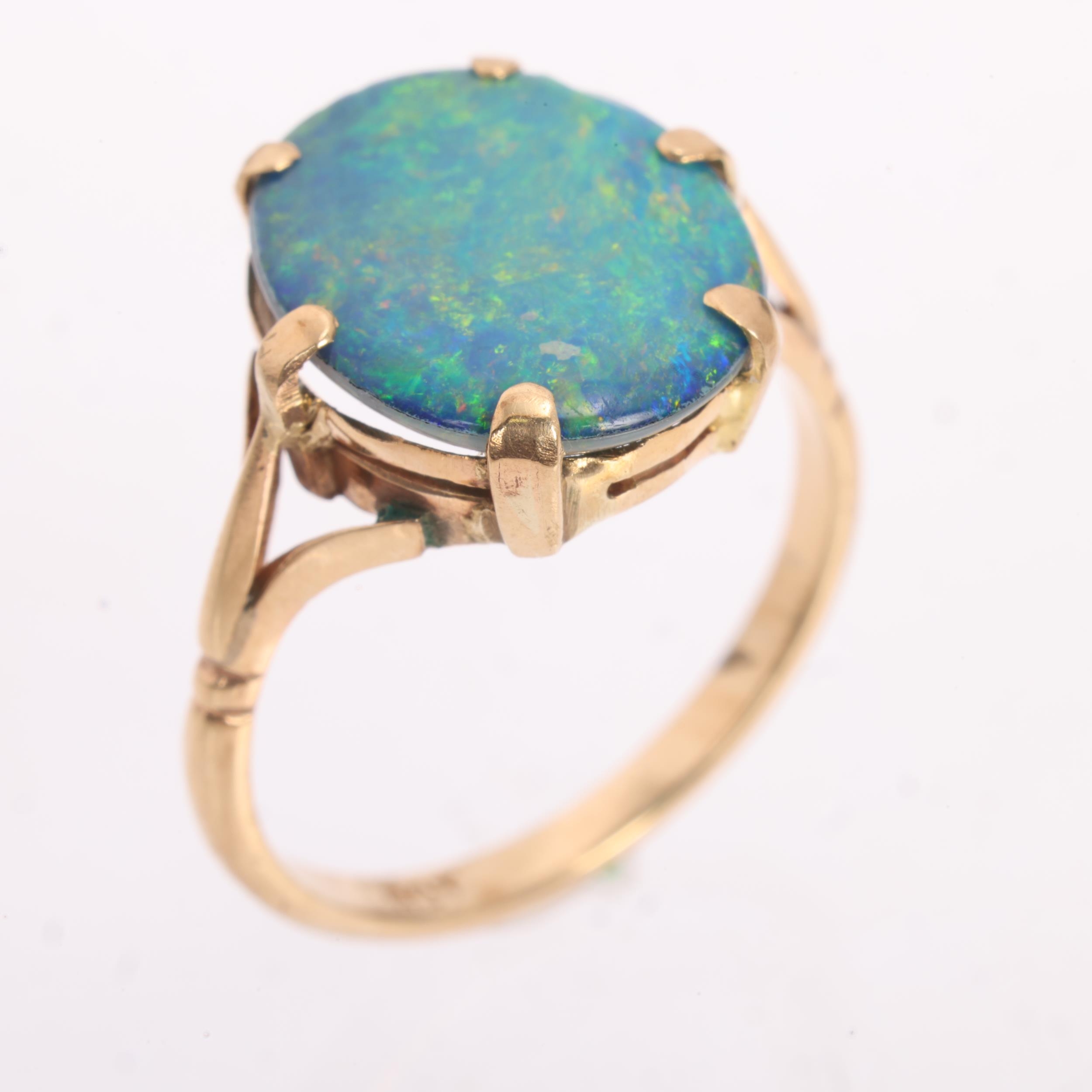 A Vintage 9ct gold black opal doublet dress ring, claw set with oval low cabochon black opal doublet, setting height 13mm, size K, 2g