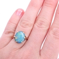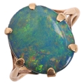 No damage or repair, opal has a very good play of colour, mostly reds yellows and greens, stone comprising 2 opal slices cemented back to back, several tiny edge nicks and chips, general wear to mount, marked 9ct