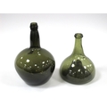 An XVIII Century Green Glass Wine Bottle, of onion form, high nicked base, 21cm high; Another Onion Shaped Bottle, 26cm high. (2)