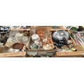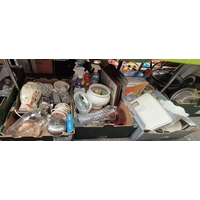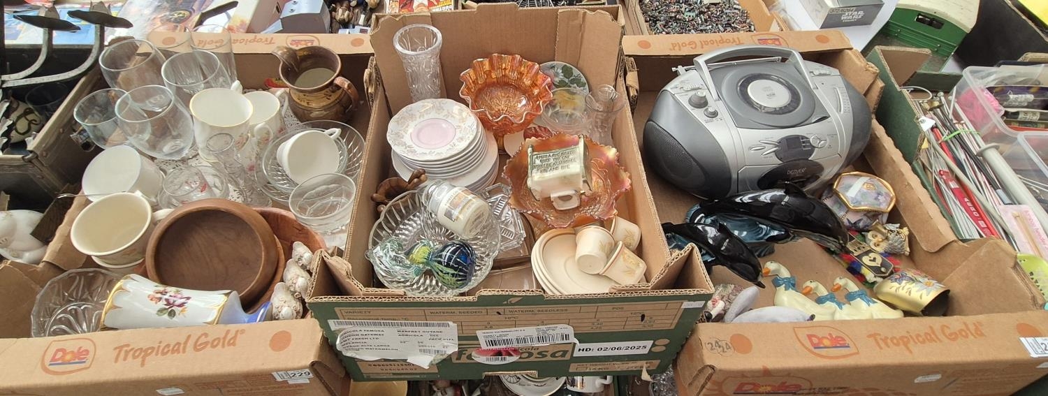 3 Boxes containing carnival glass, Poole dolphins, assorted glass and ceramics etc