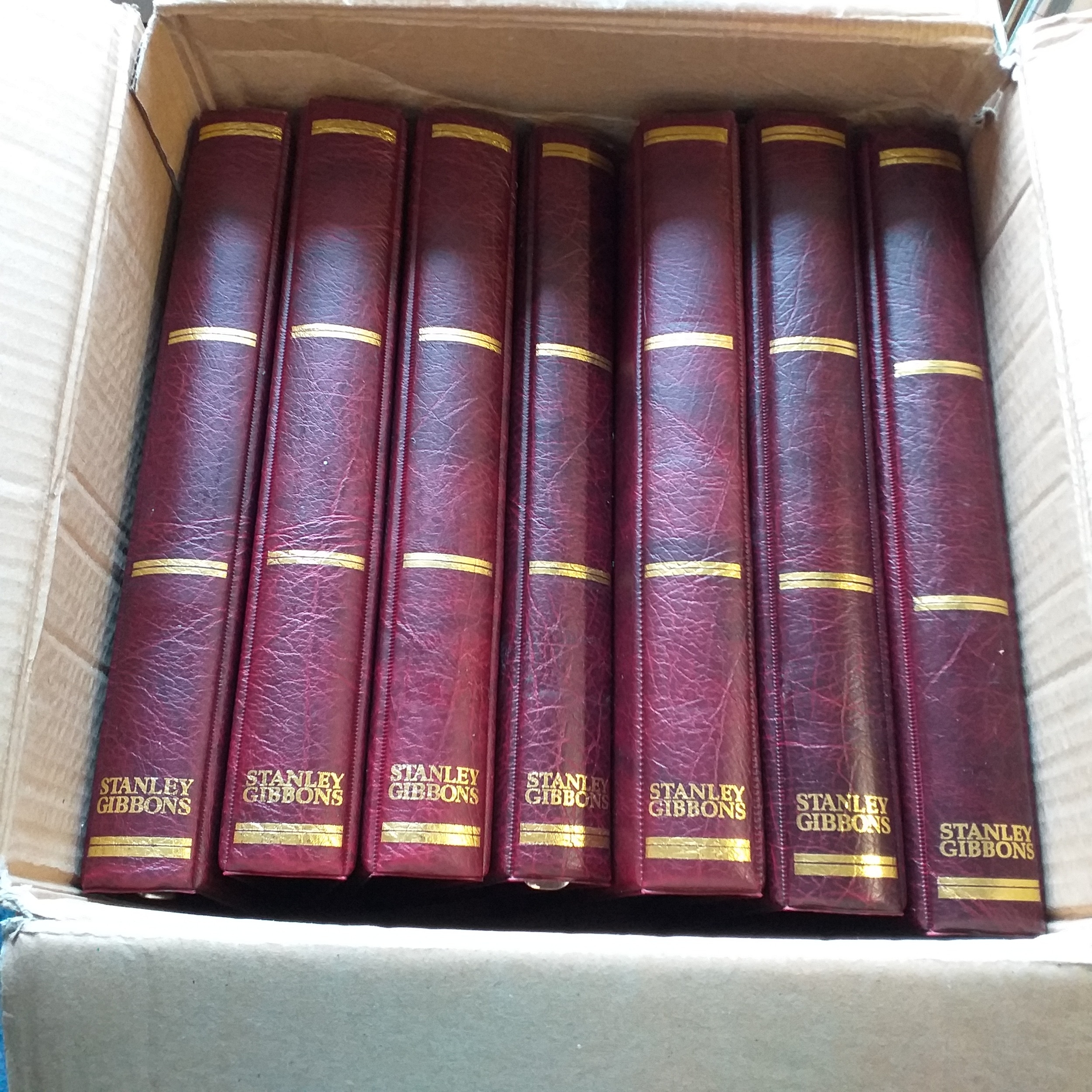 Box contains 7 Stanley Gibbons Maroon 4 Ring Binders ? no leaves. All in excellent condition.