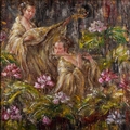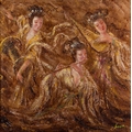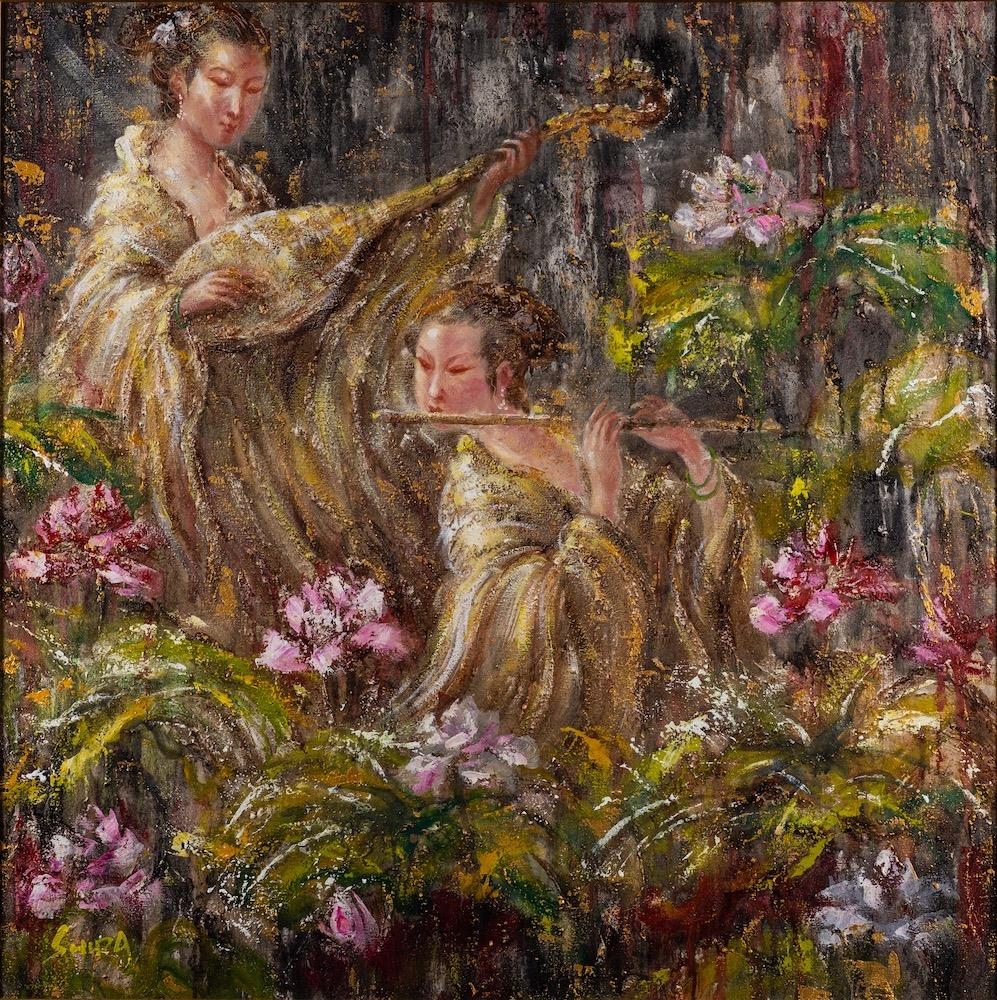 Shida Xue (Chinese, 20th Century) Three Paintings portraying Women; subject matters include Musical Instruments and Interiors Mixed Media including Oil paint and Gesso on Canvas All 98 x 98 cm All signed either lower left or lower right