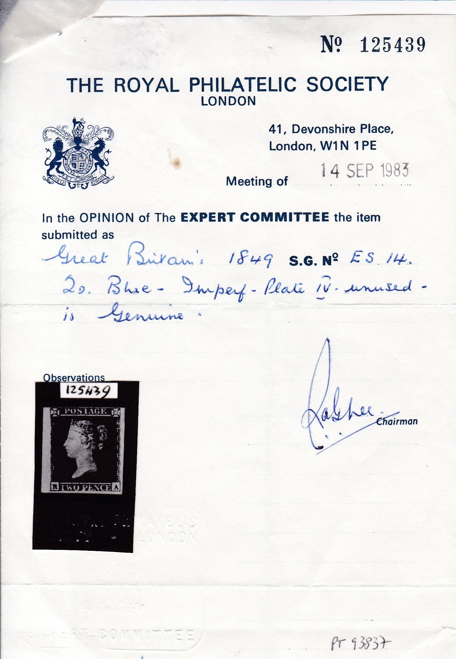 1849 2d Blue SG14 RA outstanding mint, four large to jumbo margins, OG, RPS Cert. GEM.