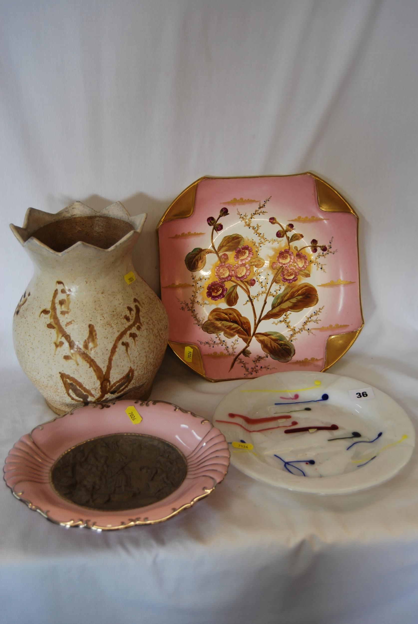 STUDIO POTTERY VASE, PLATE & 2 PLAQUES