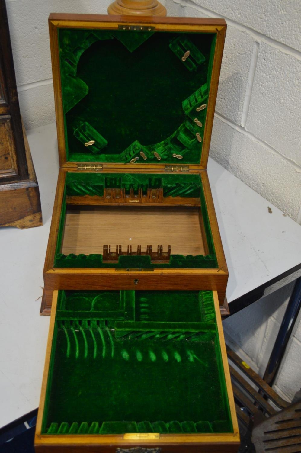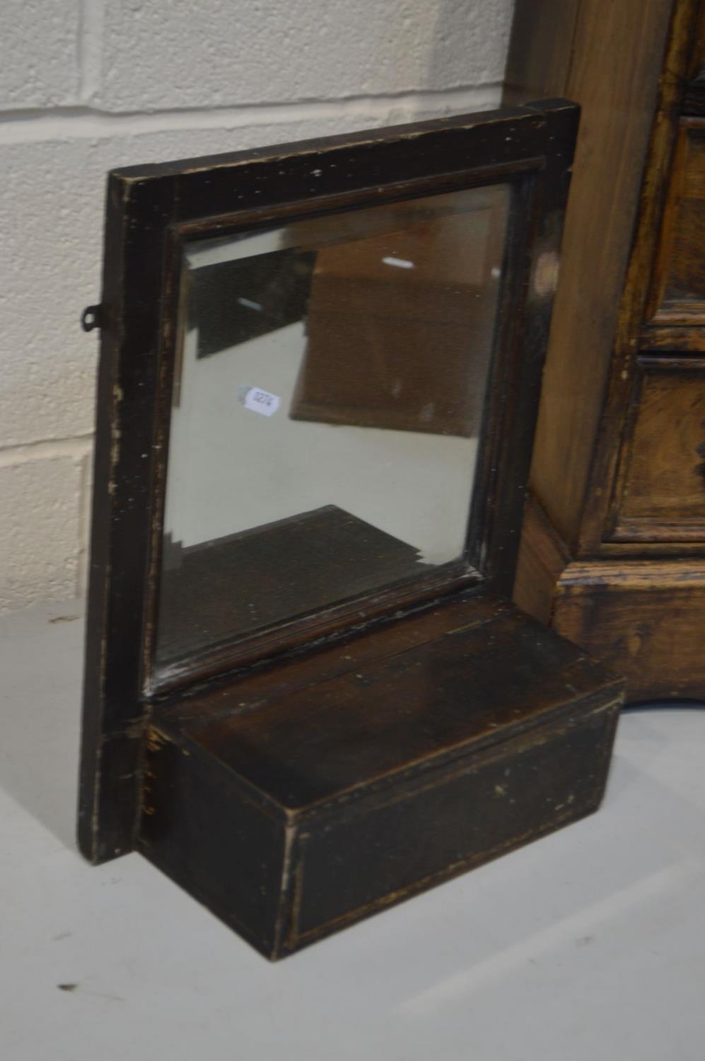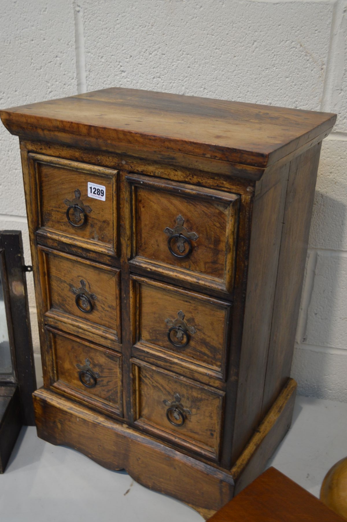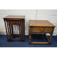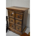 A HARDWOOD CHEST OF SIX DRAWERS, width 42cm x depth 29cm x height 63cm together with a golden oak cutlery cabinet, toilet mirror and a beech barley twist torchere stand (4)