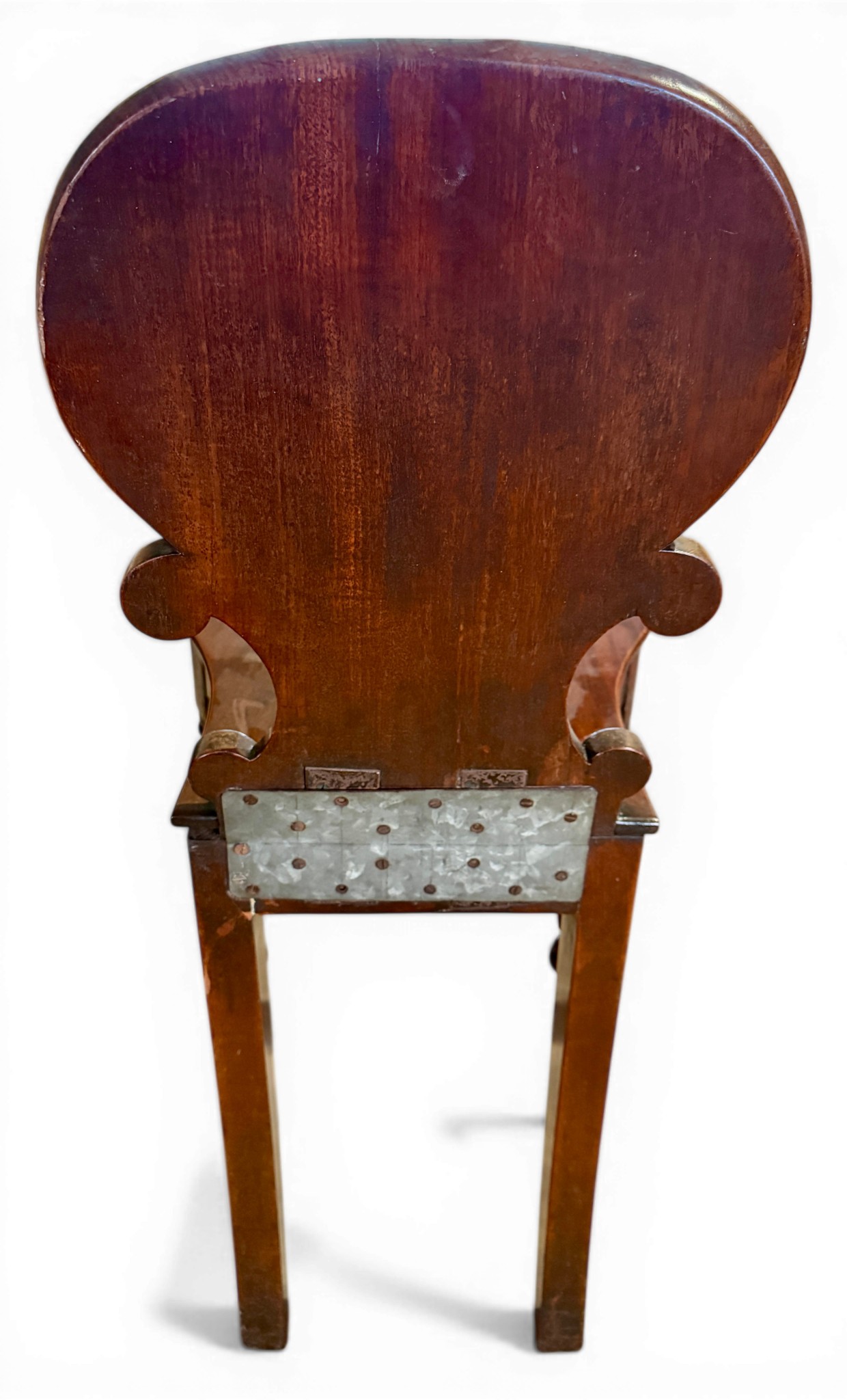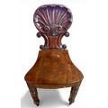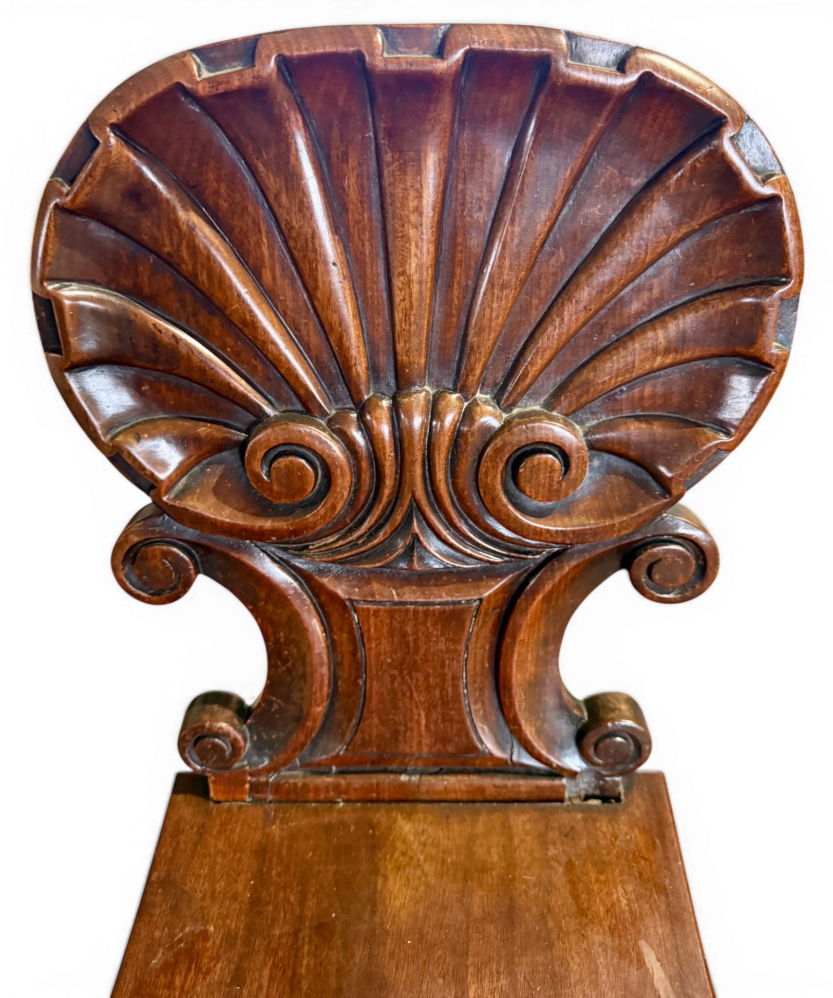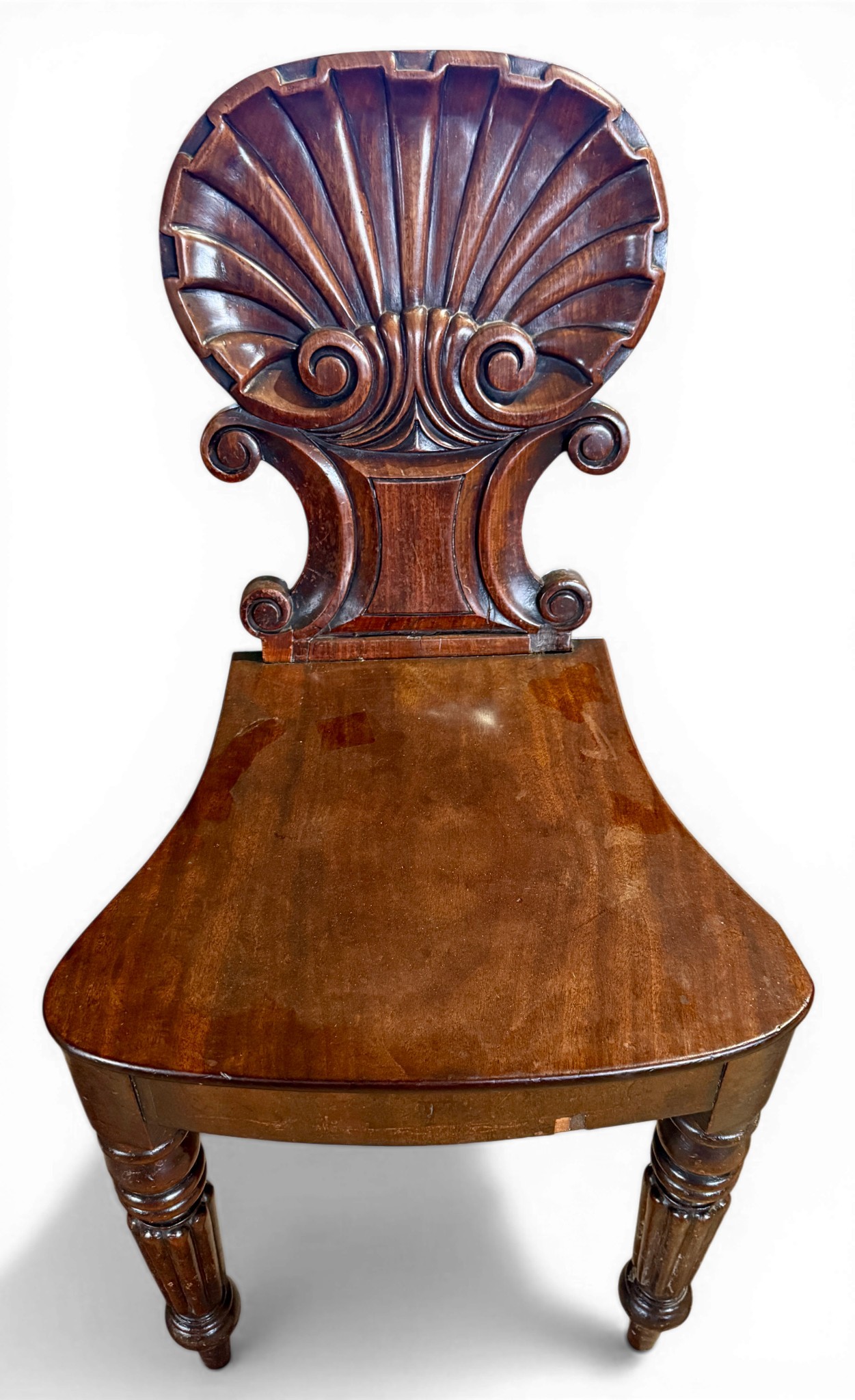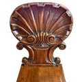 A 19thC mahogany hall chair with shell shaped back. Height to back 83cm.