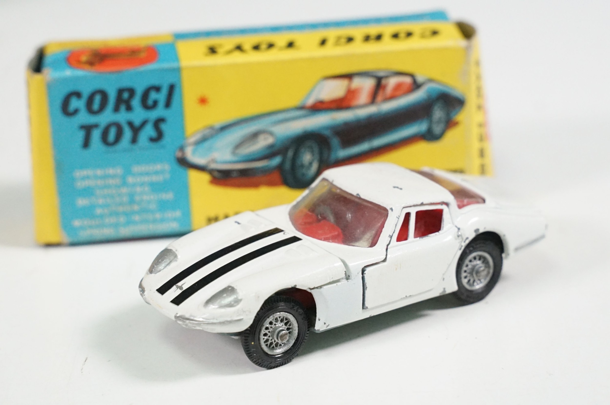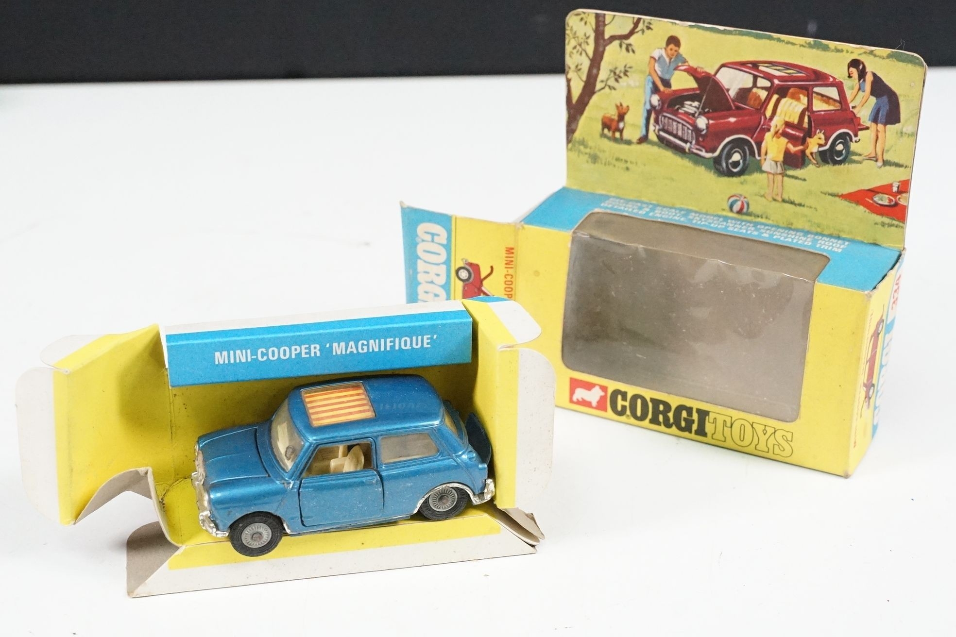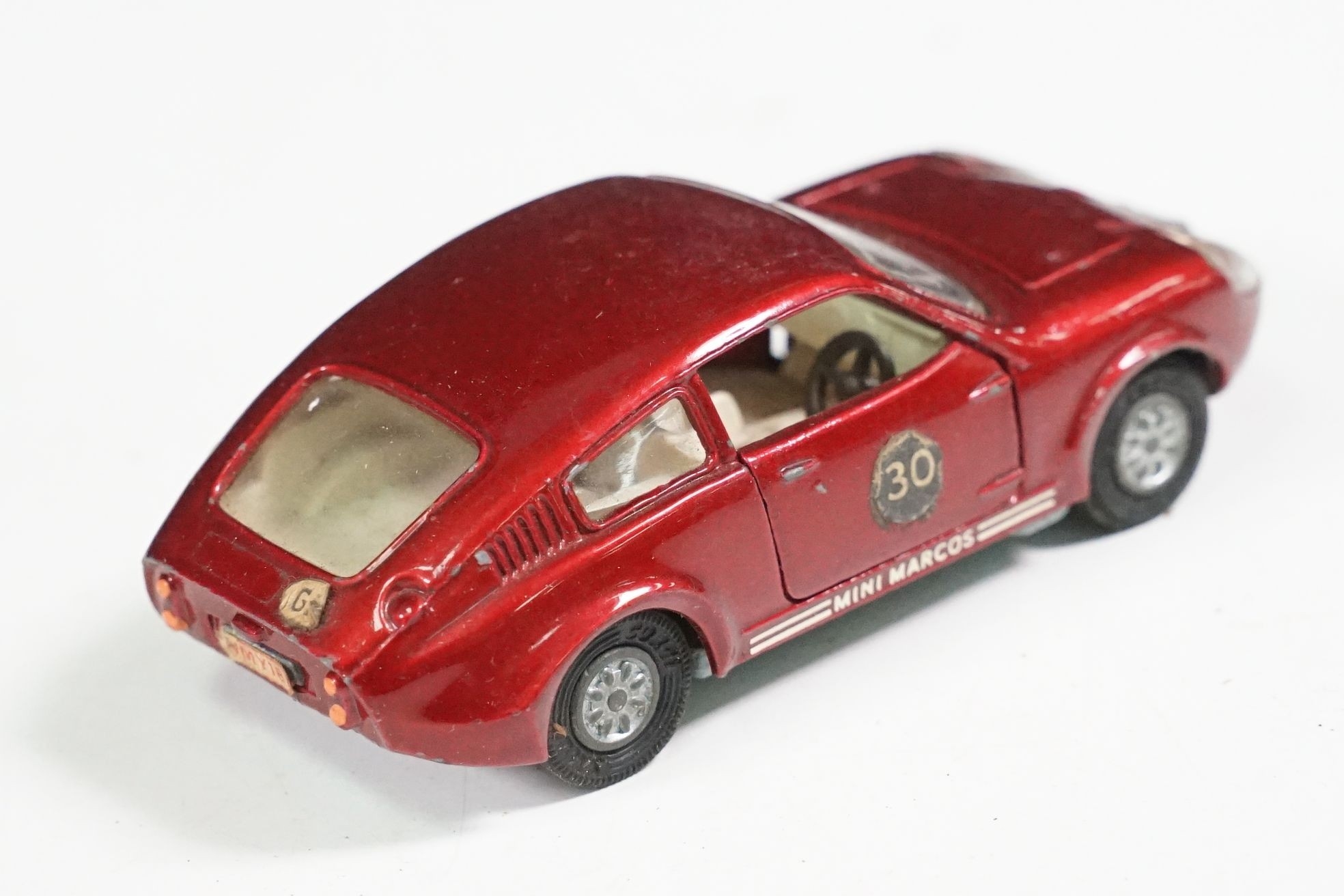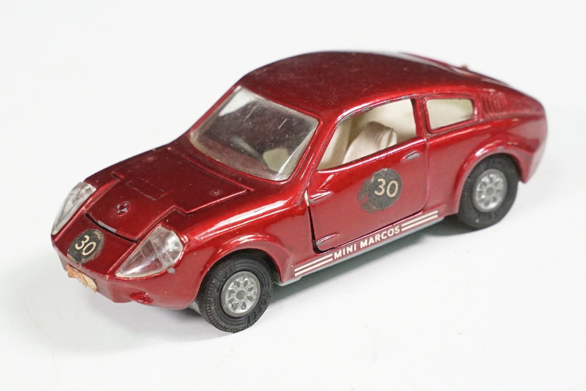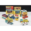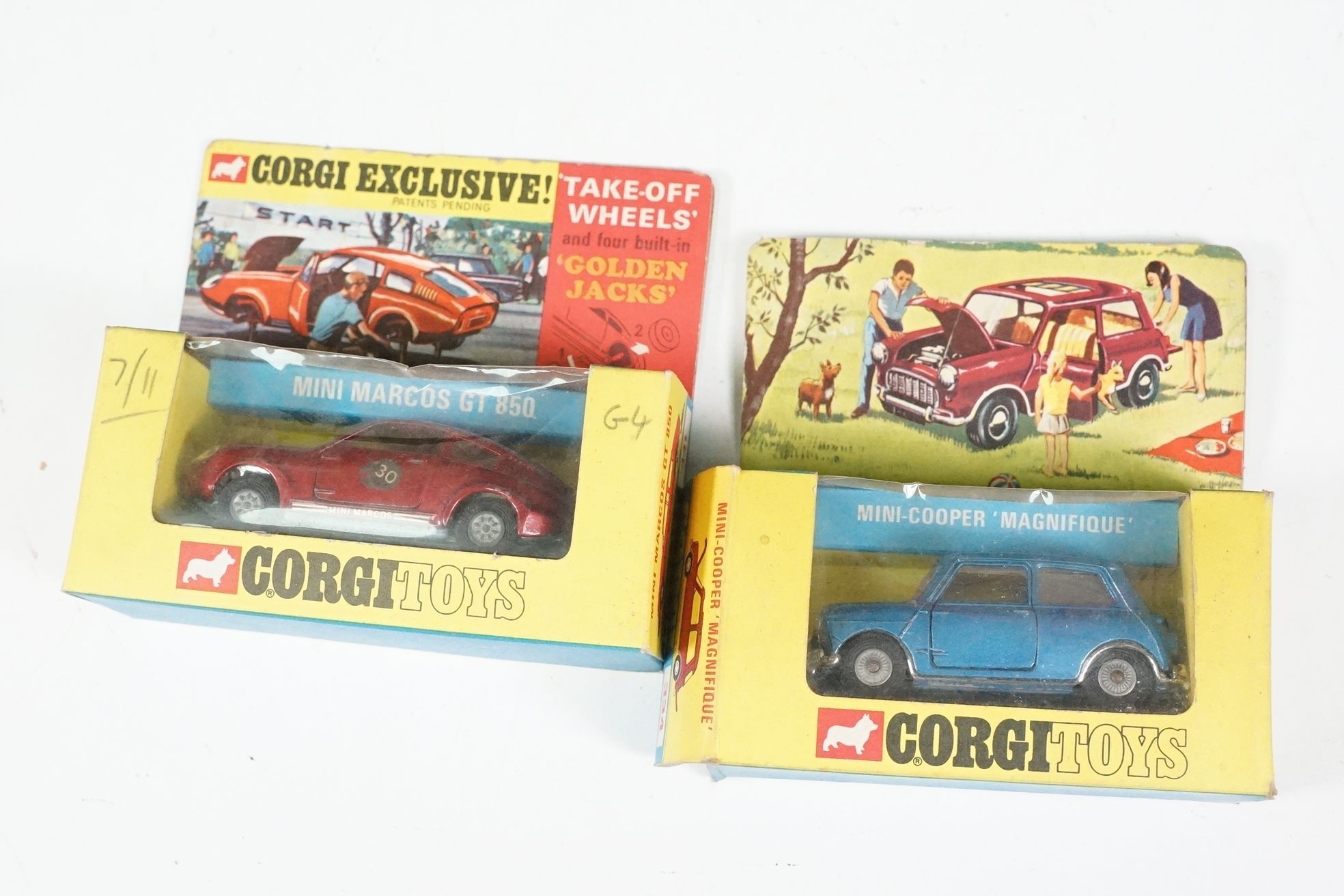 Nine boxed mid 20th C diecast models to include 6 x Corgi featuring 334 Mini Cooper Magnifique, 341 Mini Marcos GT 850, 319 Lotus Elan S2, 314 Ferrari Berlinetta, 231 Triumph Herald Coupe and 324 Marcos 1800 GT with Volvo engine and 3 x Dinky to include 165 Ford Capri in purple, 218 Lotus Europa in main body yellow and 344 Land Rover in blue, showing play wear with some previous rivet removal, boxes fair overall